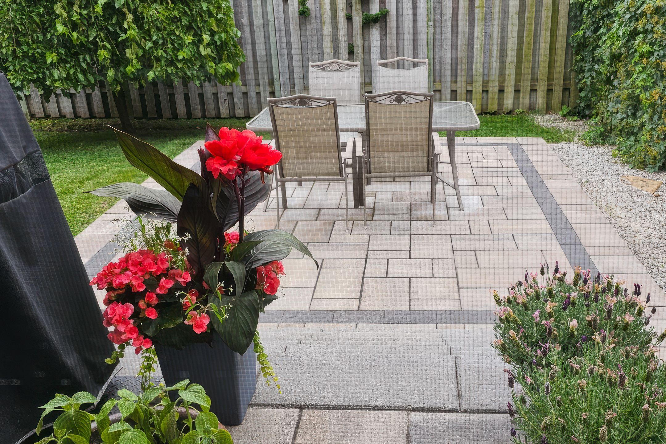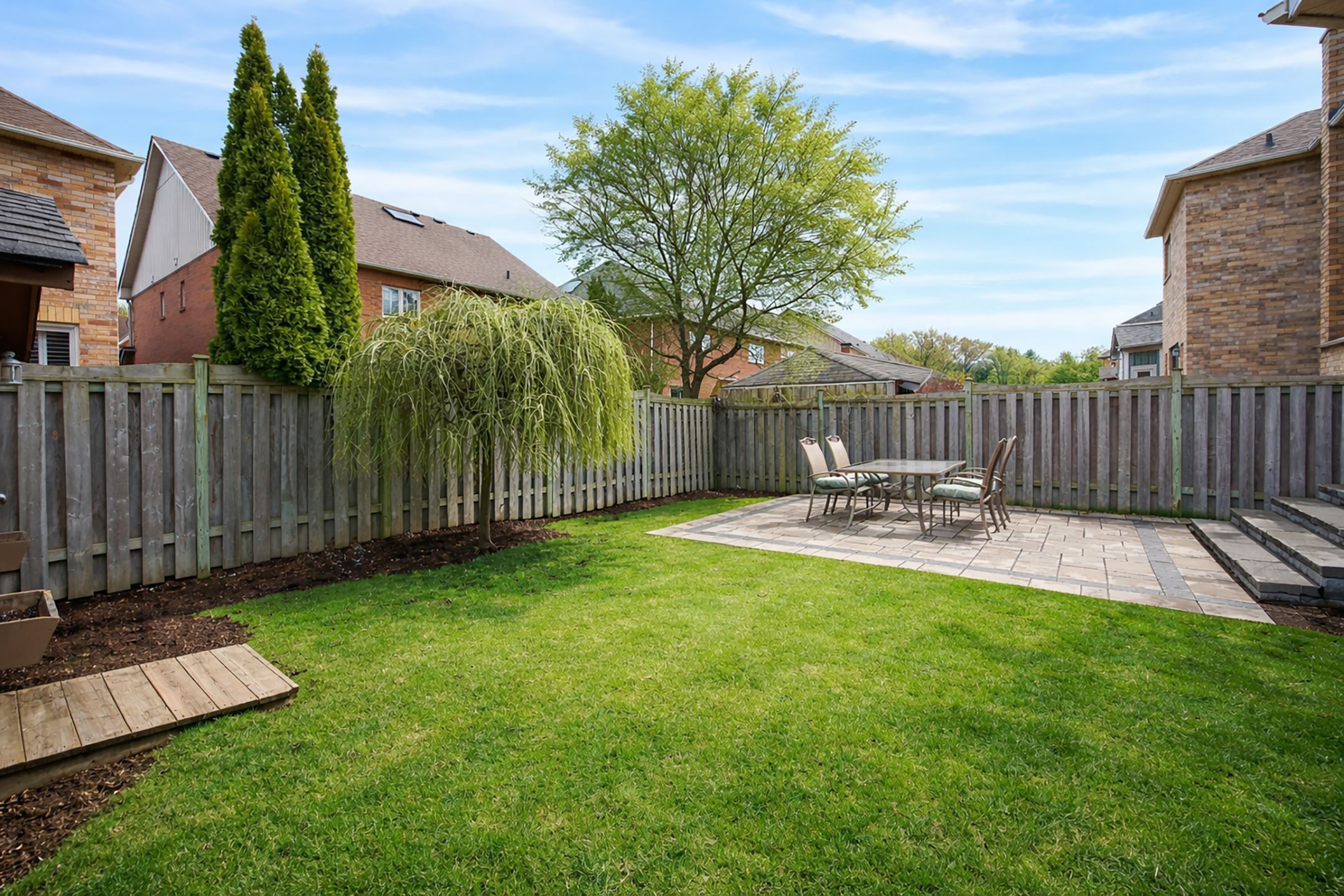 • Private backyard with interlocking patio and storage shed.