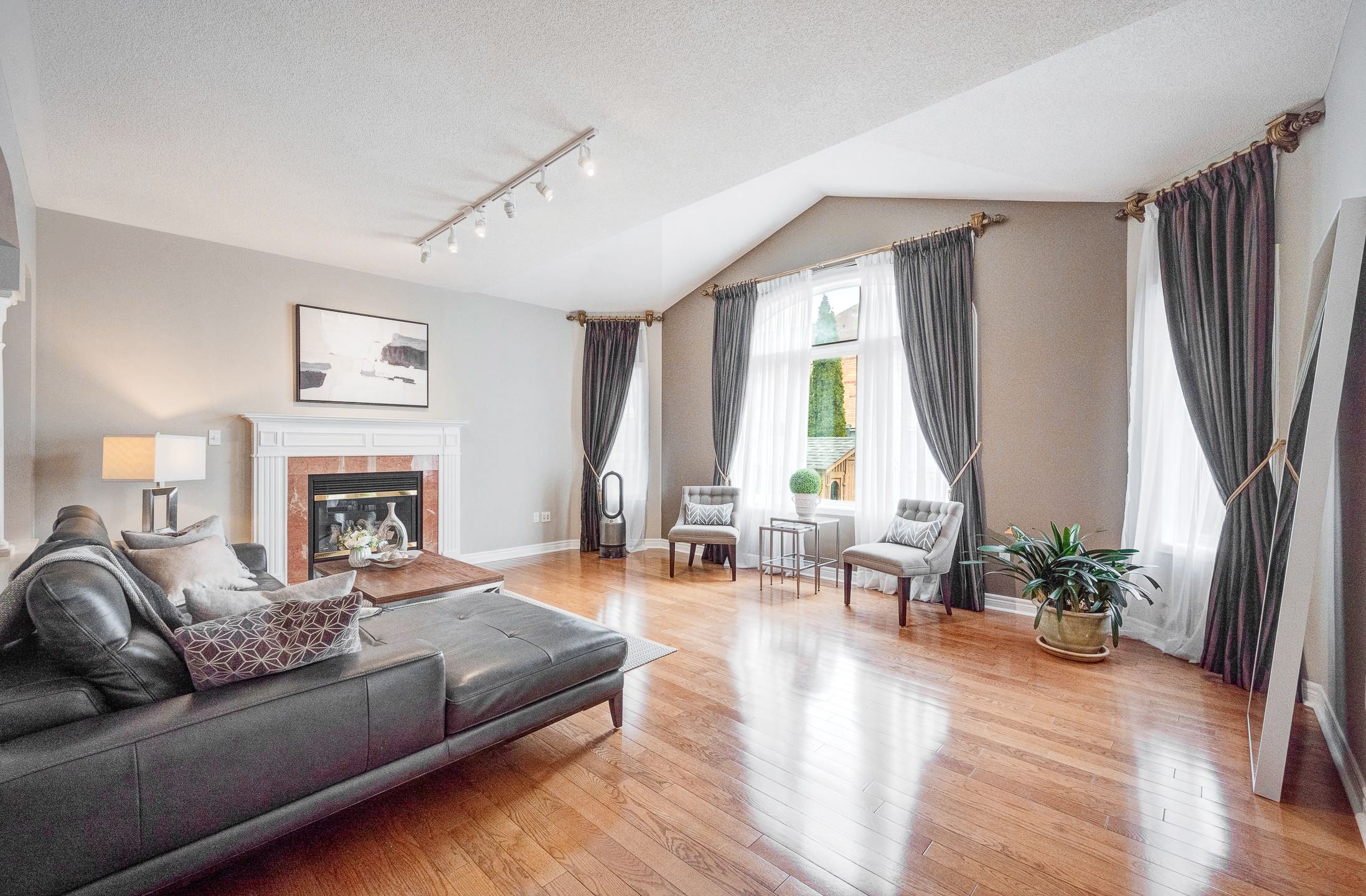 • Bright open-concept main floor with double-height ceilings and gas fireplace.