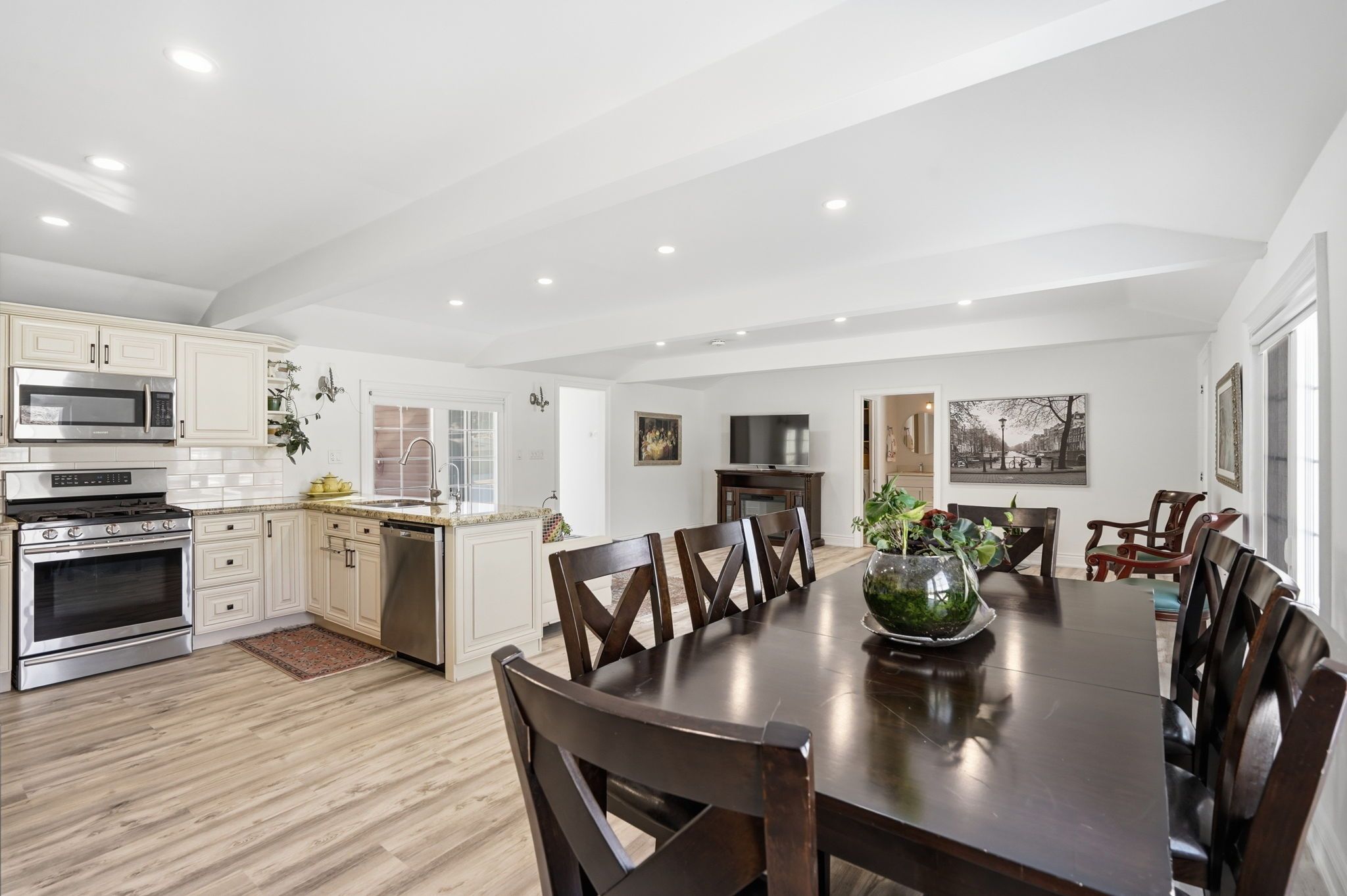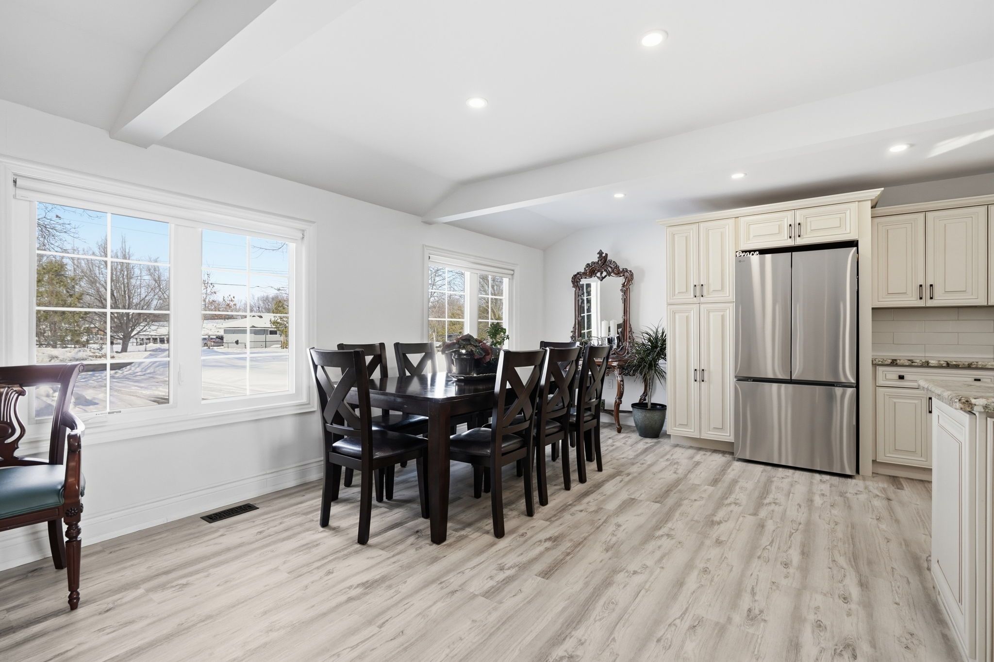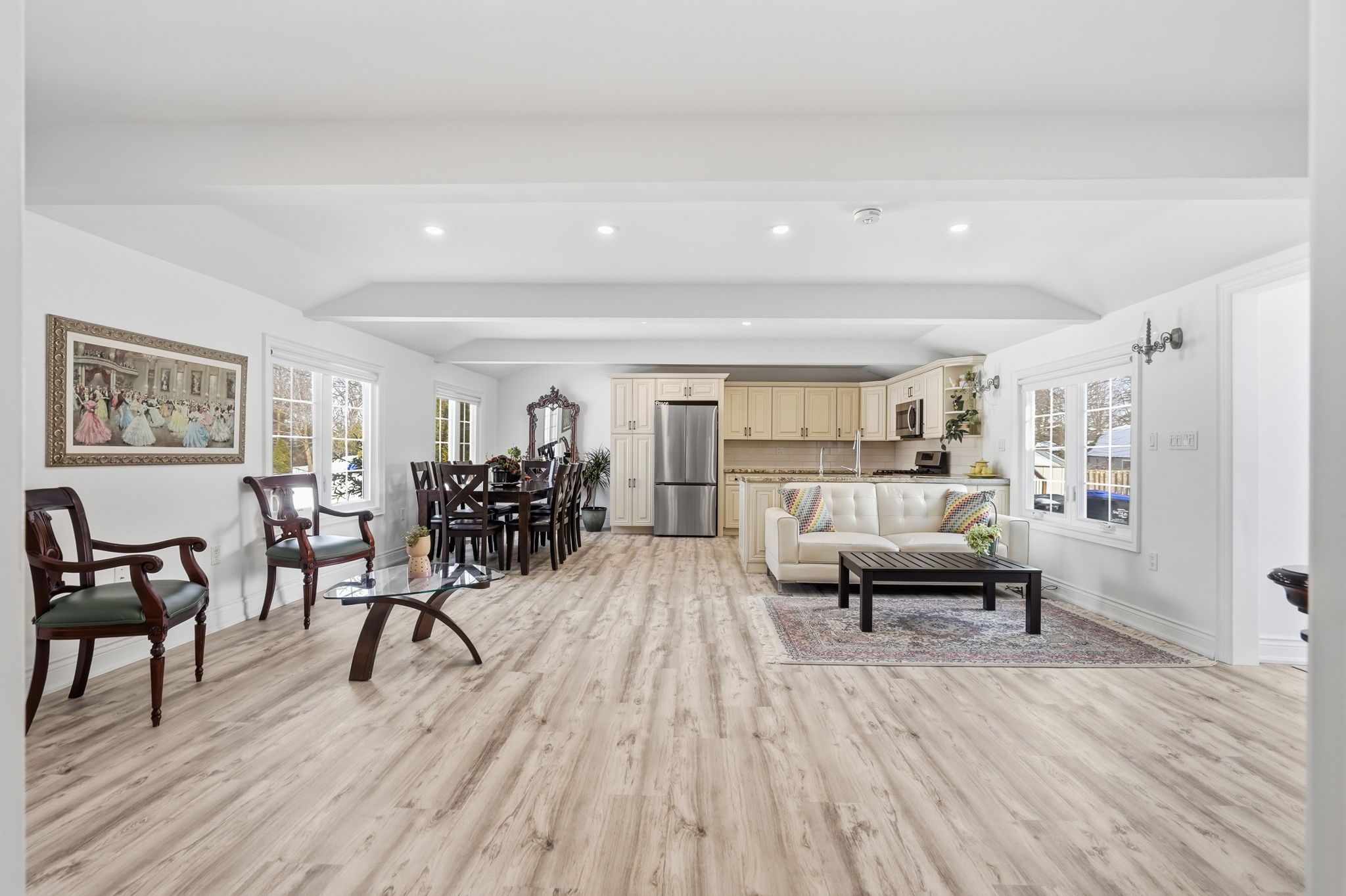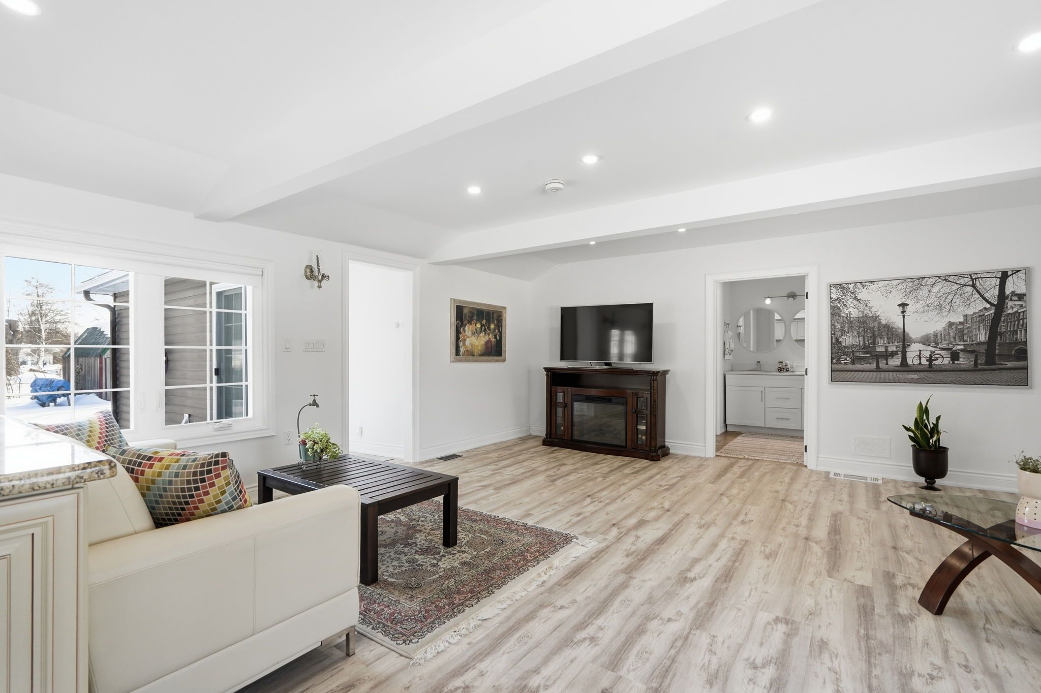 Imagine waking up steps from the lake and strolling across the street to the marina for your morning coffee. Welcome to this beautifully renovated 1,119 sq ft bungalow in the desirable community of gilford, where lakeside living meets modern comfort. Perfectly located just minutes to hwy 400 yet tucked in a quiet neighborhood, this home is move-in ready and ready to welcome you. Step inside to a bright, open-concept living space filled with pot lights throughout, creating a warm and inviting atmosphere day or night. The beautifully renovated kitchen is the heart of the home, complete with stainless steel appliances, abundant cabinetry, and seamless flow into the living area - perfect for entertaining or cozy nights in. The home features two spacious bedrooms, including a primary retreat with walkout access to your private backyard. The spa-inspired bathroom boasts a double vanity and a separate area with a rainfall shower, combining function with everyday luxury. Meticulously maintained, the home offers tons of built-in cabinetry and smart storage throughout, reflecting true pride of ownership. Outside, a large driveway with ample parking and a private backyard provide the perfect setting for summer evenings, weekend barbecues, or just unwinding after a day on the water. Whether you're searching for a year-round residence or a weekend lakeside escape, this gilford bungalow isn't just a home - it's a lifestyle.