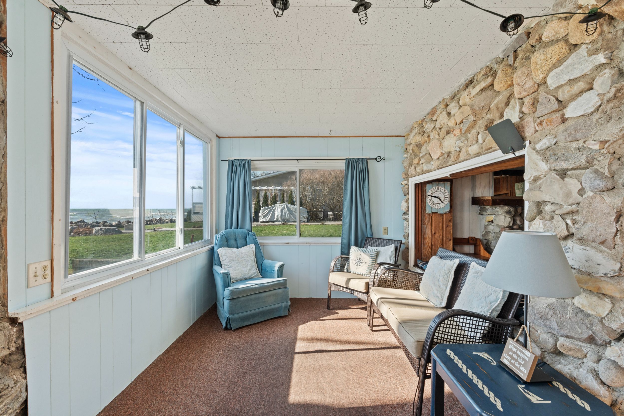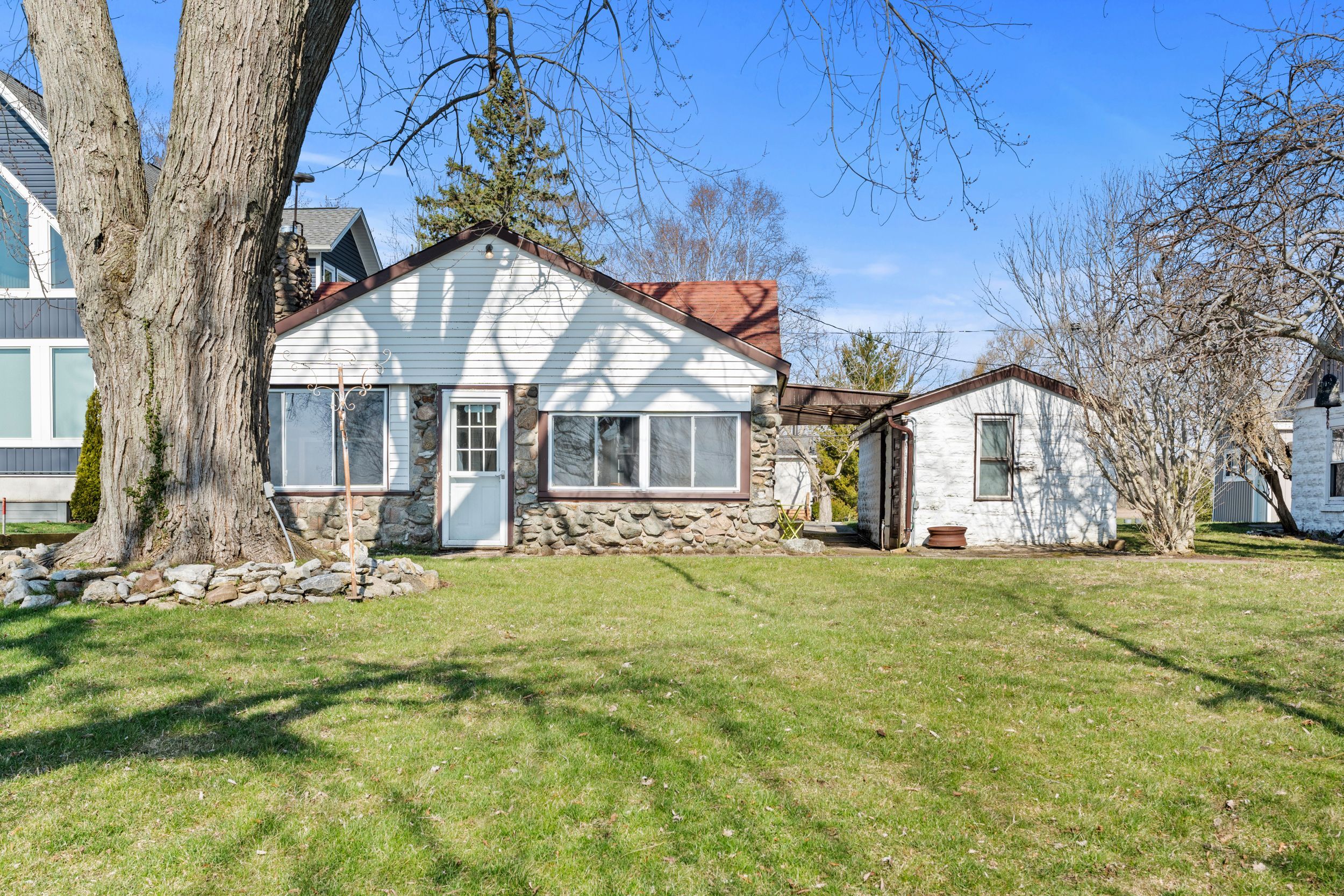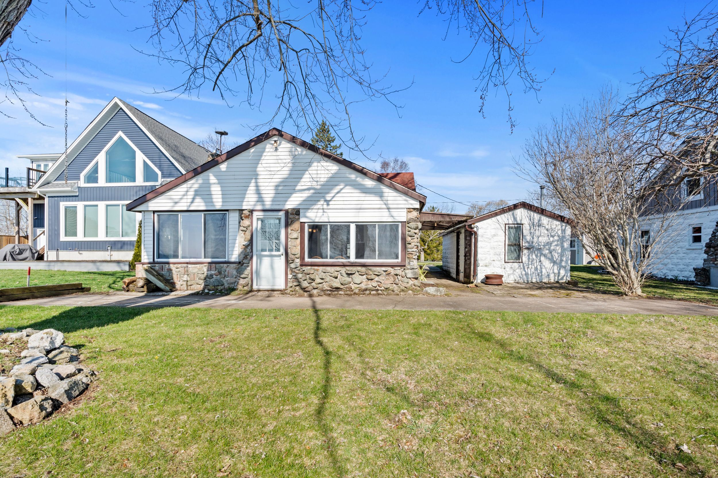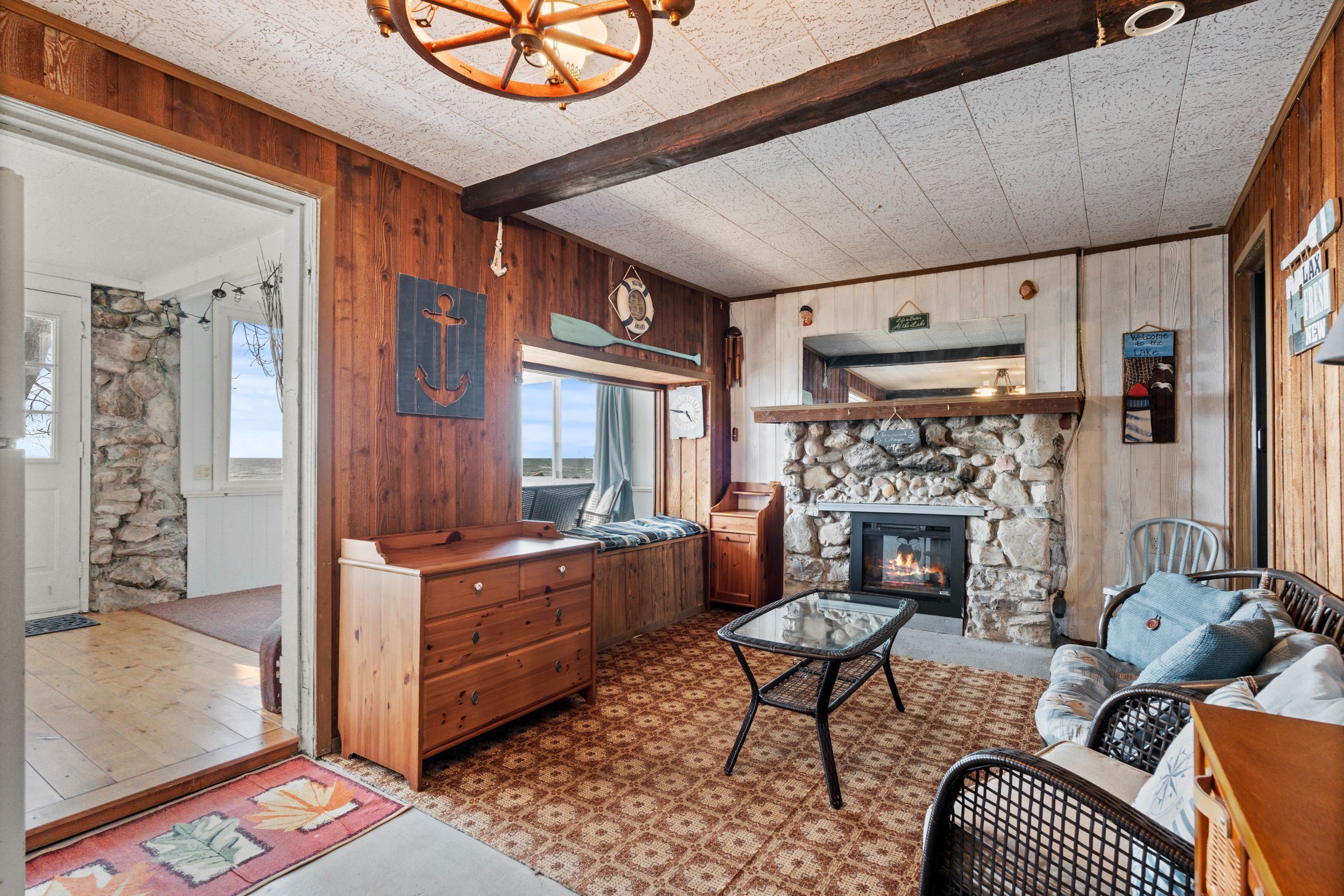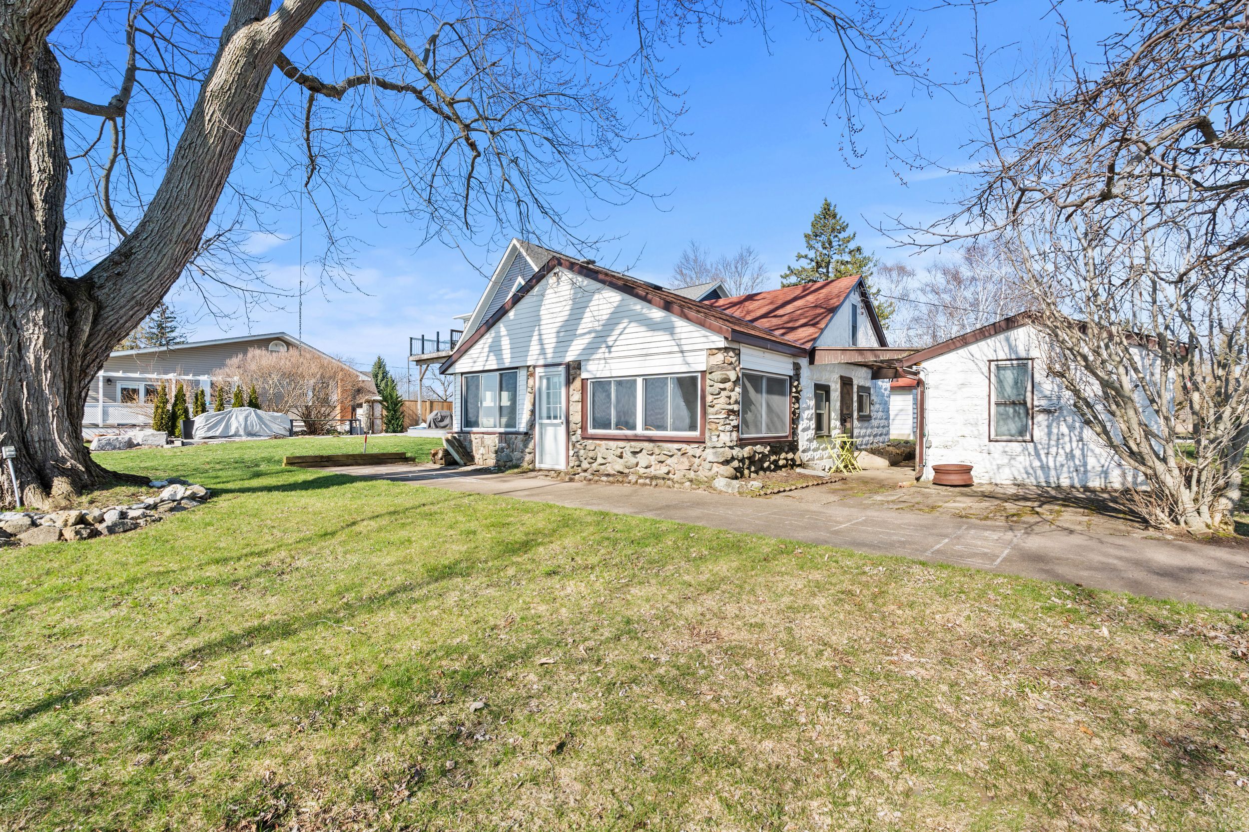 Have you ever dreamed of owning a waterfront property but felt it was out of reach? This is now your opportunity. Set on a quiet street surrounded by a mix of year-round homes and cottages, this unique property offers not one but two cottages on a single lot, creating incredible flexibility for personal use or hosting family and friends. The main cottage features an open concept kitchen and living area highlighted by timber beams and a beautiful stone fireplace with wood mantle. A large rear sunroom spans the back of the home, offering direct views of the water and additional space currently used as a dining area and secondary living room. This cottage is complete with two bedrooms, a three-piece bathroom and an updated electrical panel. The secondary cottage provides excellent overflow space with two additional bedrooms, an open living area with kitchenette, a one-piece bathroom and a loft above, ideal for storage or future potential. The outdoor space is what truly sets this property apart. Enjoy a wide lot overlooking lake erie, mature trees and a brand new breakwall, a major improvement and expense already completed for you. A rare added bonus is the grandfathered boat launch located directly on the property. It's not often you find a waterfront property like this at an entry-level price point. Start making memories here that will last a lifetime.
