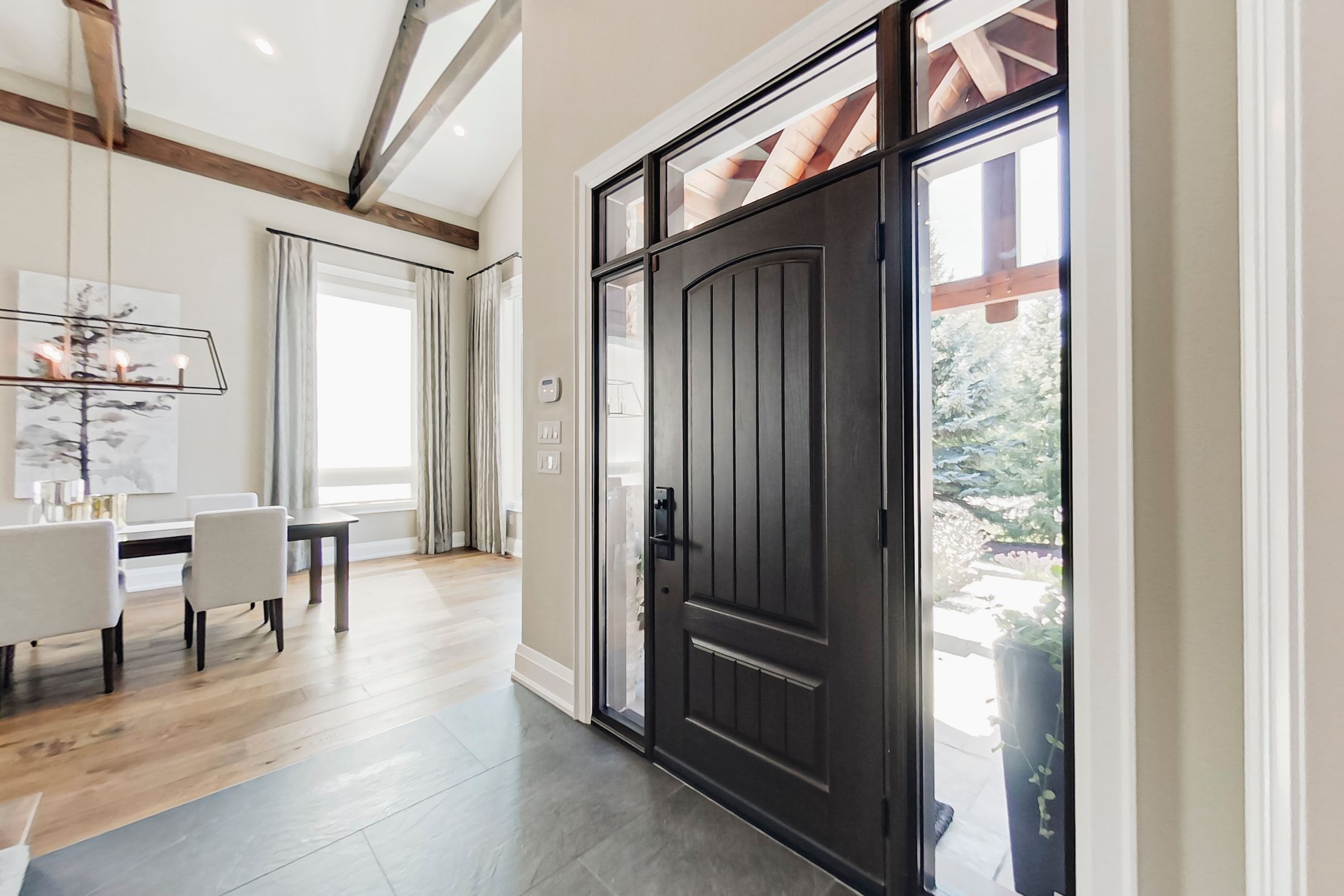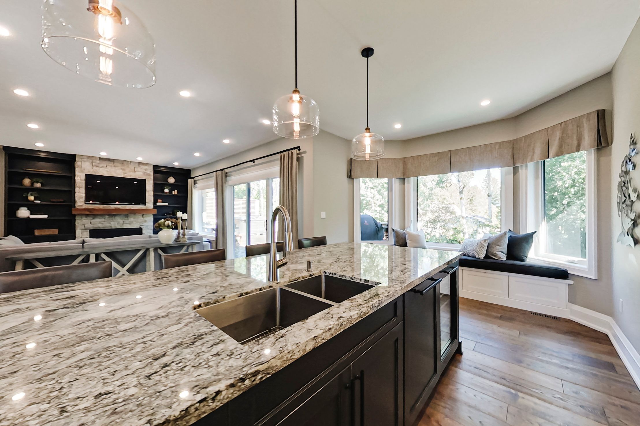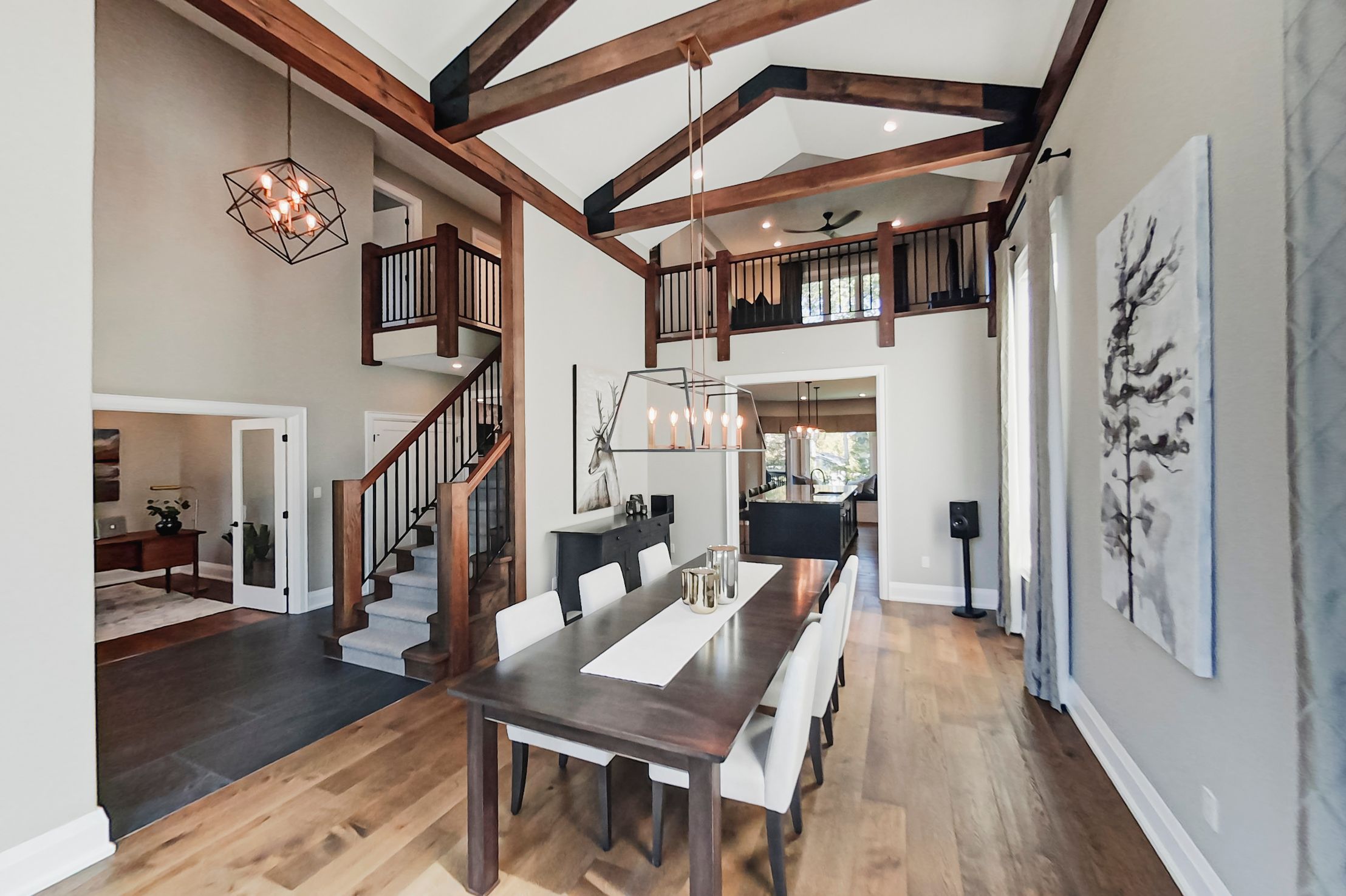 • Open concept kitchen and living area with elegant cathedral ceilings.