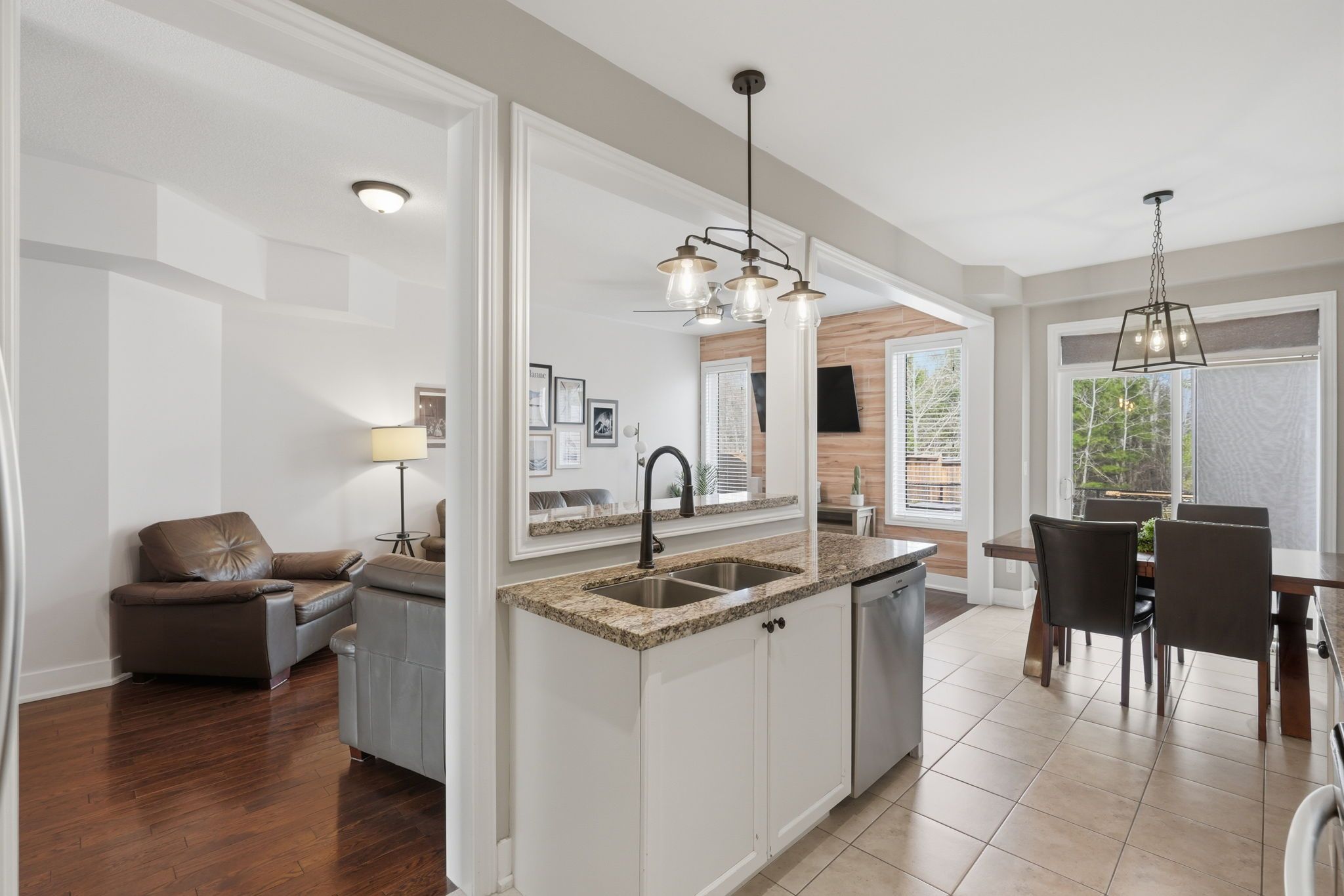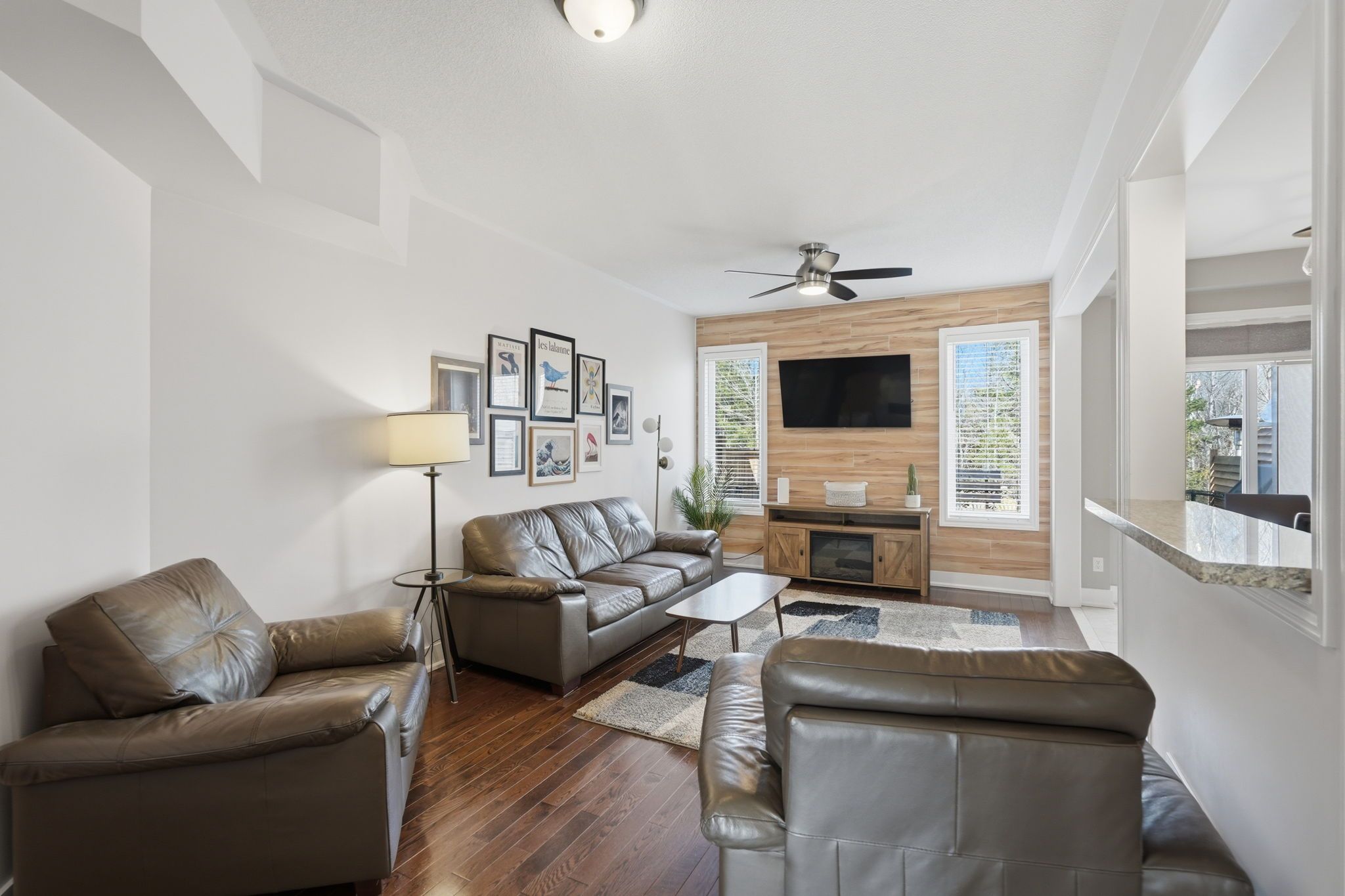 Backing onto trees with no rear neighbours, this beautifully maintained townhouse offers the perfect blend of privacy, modern finishes, and functional living in a desirable angus location. A modern foyer with upgraded tile flooring and convenient inside entry from the garage sets the tone as you step inside. The main level features 9-foot ceilings and stunning hardwood floors throughout, creating a bright and cohesive space. The open-concept layout connects the living, dining, and kitchen areas seamlessly, highlighted by a stylish feature wall in the living room. The upgraded kitchen is complete with taller cabinetry, granite countertops, and a breakfast bar, ideal for both everyday living and entertaining. The spacious dining area features a modern light fixture and a walkout to a beautifully designed deck with built-in seating, overlooking the fully fenced backyard and peaceful treed setting. Upstairs, a hardwood staircase with wrought iron spindles leads to a bright hallway with continued hardwood flooring. The upper level offers three generously sized bedrooms, including a spacious primary retreat with a walk-in closet and private ensuite. A bright 4-piece bathroom completes the second floor. The fully finished basement extends the living space with a cozy rec room featuring custom built-ins and a feature wall, along with a finished laundry room and additional storage. With a single-car garage offering backyard access, thoughtful upgrades throughout, and a quiet setting backing onto trees, this home is move-in ready and designed for comfortable, everyday living.