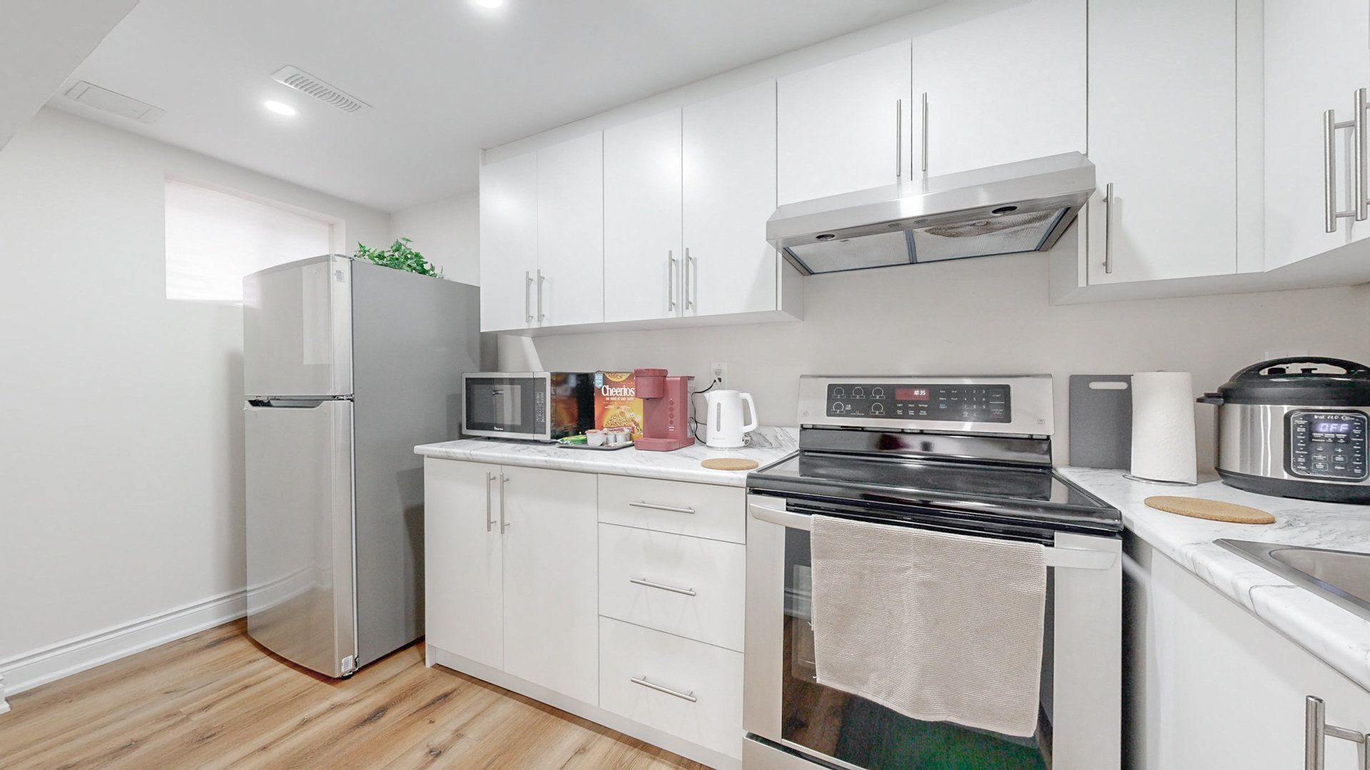 • Bright corner unit featuring large windows and modern pot lights.