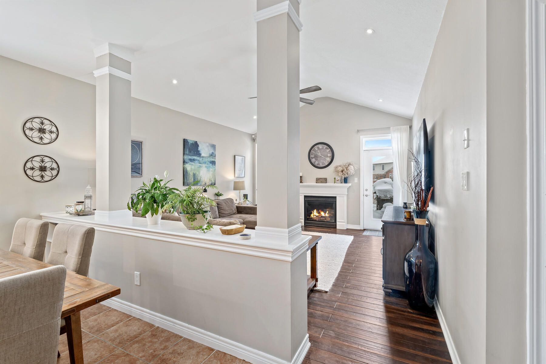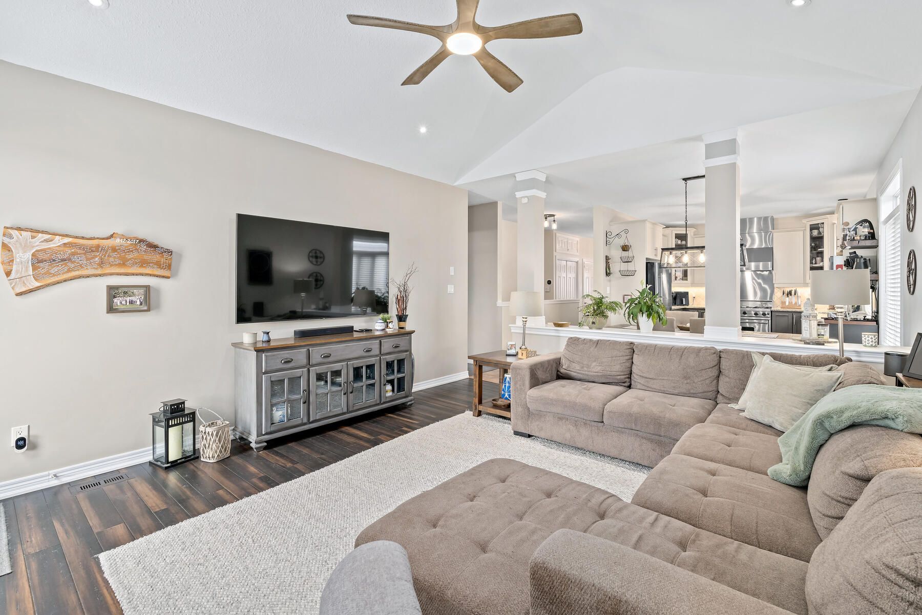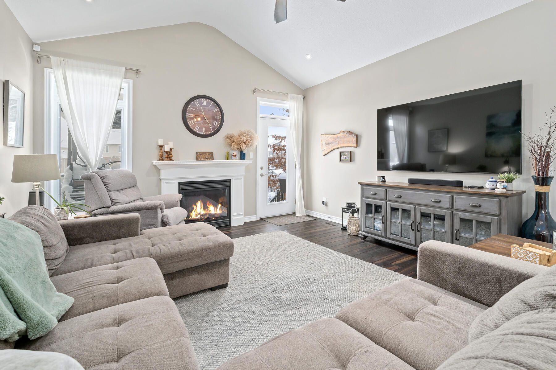 • Bright open-concept main floor features a vaulted great room and large windows.