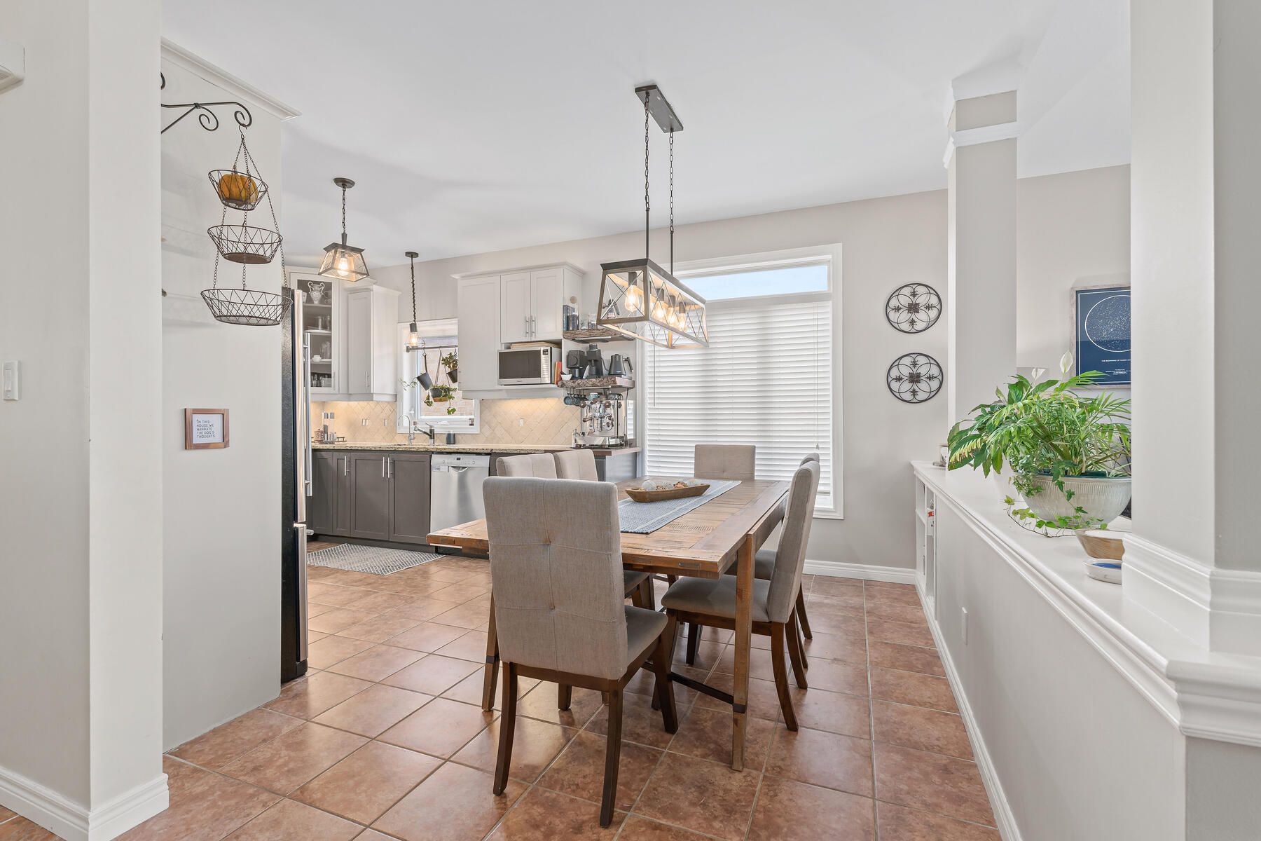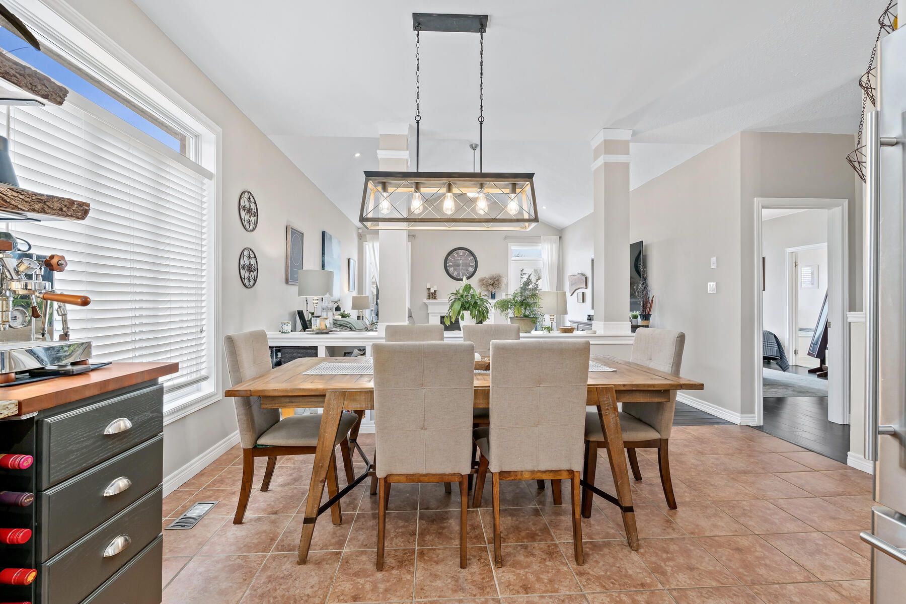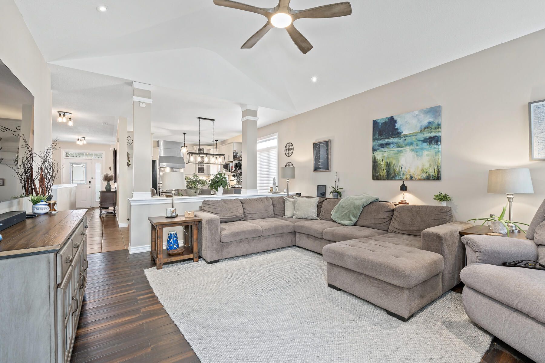 • Bright open-concept main floor features a vaulted great room and large windows.