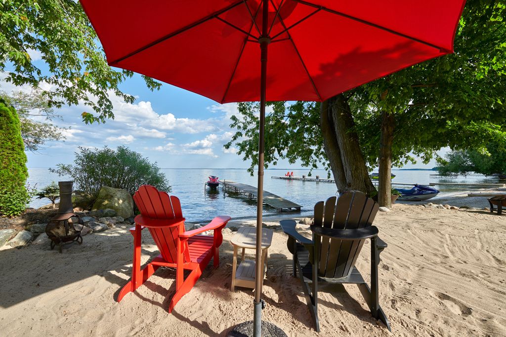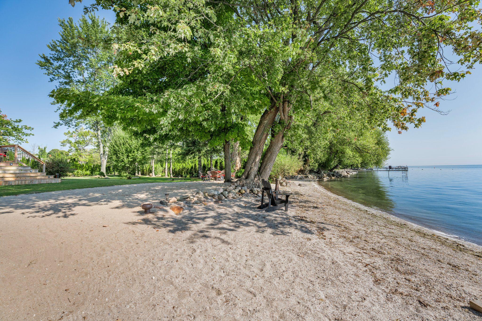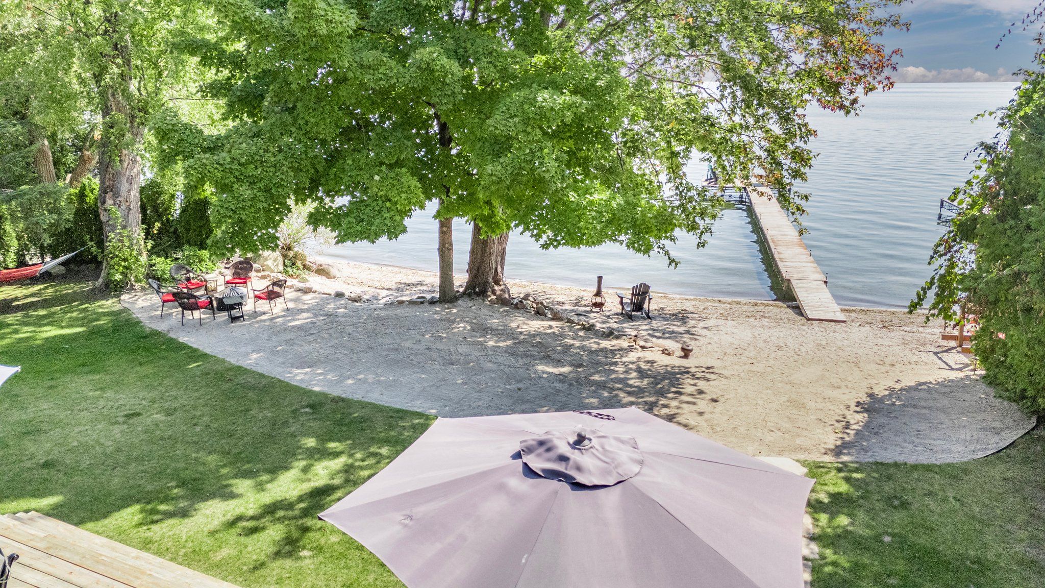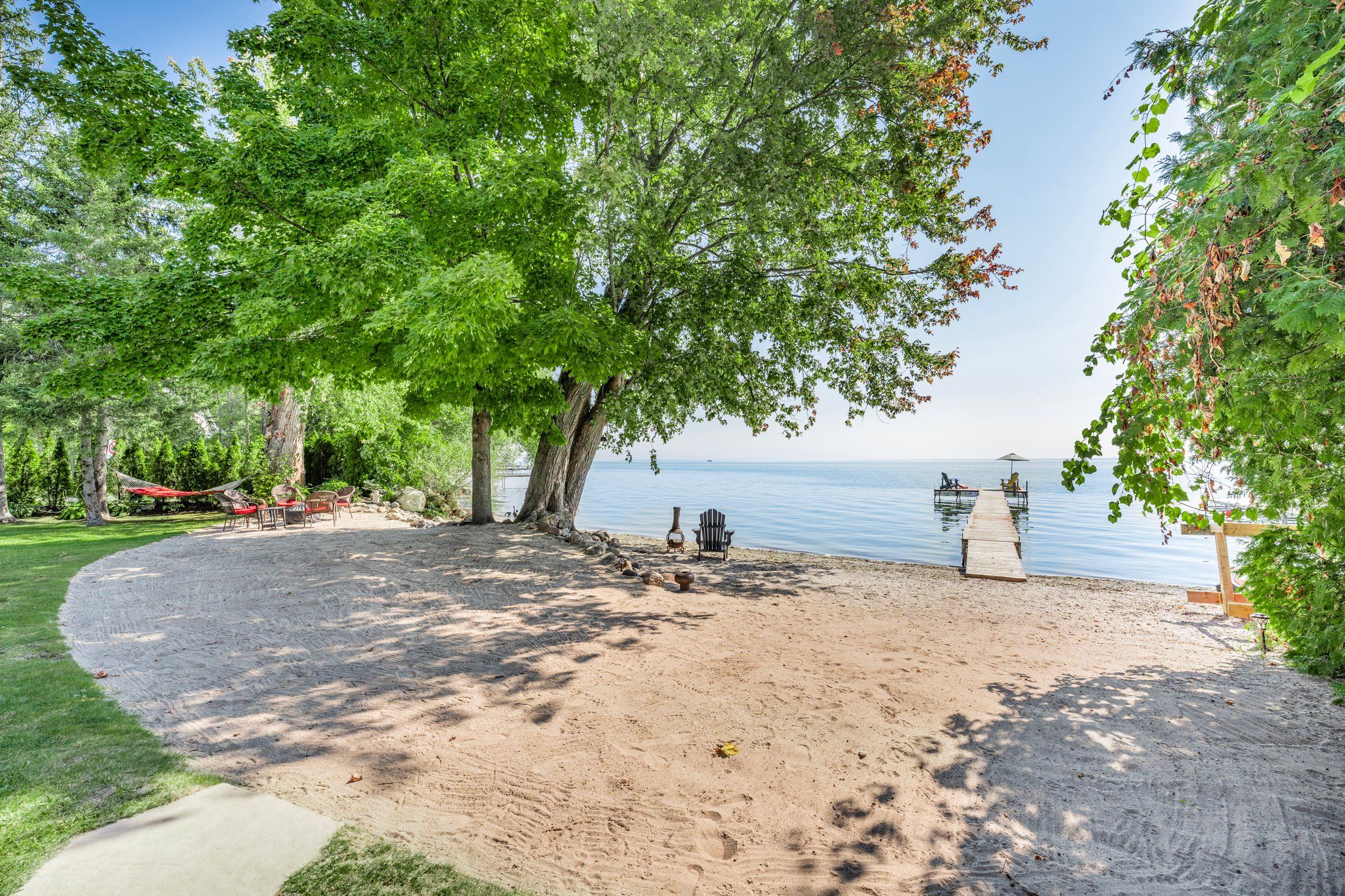 • 85 feet of sandy beach and a large dock for entertaining.