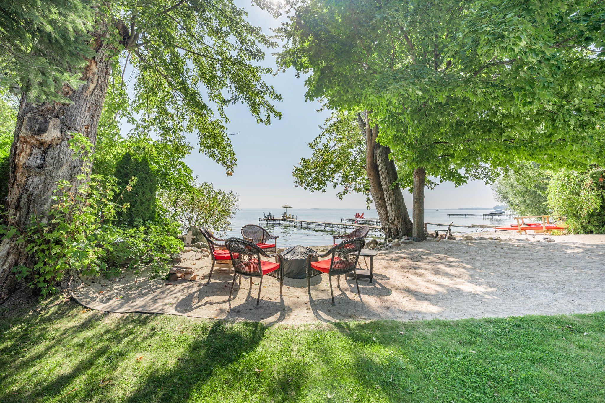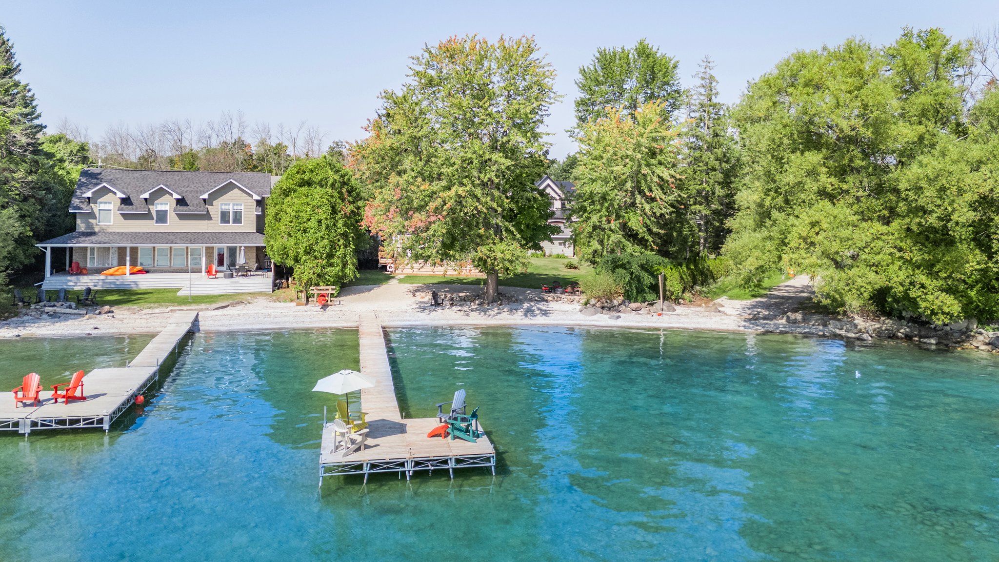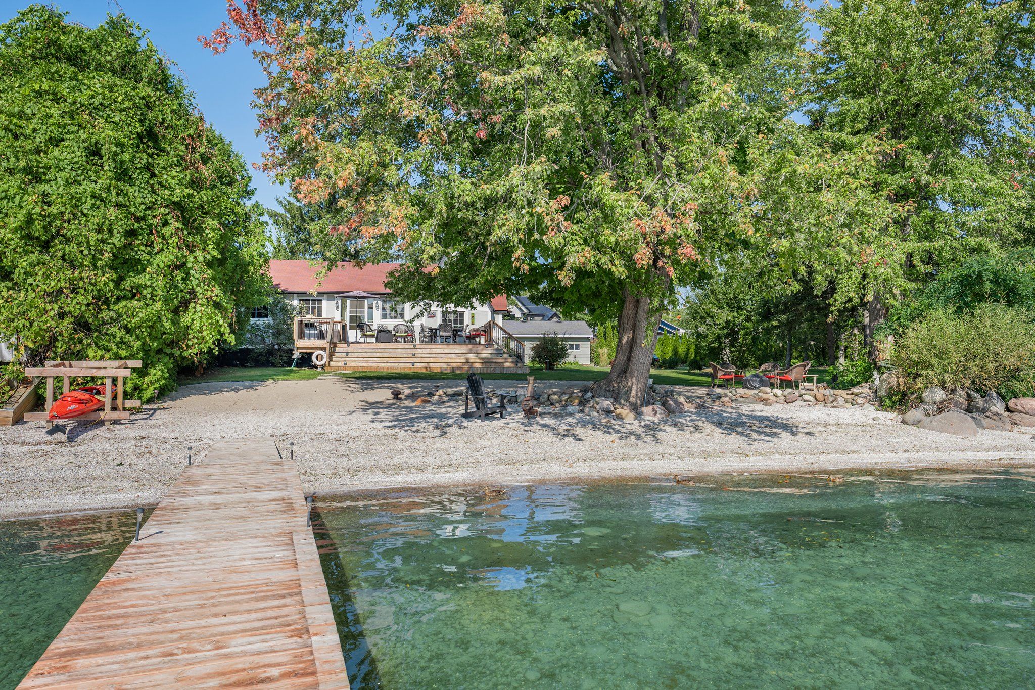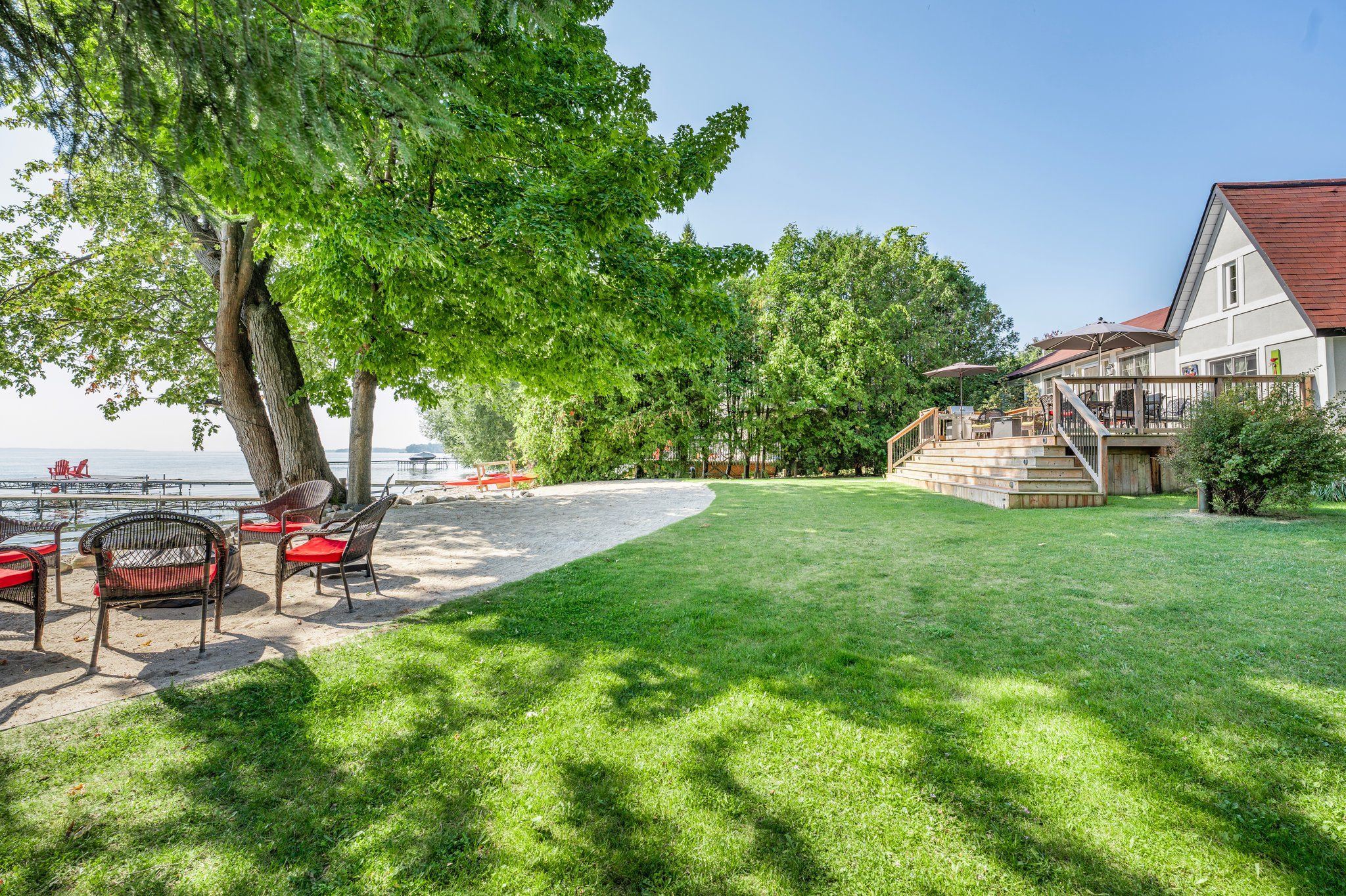 • 85 feet of sandy beach and a large dock for entertaining.