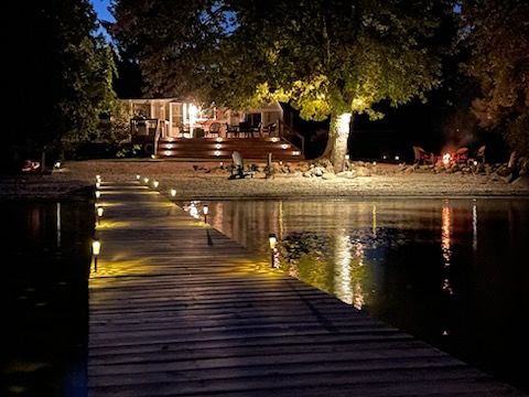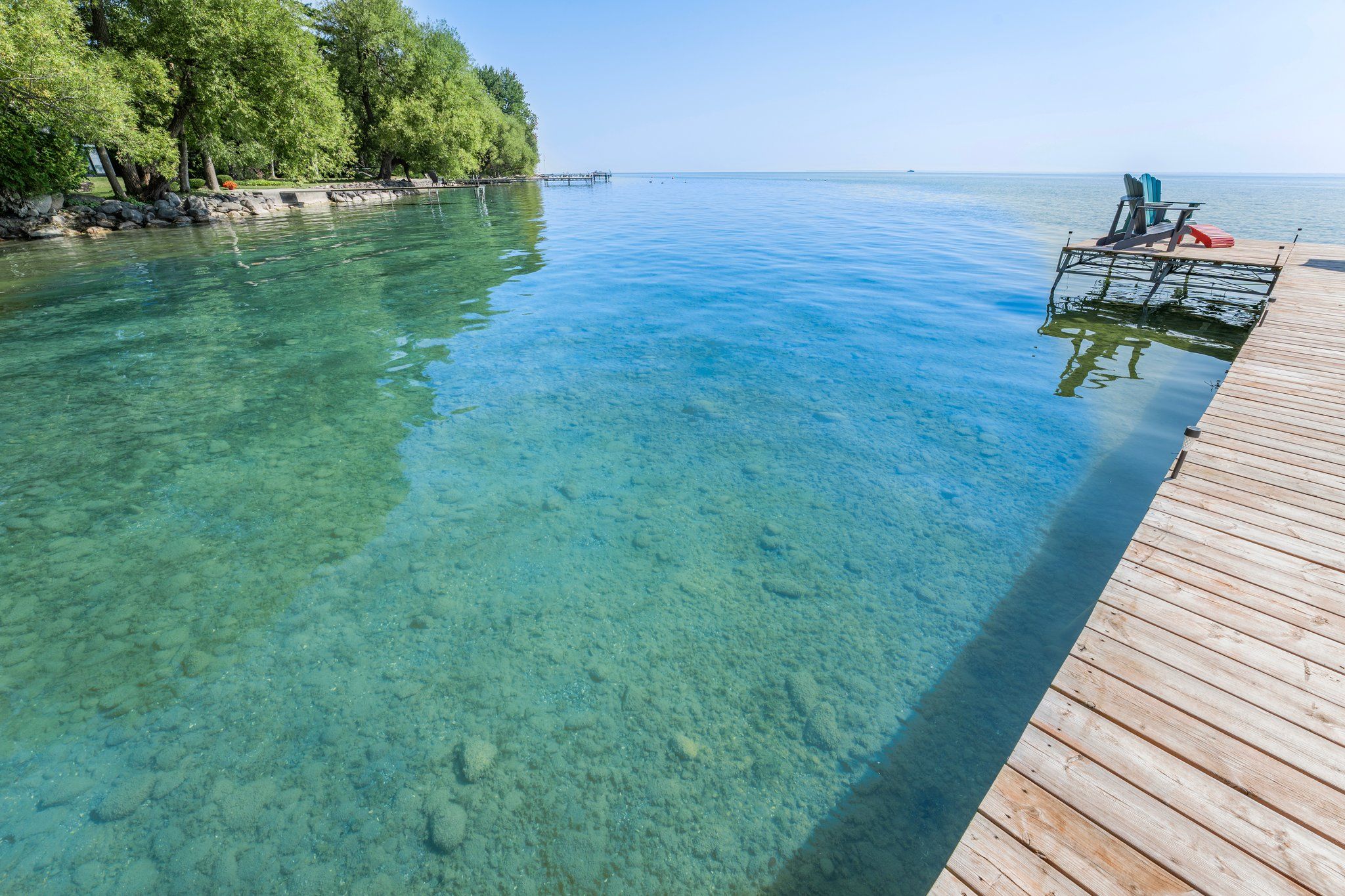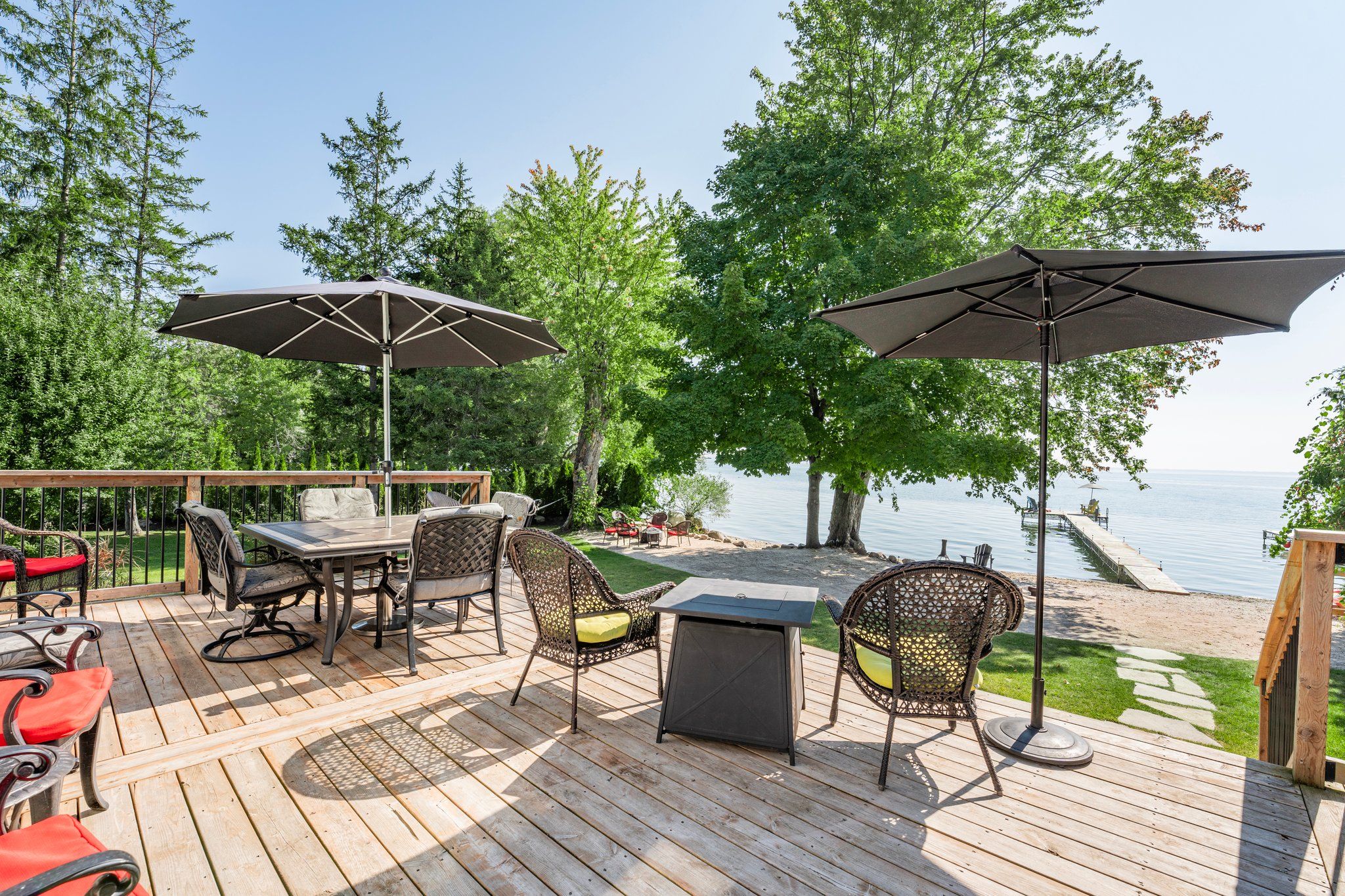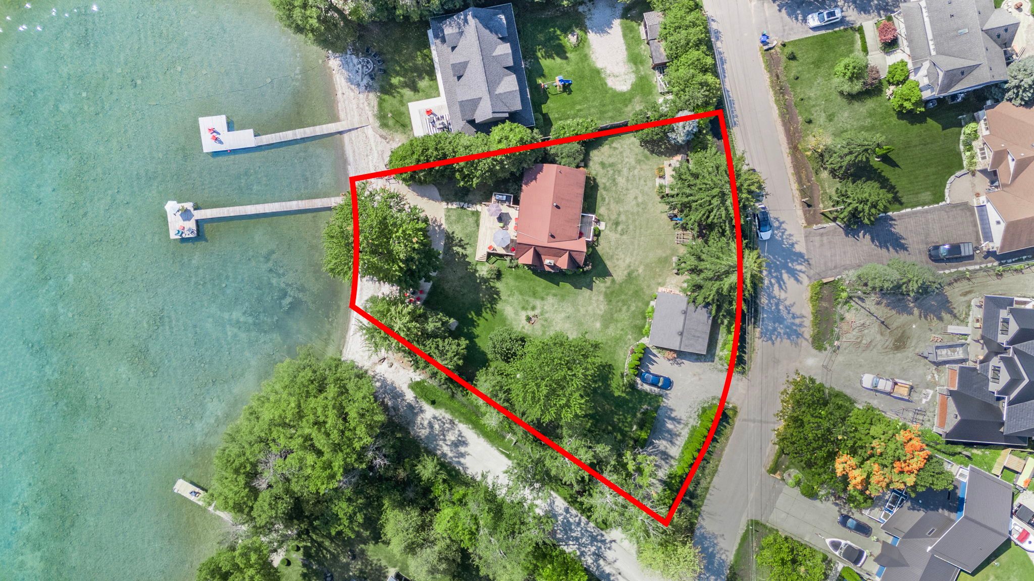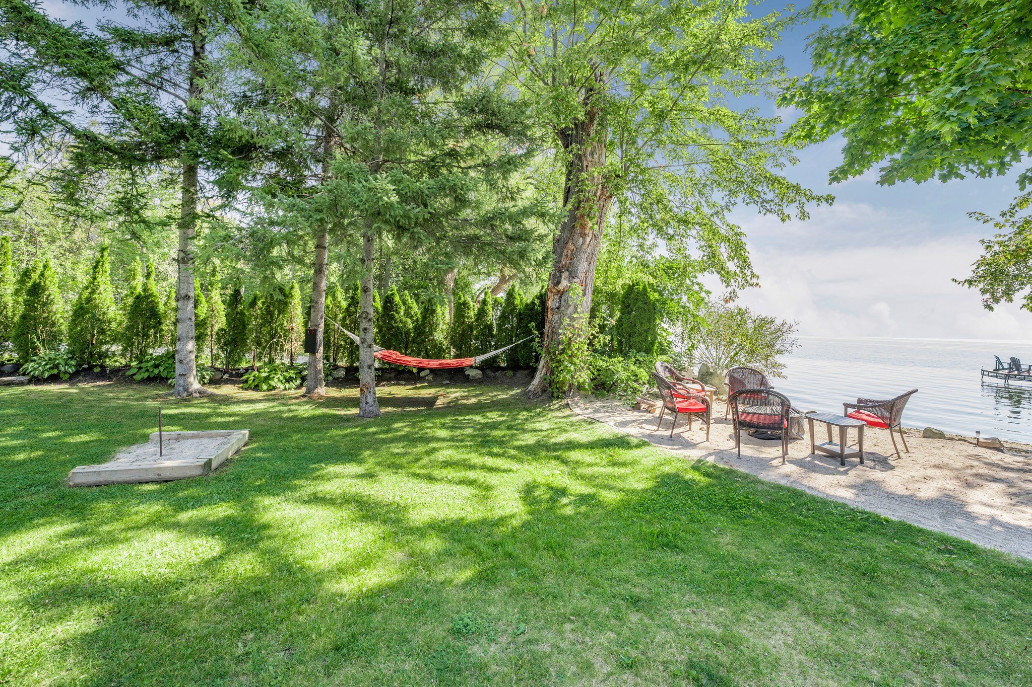 • 85 feet of sandy beach and a large dock for entertaining.