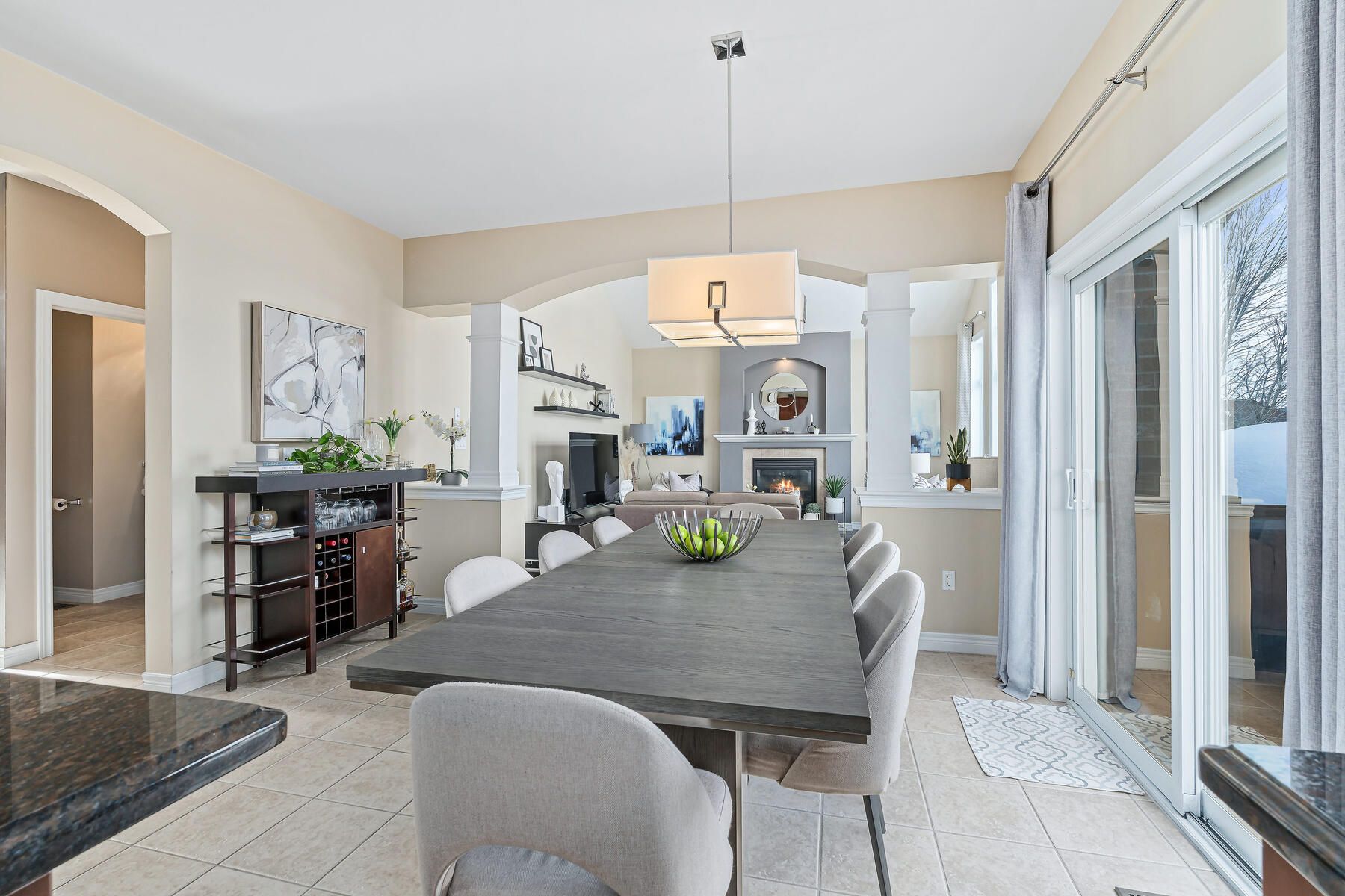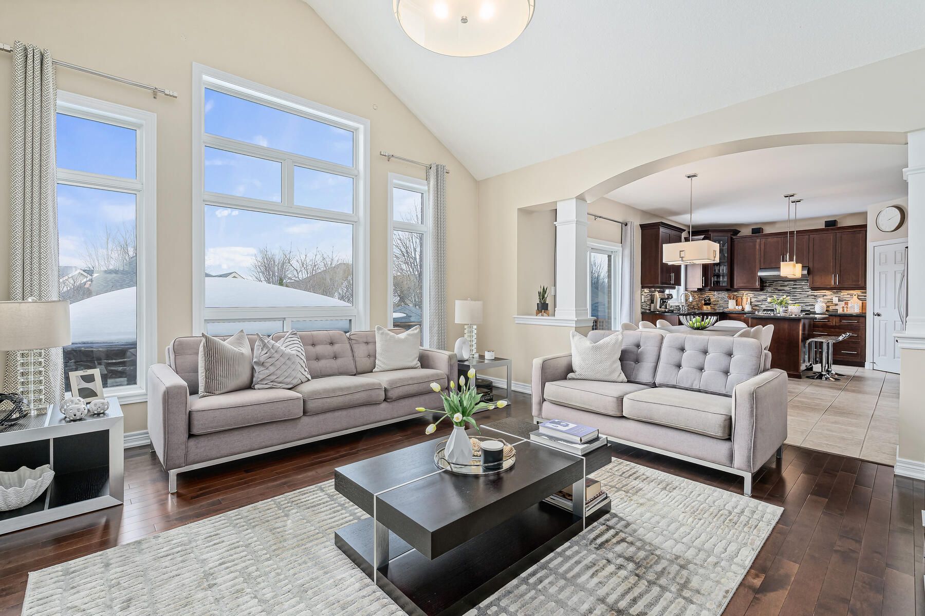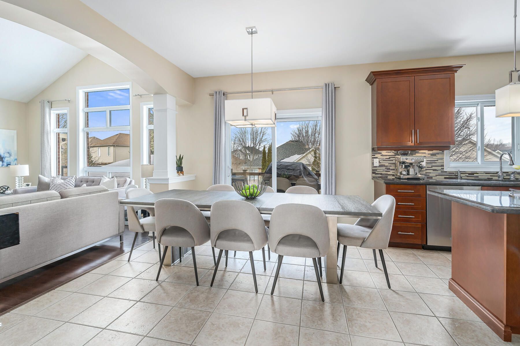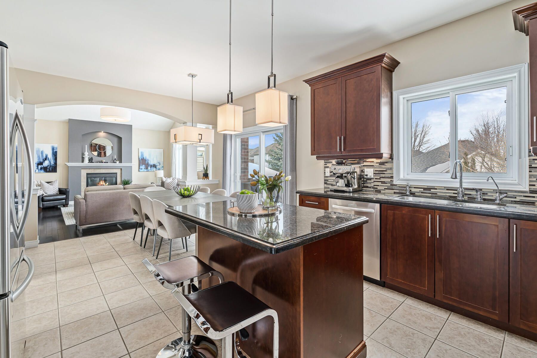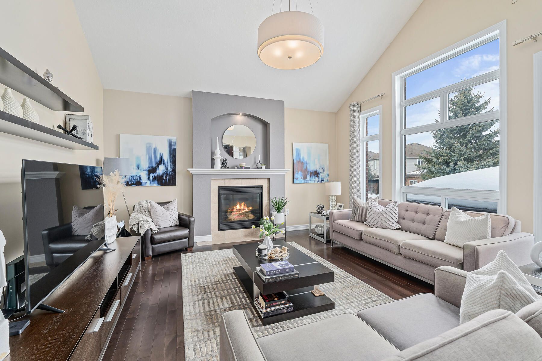• Vaulted ceiling in the great room with a gas fireplace and yard views.