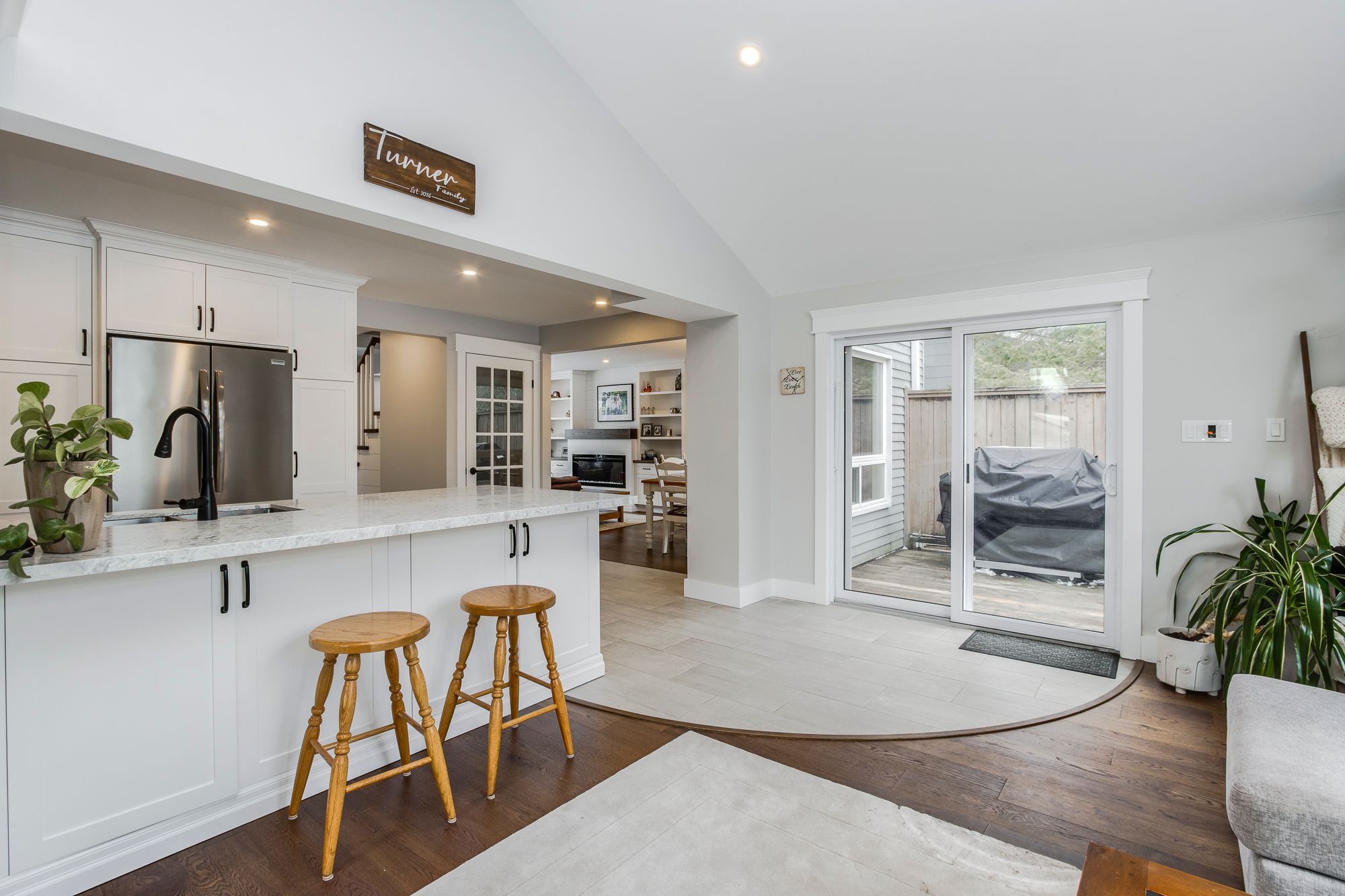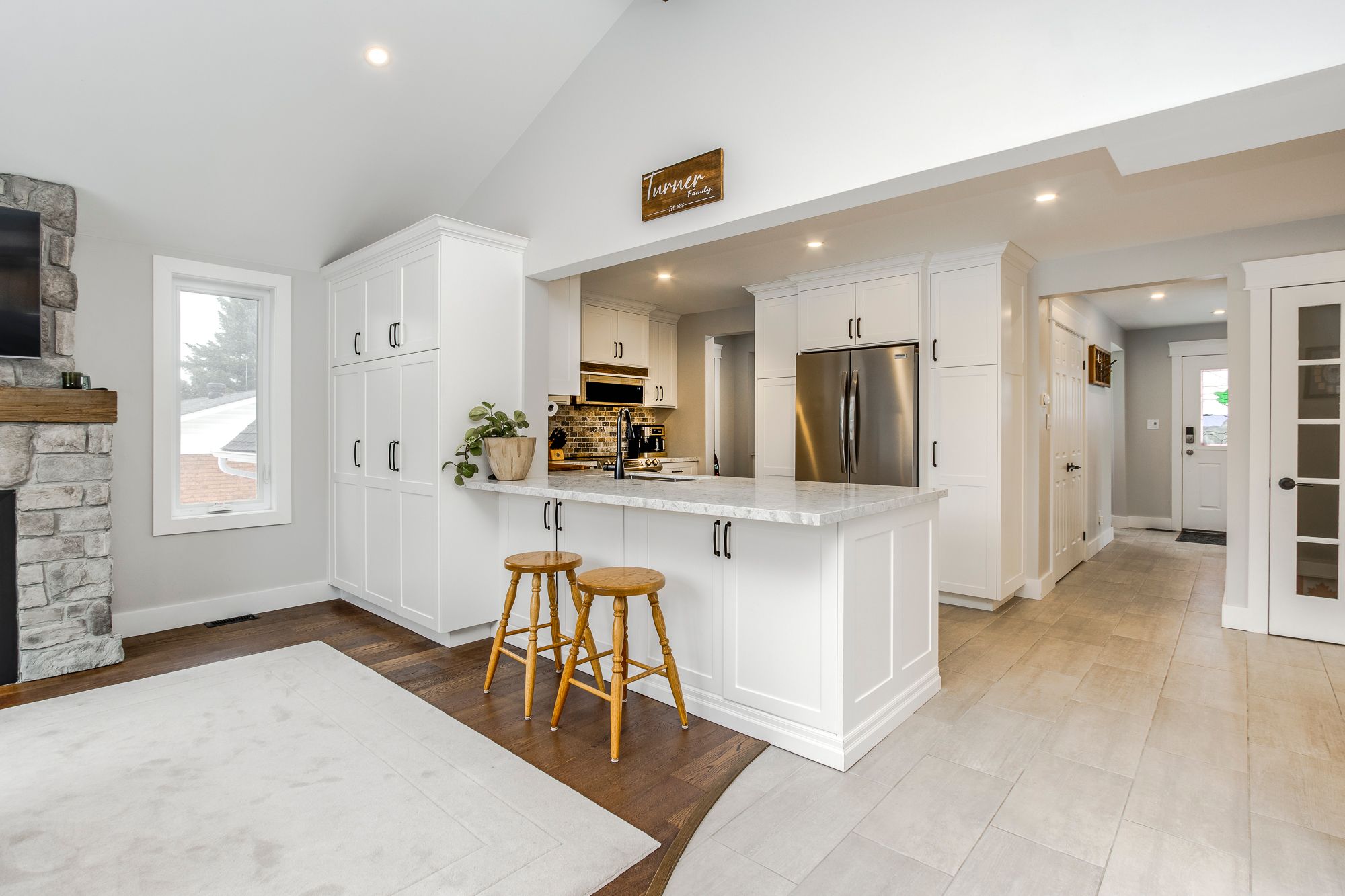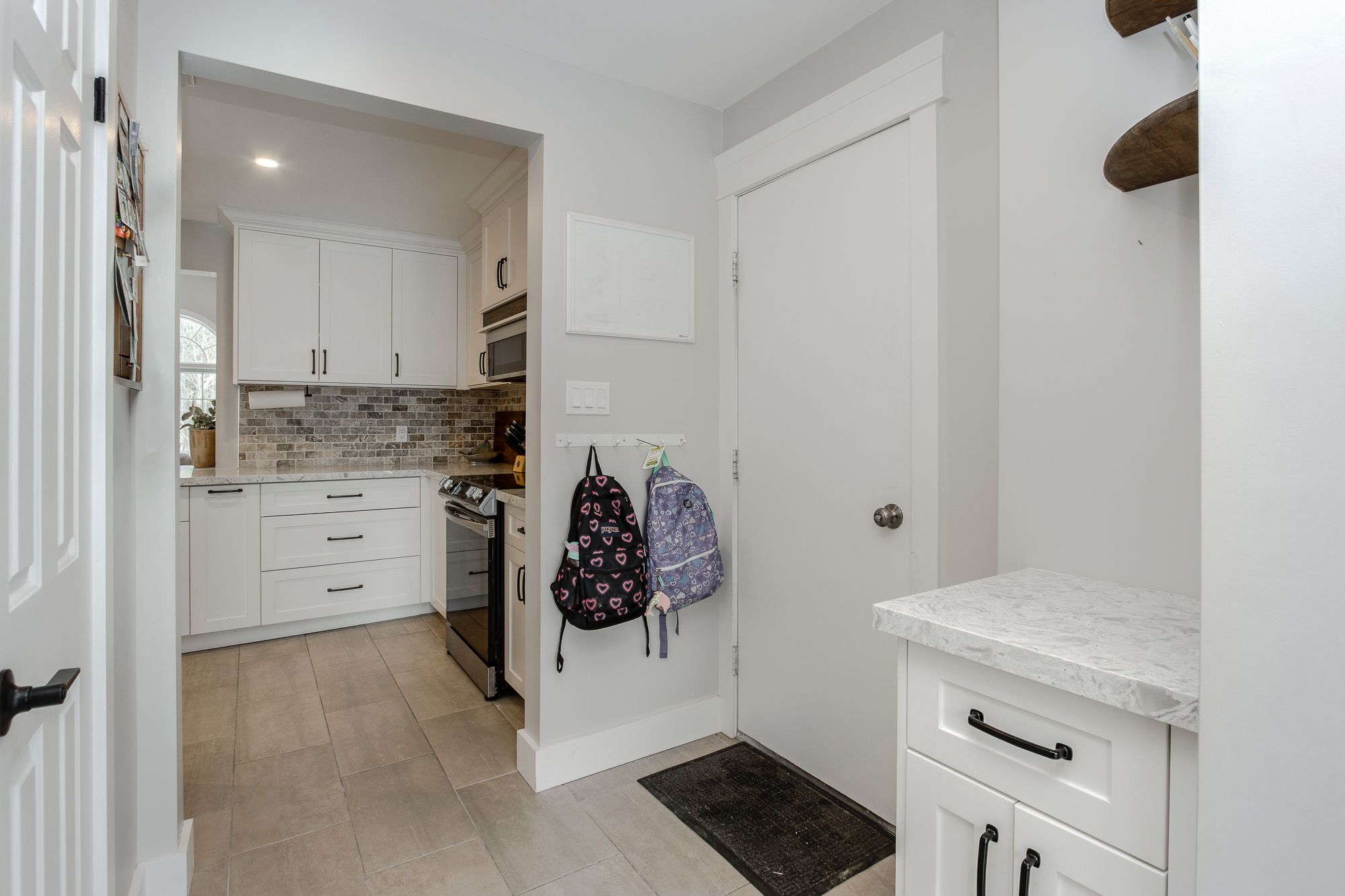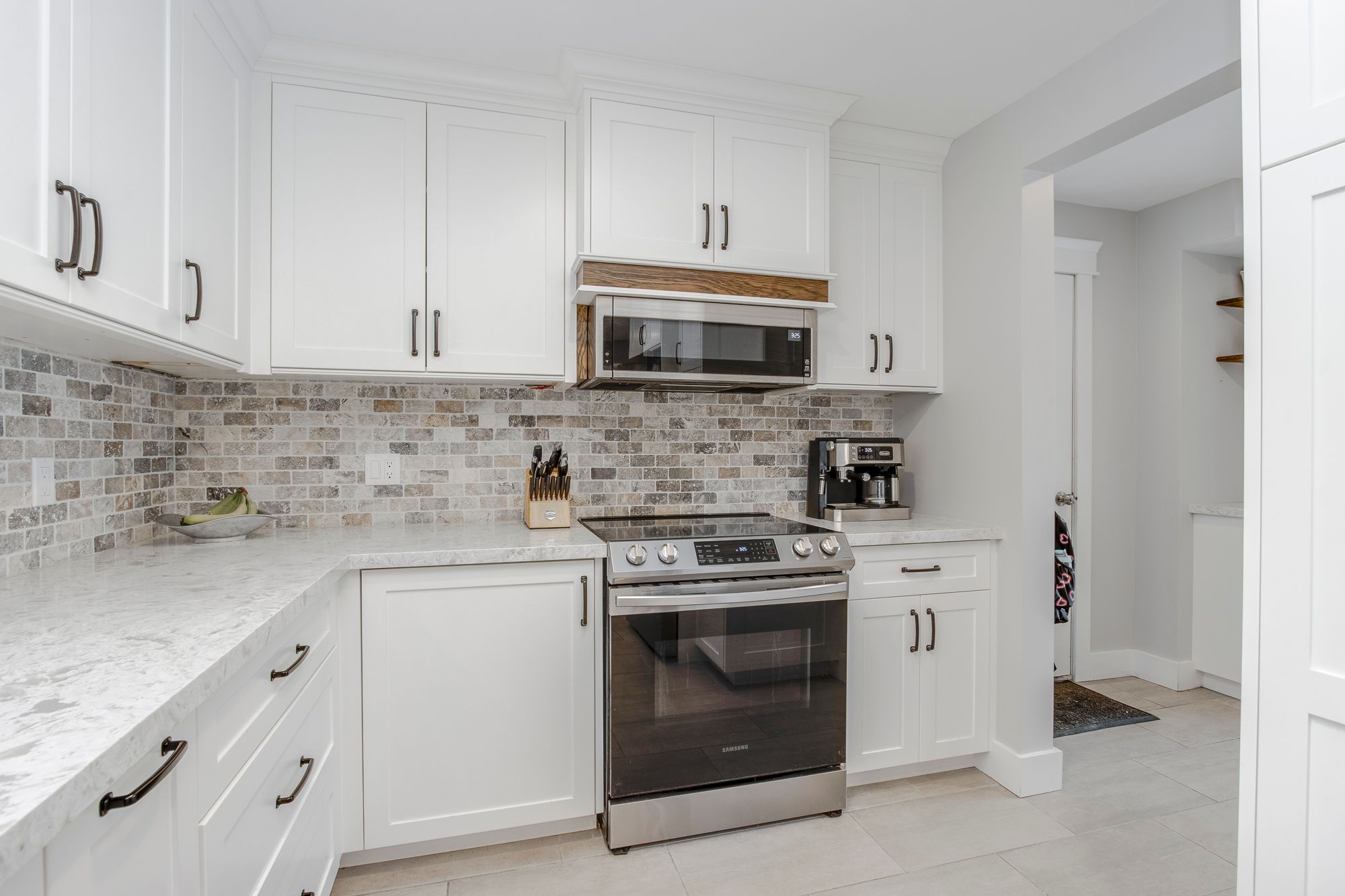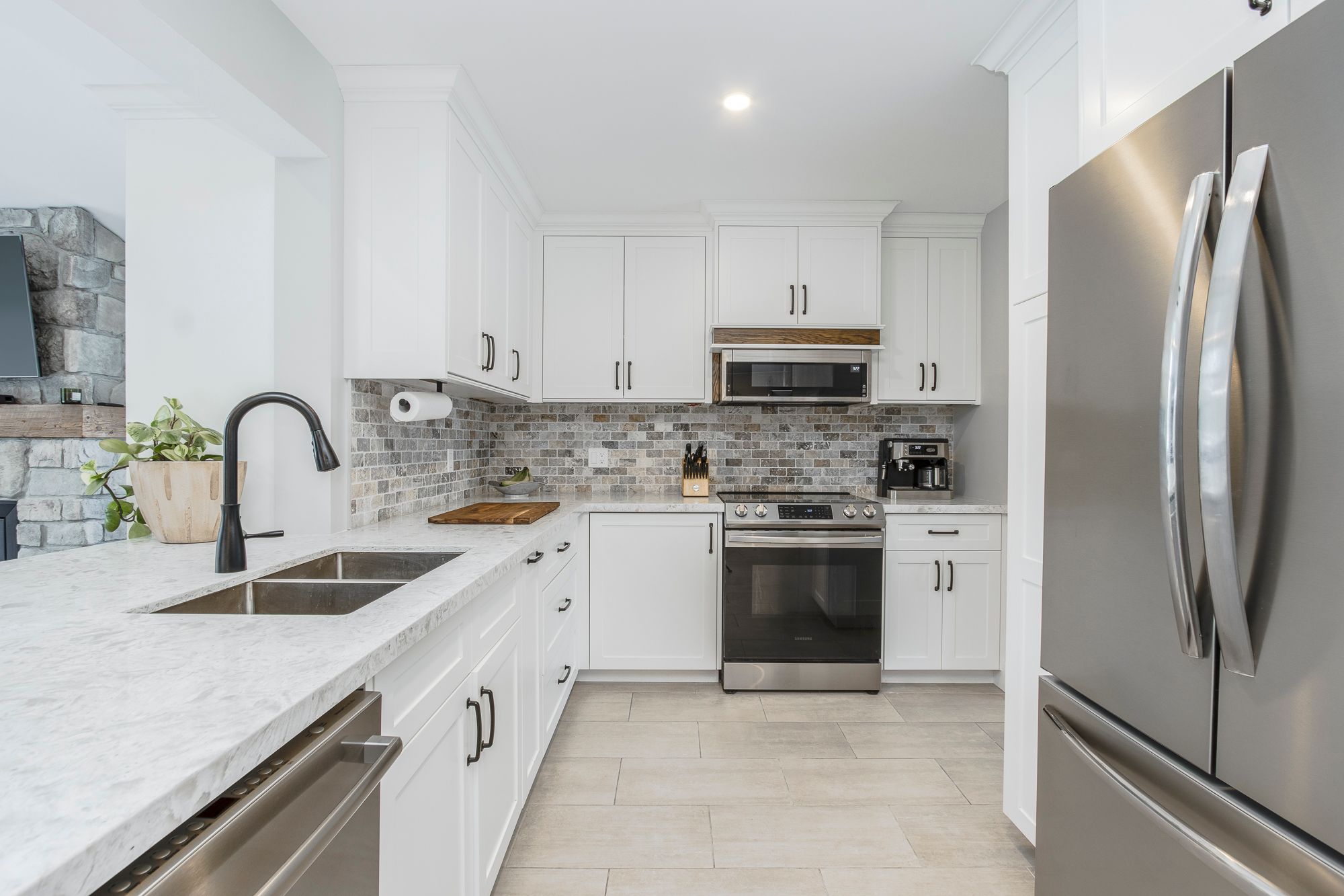 • Updated kitchen with quartz countertops, modern appliances, and open layout.