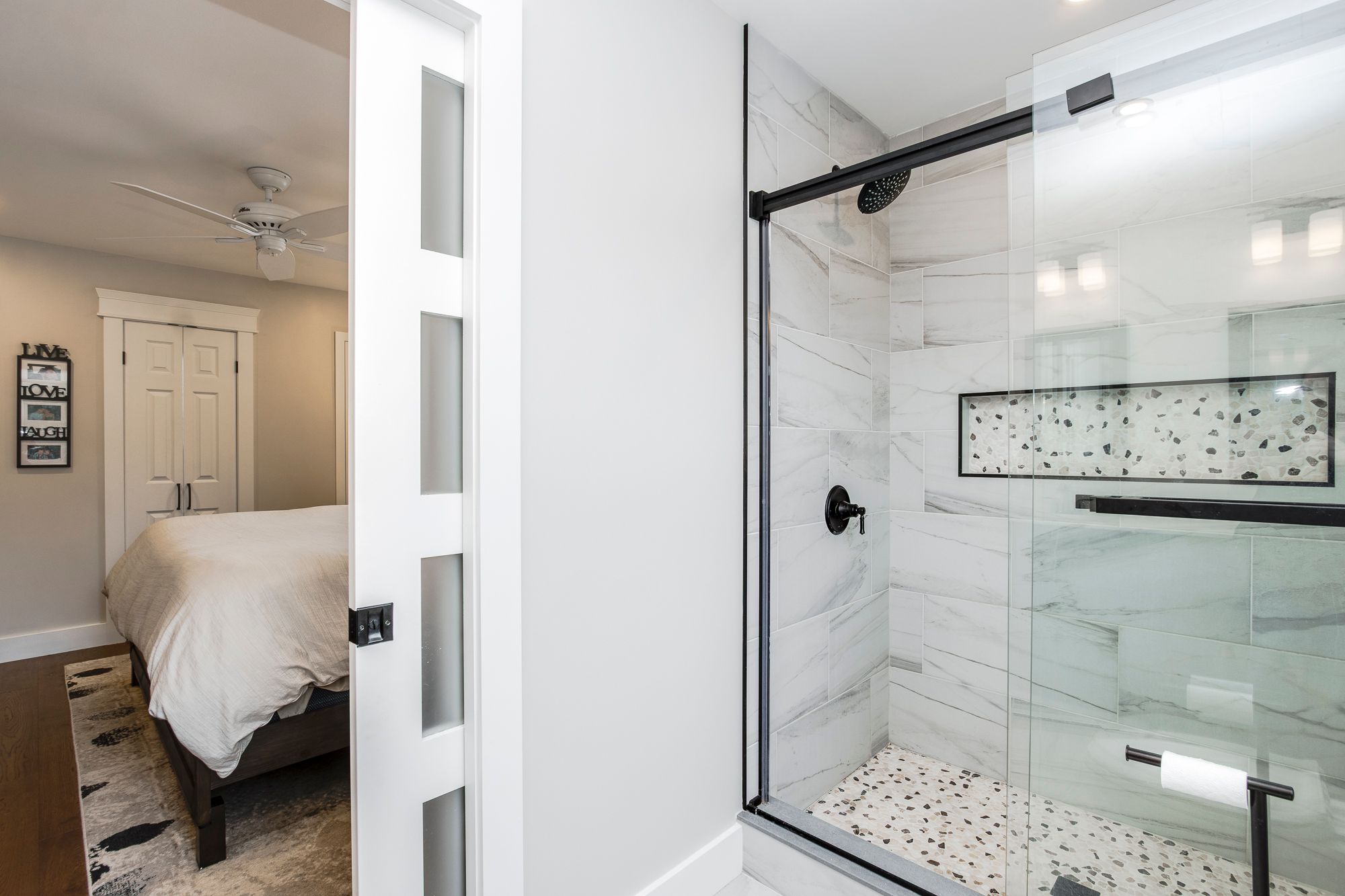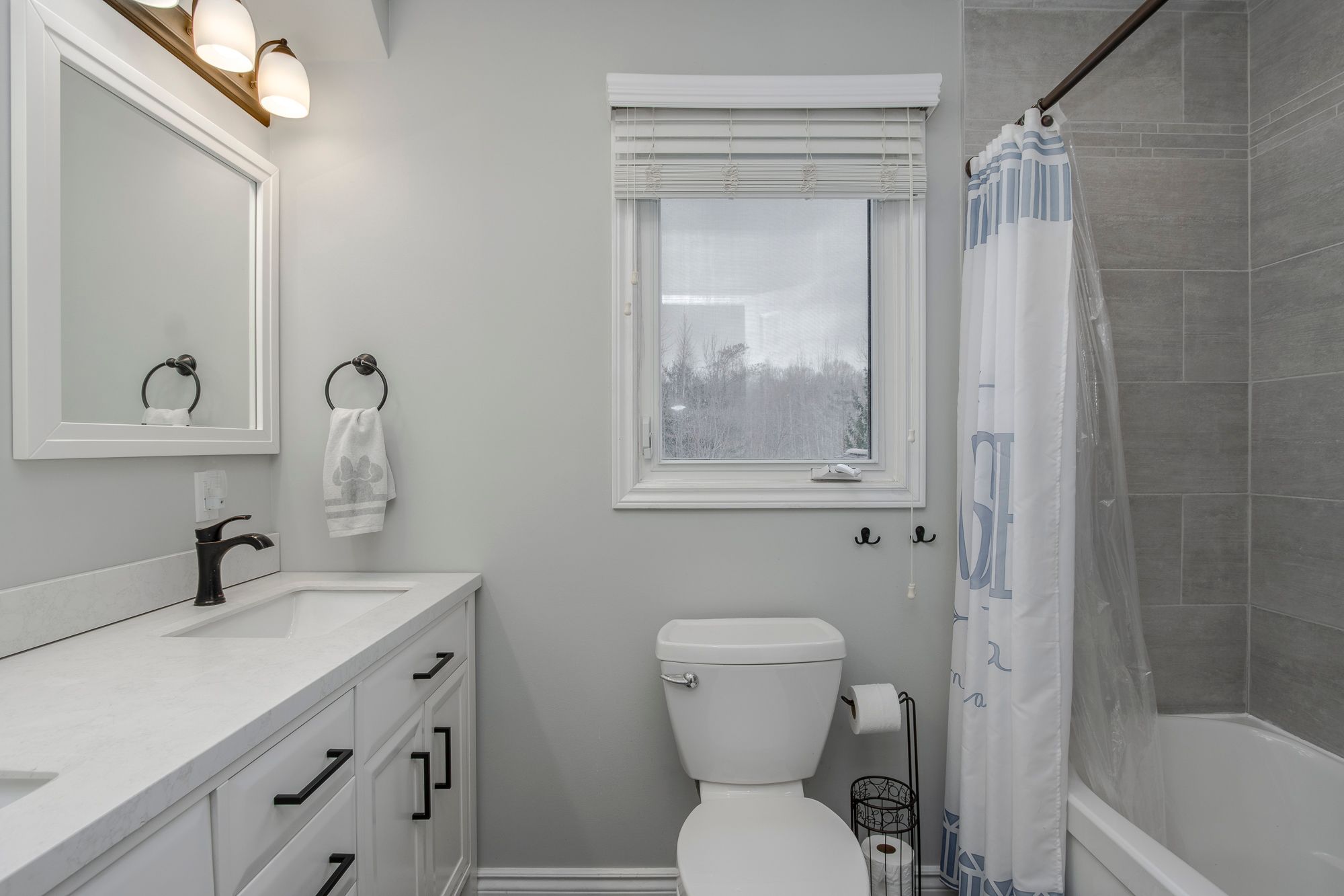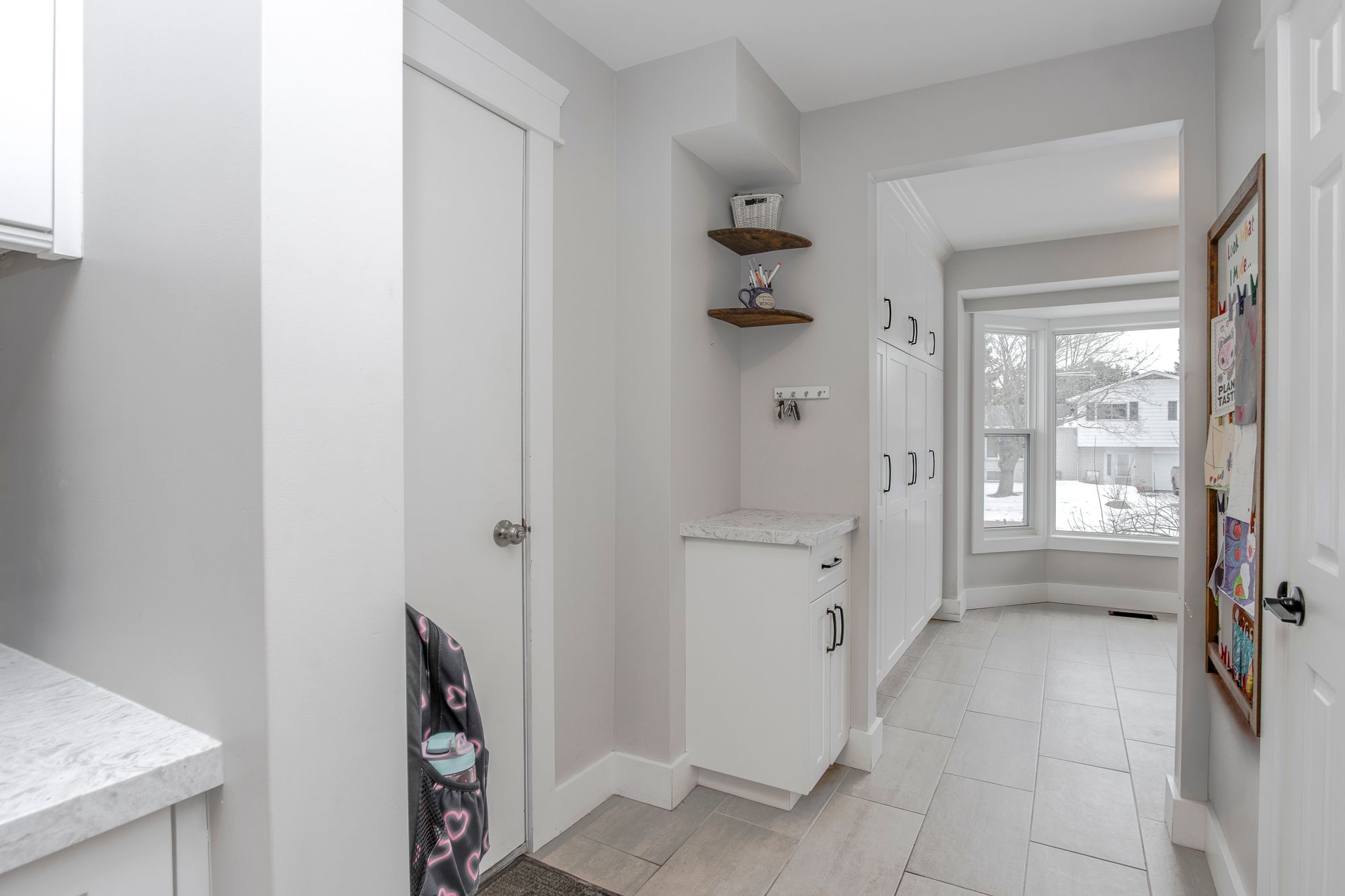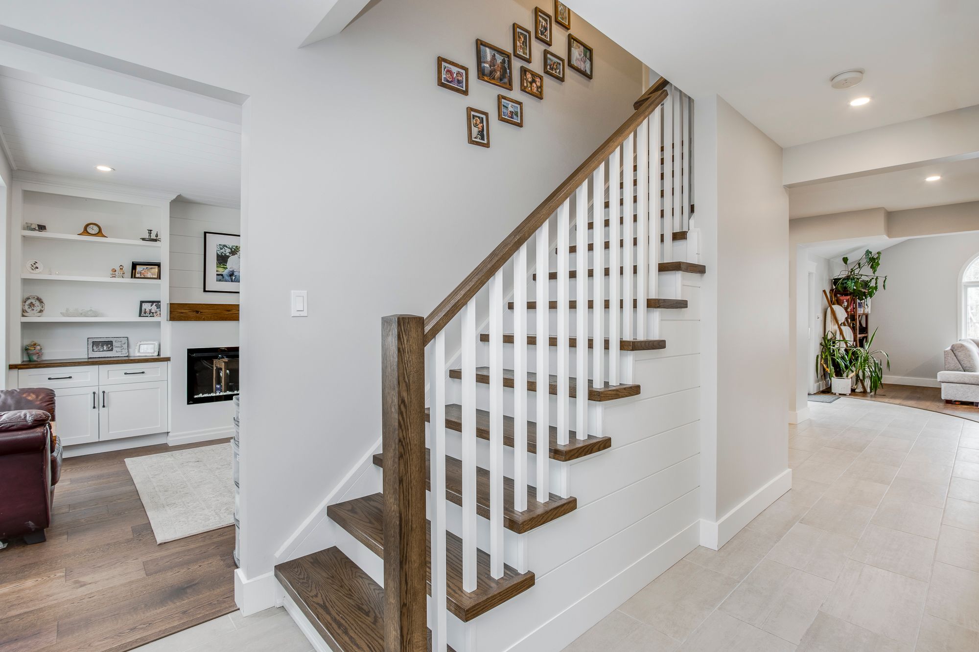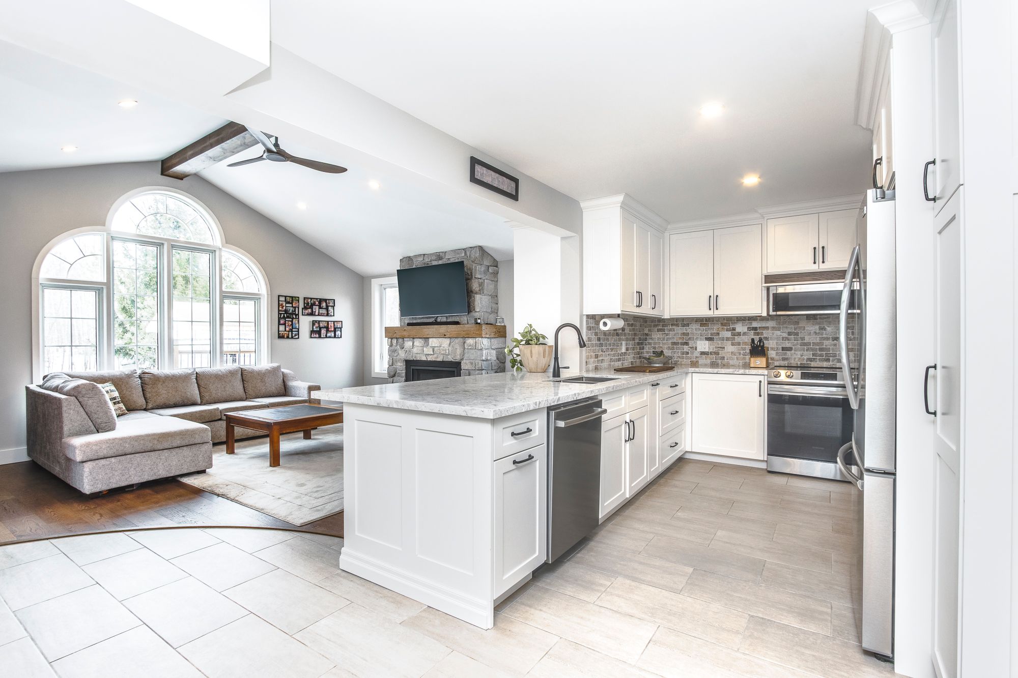 • Updated kitchen with quartz countertops, modern appliances, and open layout.