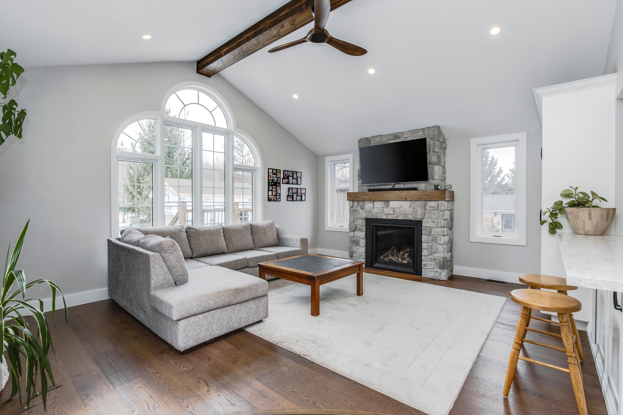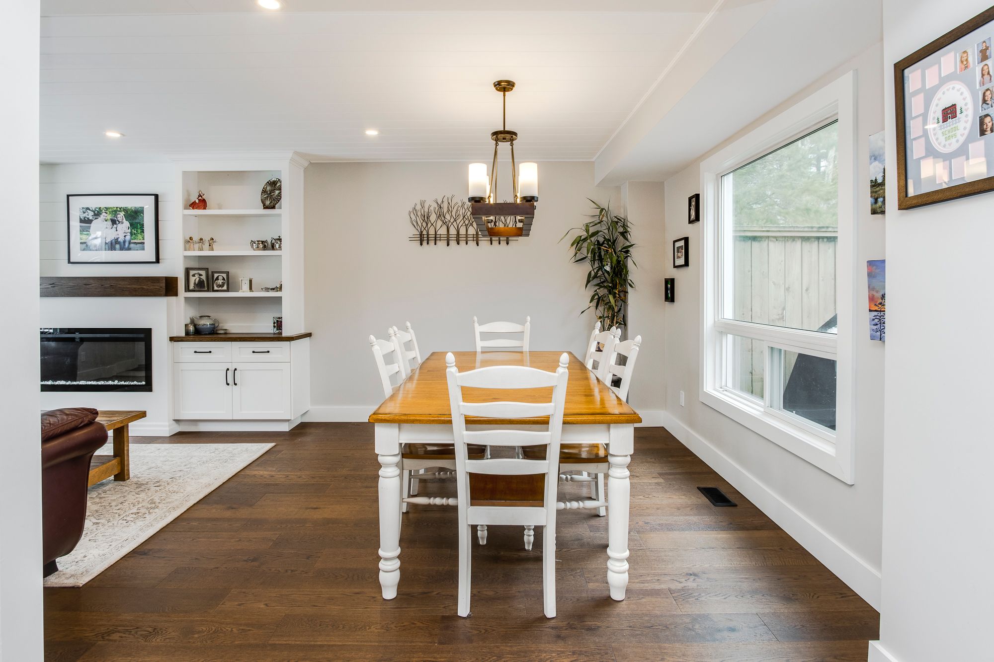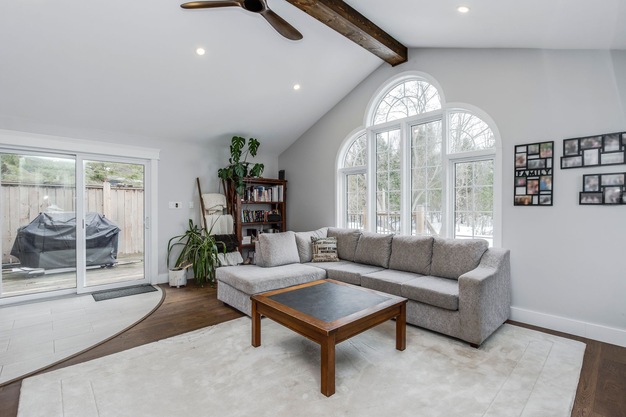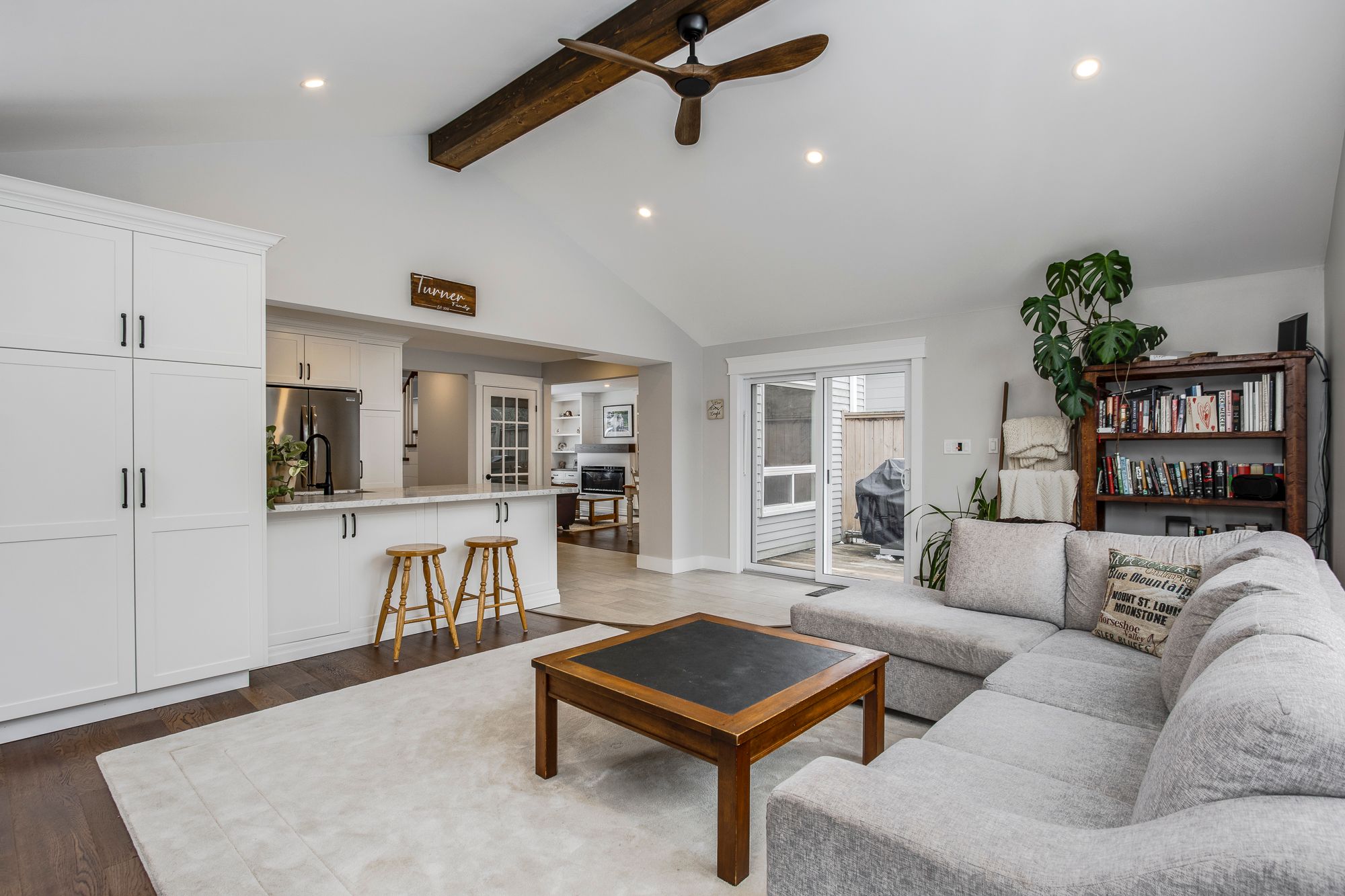 • Bright living spaces with a gas fireplace and flexible rooms for guests.