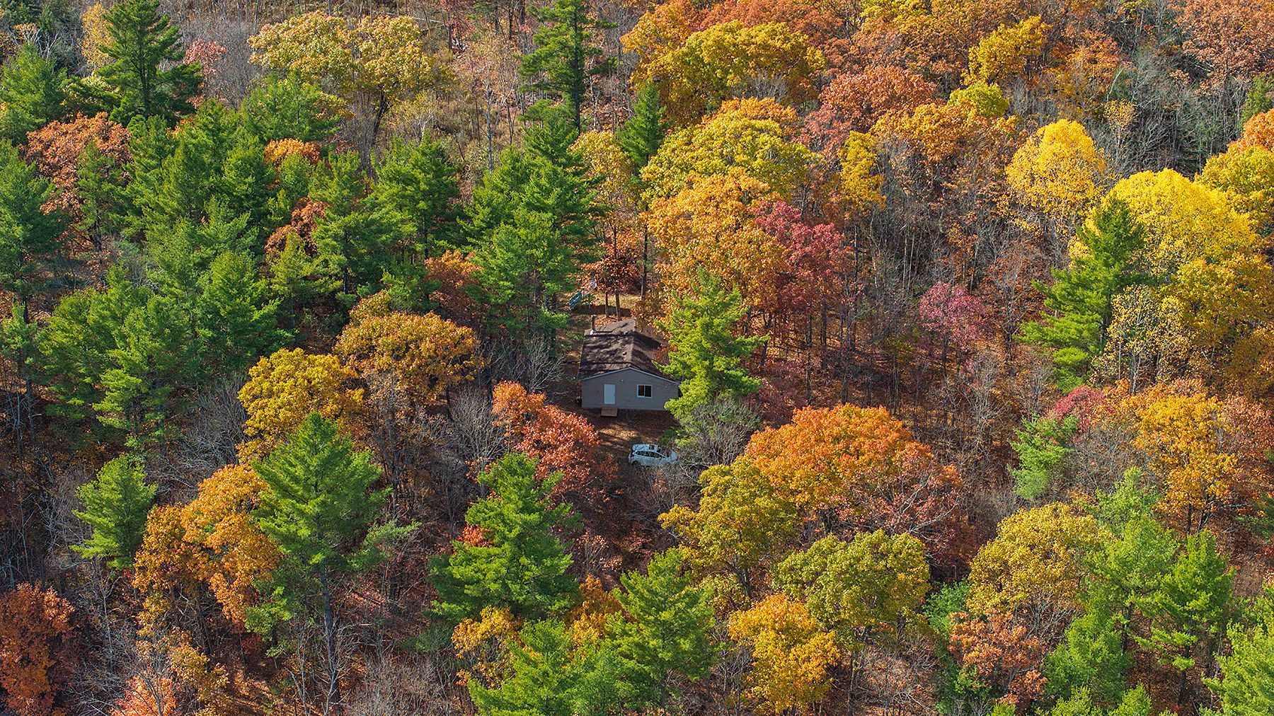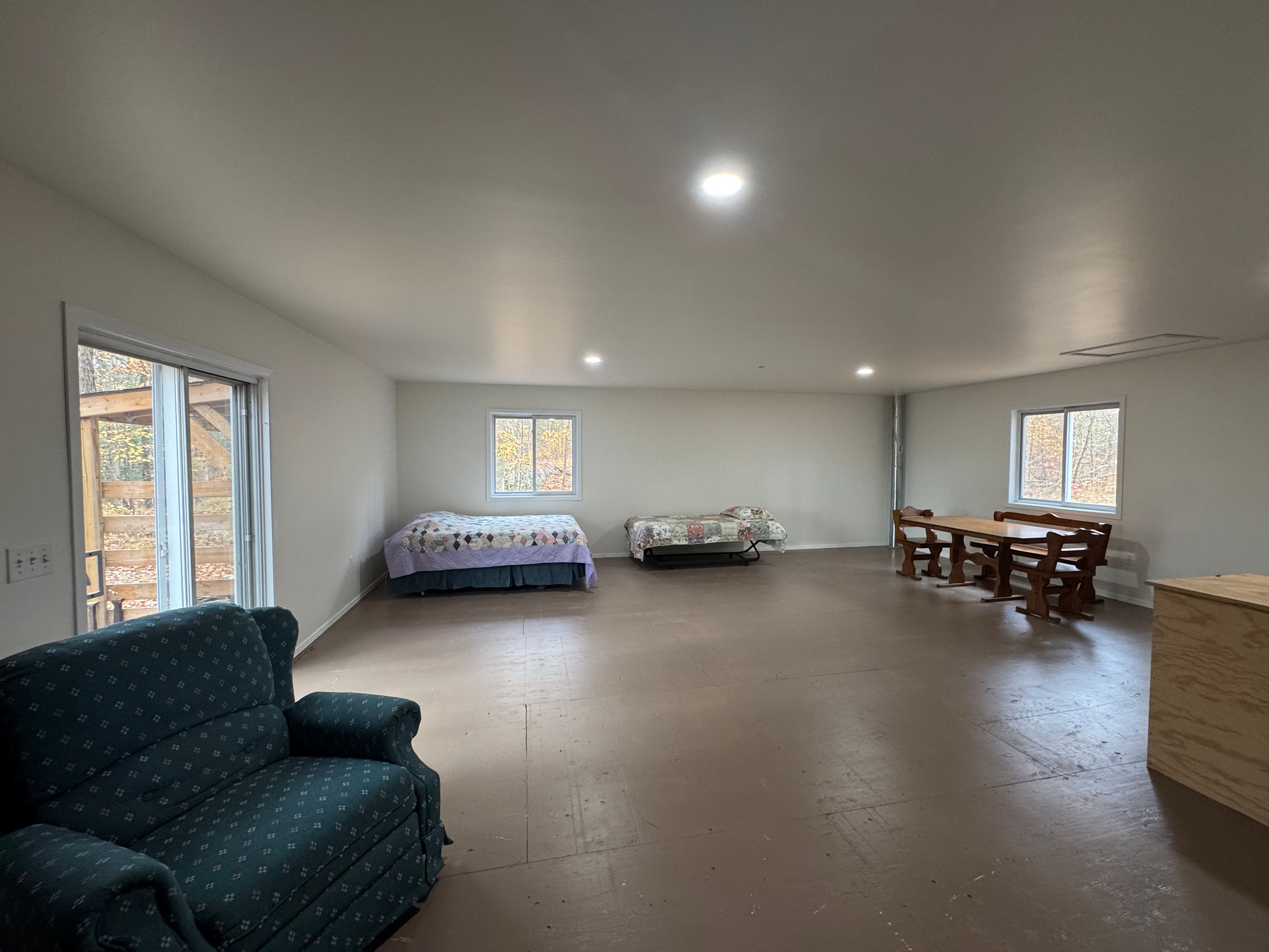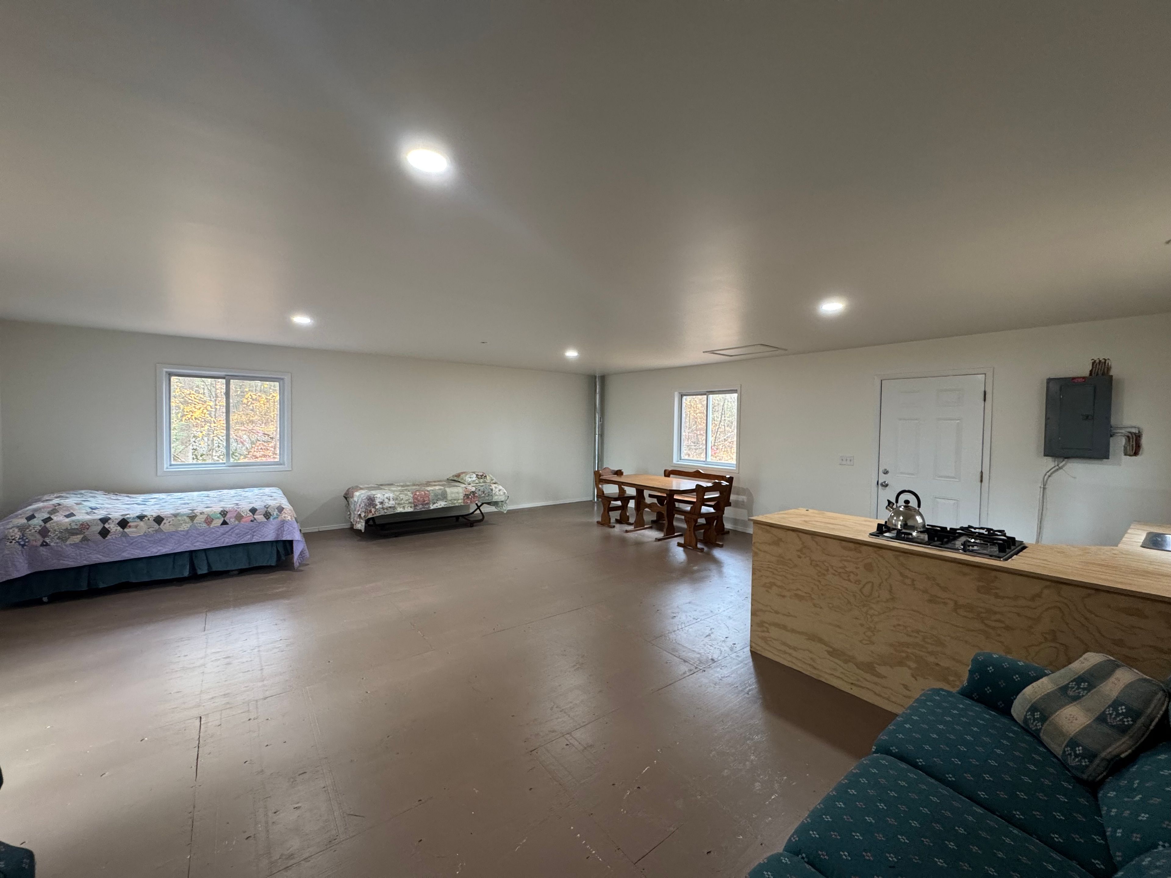 • Fully insulated one-room cottage heated by a wood stove for year-round use.