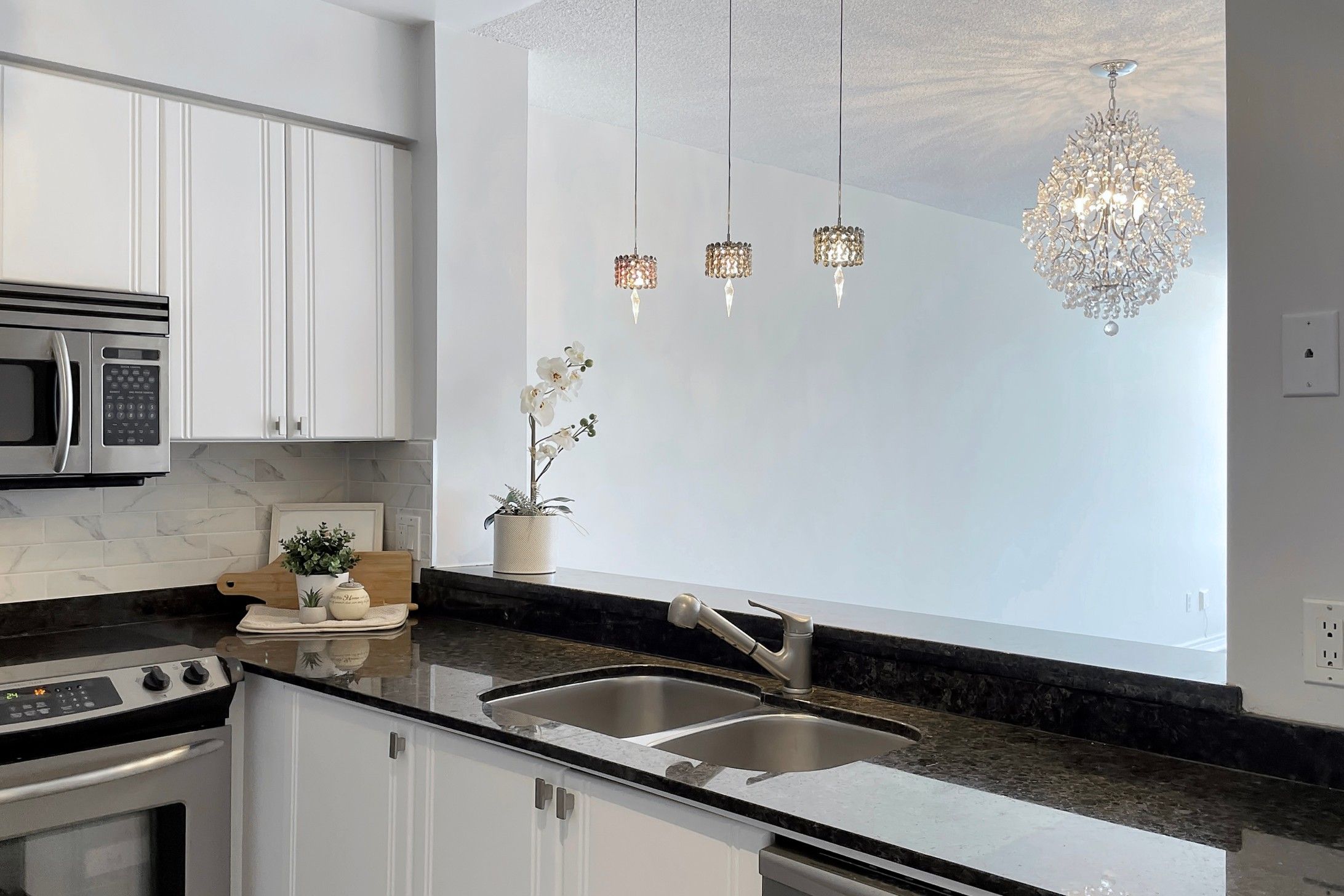 • Modern kitchen features granite countertops and stainless steel appliances.