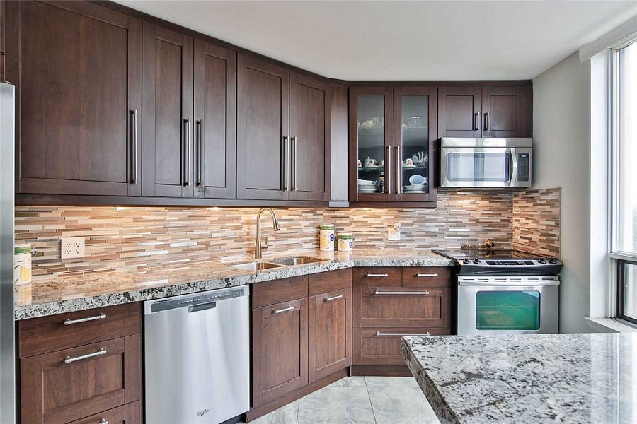 Stunning northwest corner suite filled with natural light and breathtaking sunset views. One of the largest units in the building at approximately 1,350 sq. Ft. (per mpac) plus balcony, this beautifully maintained home offers an exceptionally functional, well-designed layout. Its prime corner exposure bathes the space in sunlight all day, creating a warm and inviting atmosphere. The expansive open-concept living and dining area is ideal for both everyday comfort and effortless entertaining. Large windows showcase picturesque skyline views, while the generous layout accommodates full-sized furnishings. The spacious eat-in kitchen blends style and function with a granite breakfast bar, ceramic backsplash, upgraded modern cabinetry, and ample counter and storage space. A versatile den provides flexible living options-perfect as a home office, guest area, or creative space. The primary bedroom retreat features double closets and a renovated 4-piece ensuite with double sinks and an oversized glass-enclosed shower. The second bathroom is tastefully updated, reflecting pride of ownership throughout. Refined finishes include plank laminate flooring, crown mouldings, high baseboards, and a contemporary colour palette. Residents enjoy exceptional amenities: 24-hour security, a fully equipped fitness centre, an outdoor pool, and tennis courts, offering resort-style living at home. Ideally located near public transit, shopping, restaurants, parks, and schools. Direct bus service to york university and finch subway station makes commuting easy. A rare opportunity to live in a spacious, sun-filled corner suite in a highly sought-after community.
