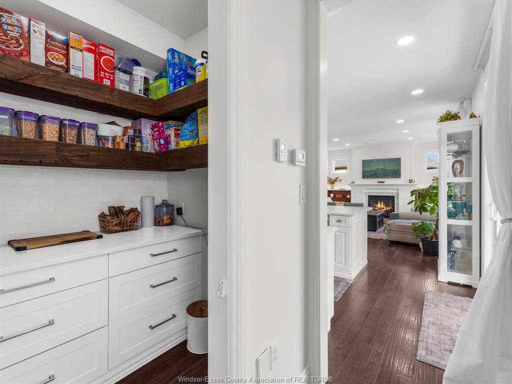 kitchen showcasing a large island & walk-in pantry, a gas fireplace with new custom lighted shelving, separate dining