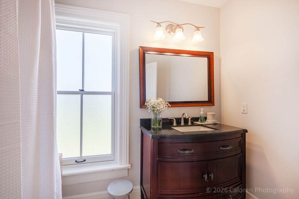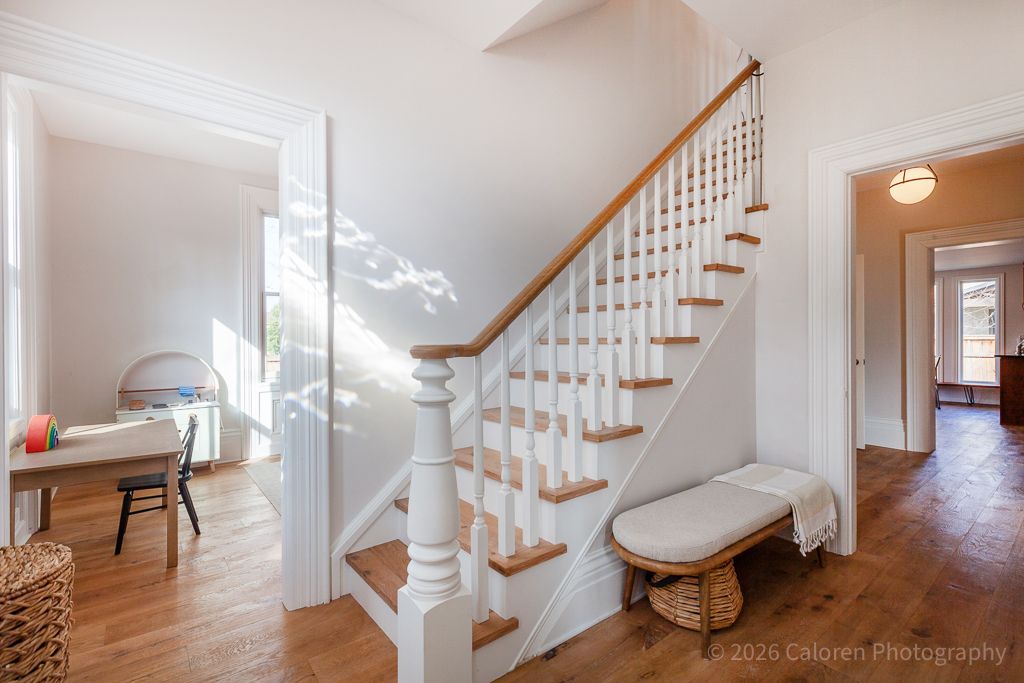 • Inviting foyer with leaded stained glass and a restored staircase.