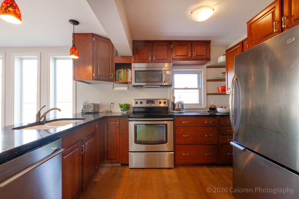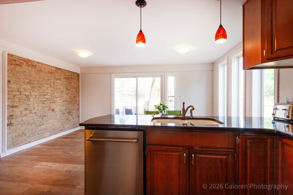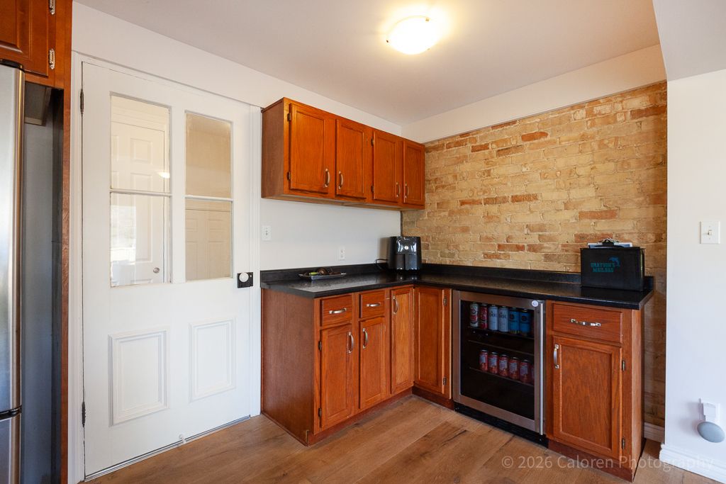 • Spacious kitchen featuring exposed brick, granite countertops, and coffee bar.