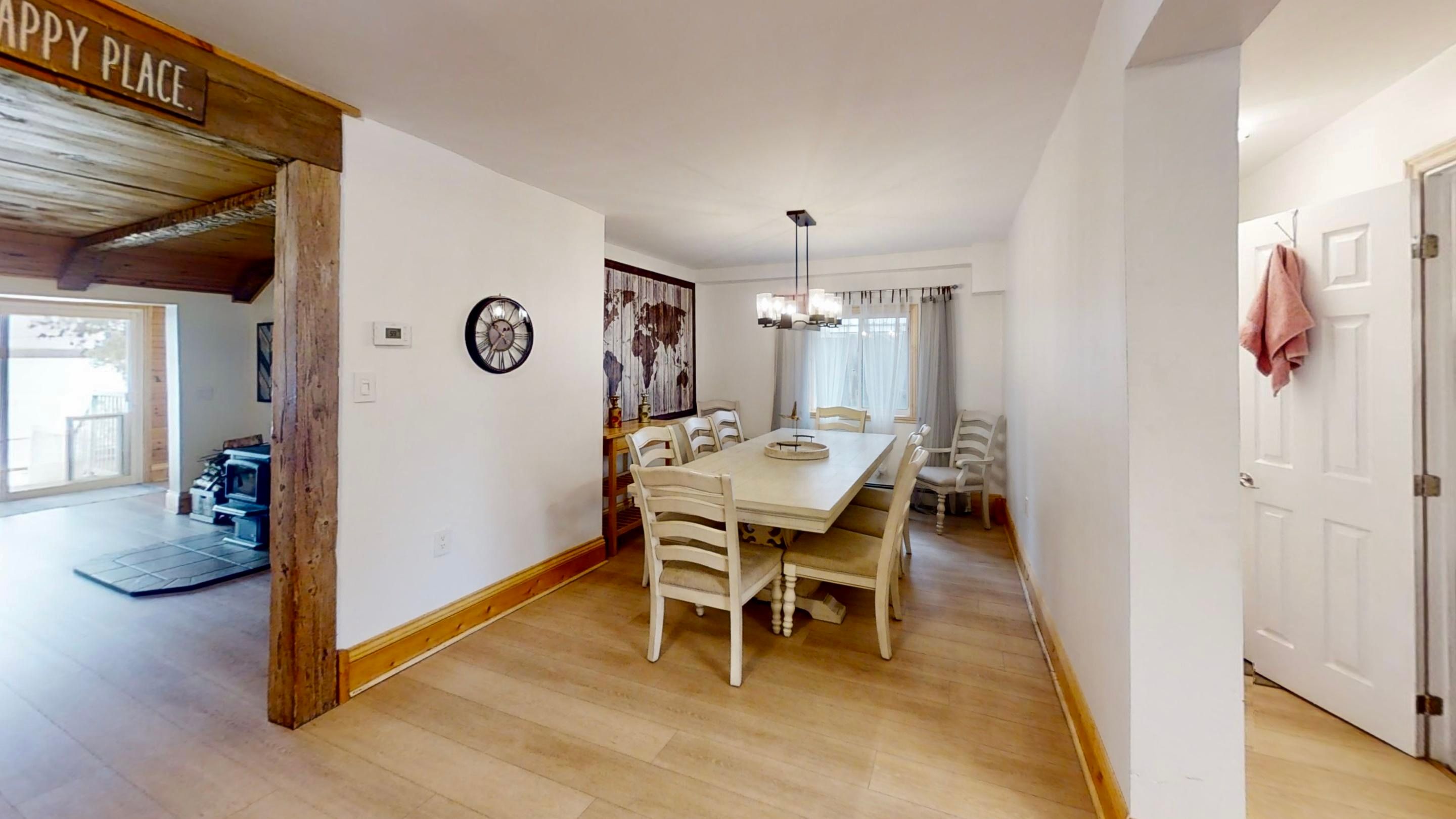 • Bright open-concept living area with hardwood and laminate flooring.