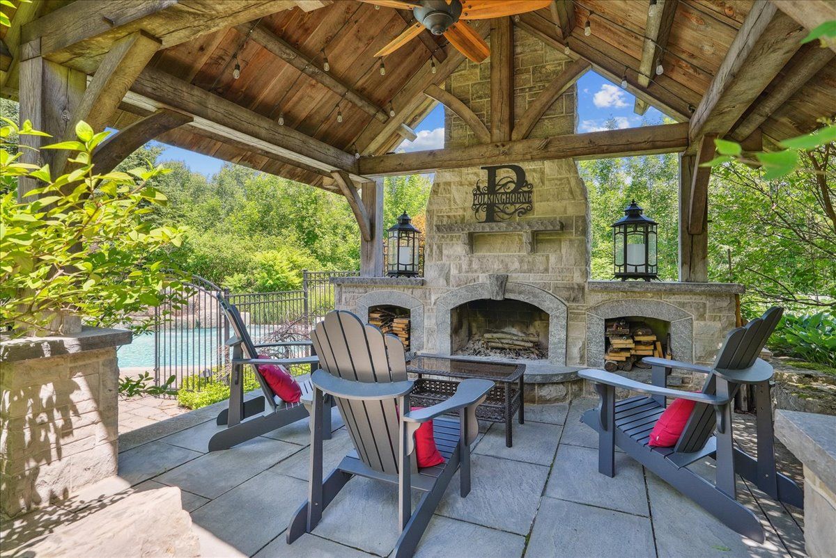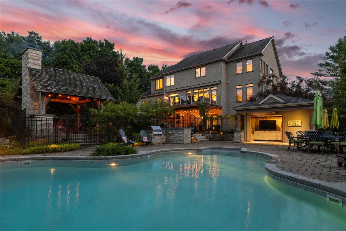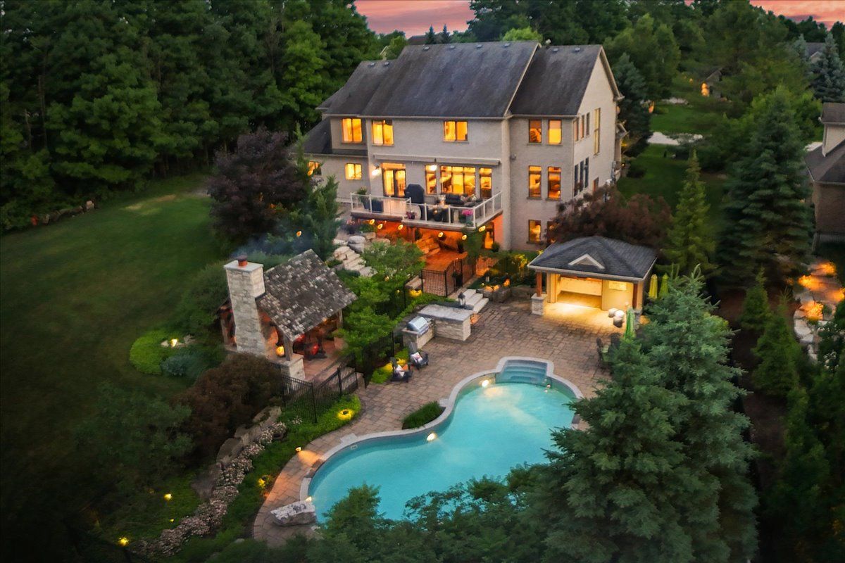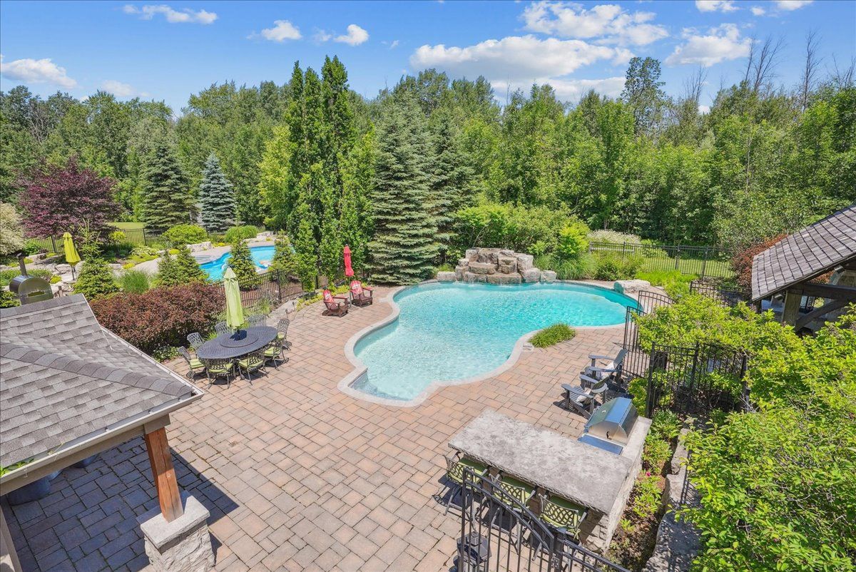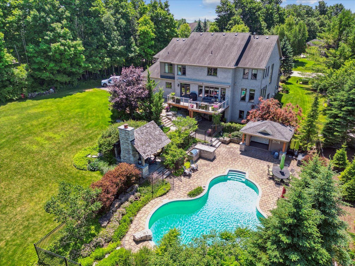 Beautifully designed executive home offering over 5,700 sq ft of finished living space on a quiet court, with exceptional privacy and stunning treed views. The spacious main floor features an entertainers gourmet kitchen with full fridge and freezer, 48-inch range, hidden coffee bar, and an oversized island with seating for six+. The kitchen opens to the eat-in area and living room with hand picked stone fireplace, plus a formal dining room that seats 16+. Main-floor laundry and a convenient three-car garage with large driveway parking for approximately 8 cars. Upstairs you'll find five generous bedrooms and three full baths, including a luxurious primary suite with oversized ensuite, two walk-in closets, and a private exercise room. A second bedroom with its own ensuite is perfect for guests or family. The finished walk-out basement is designed for entertaining, with a full bar, pool table area, dance room, bathroom, and plenty of storage. Step outside to your backyard oasis featuring a sparkling pool with waterfall, diving rock, and fountains. Enjoy both a dedicated pool house and a separate outdoor living room with stone fireplace and cedar shake roof. Host gatherings at the built-in poolside barbecue and bar area, all surrounded by mature trees for ultimate seclusion. Natural gas is at the property rare for country living!