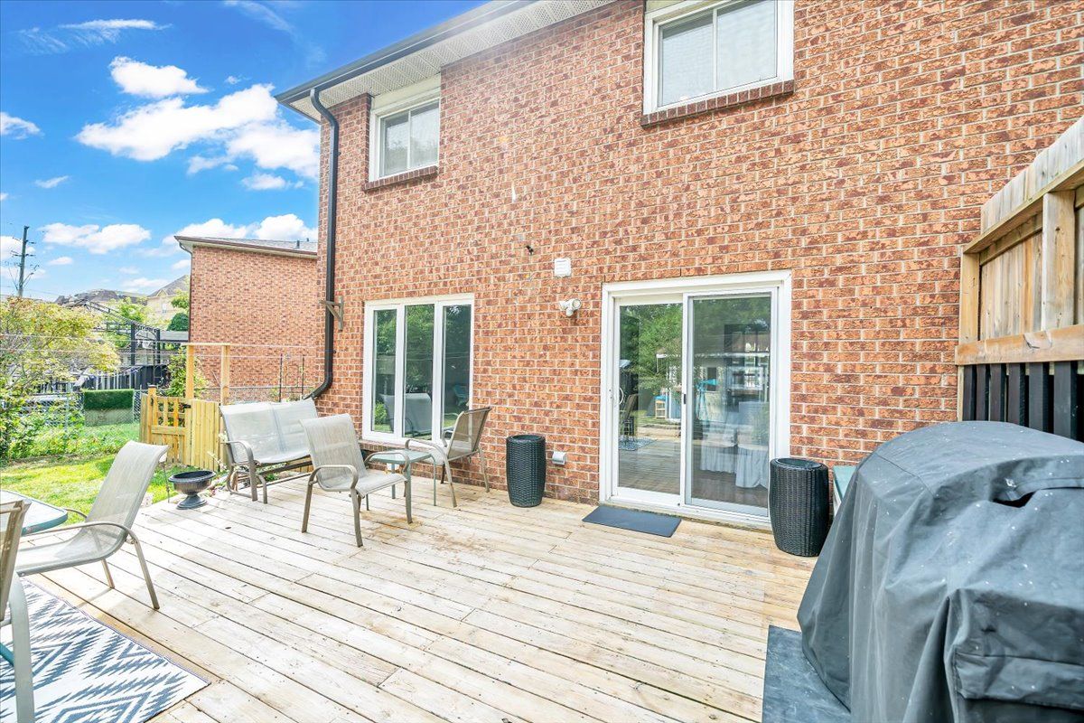 • Deep backyard with a large deck and vibrant gardens.