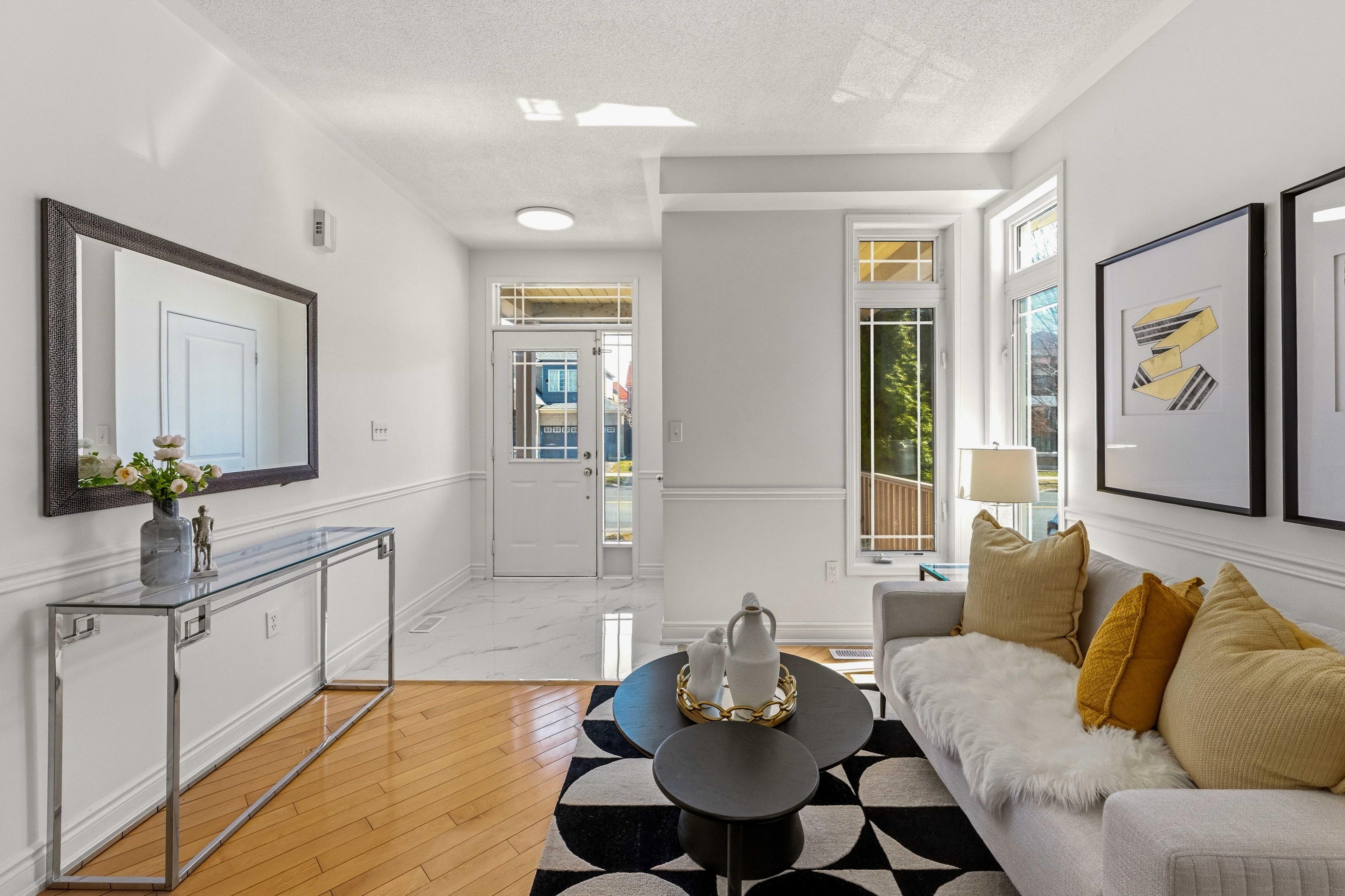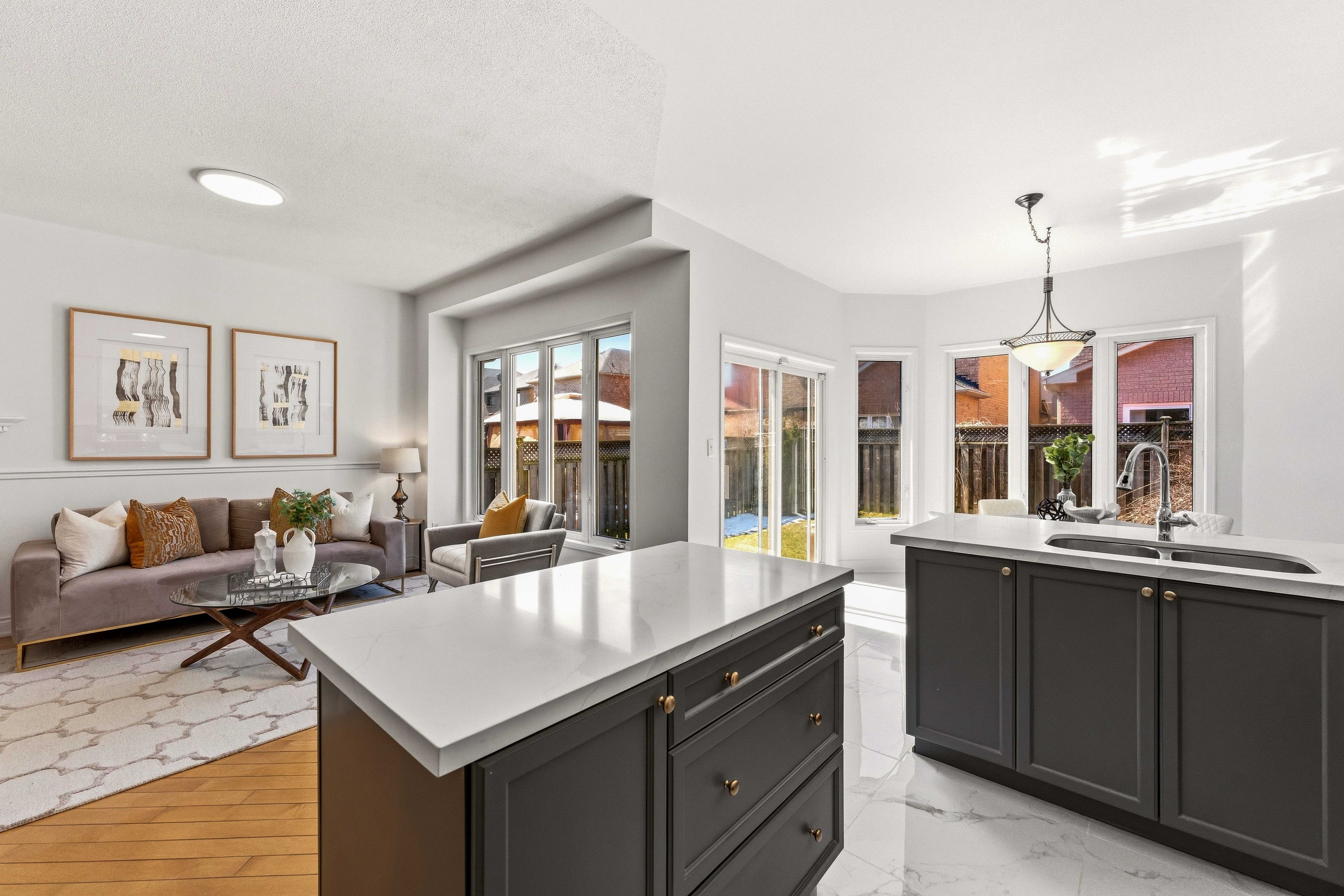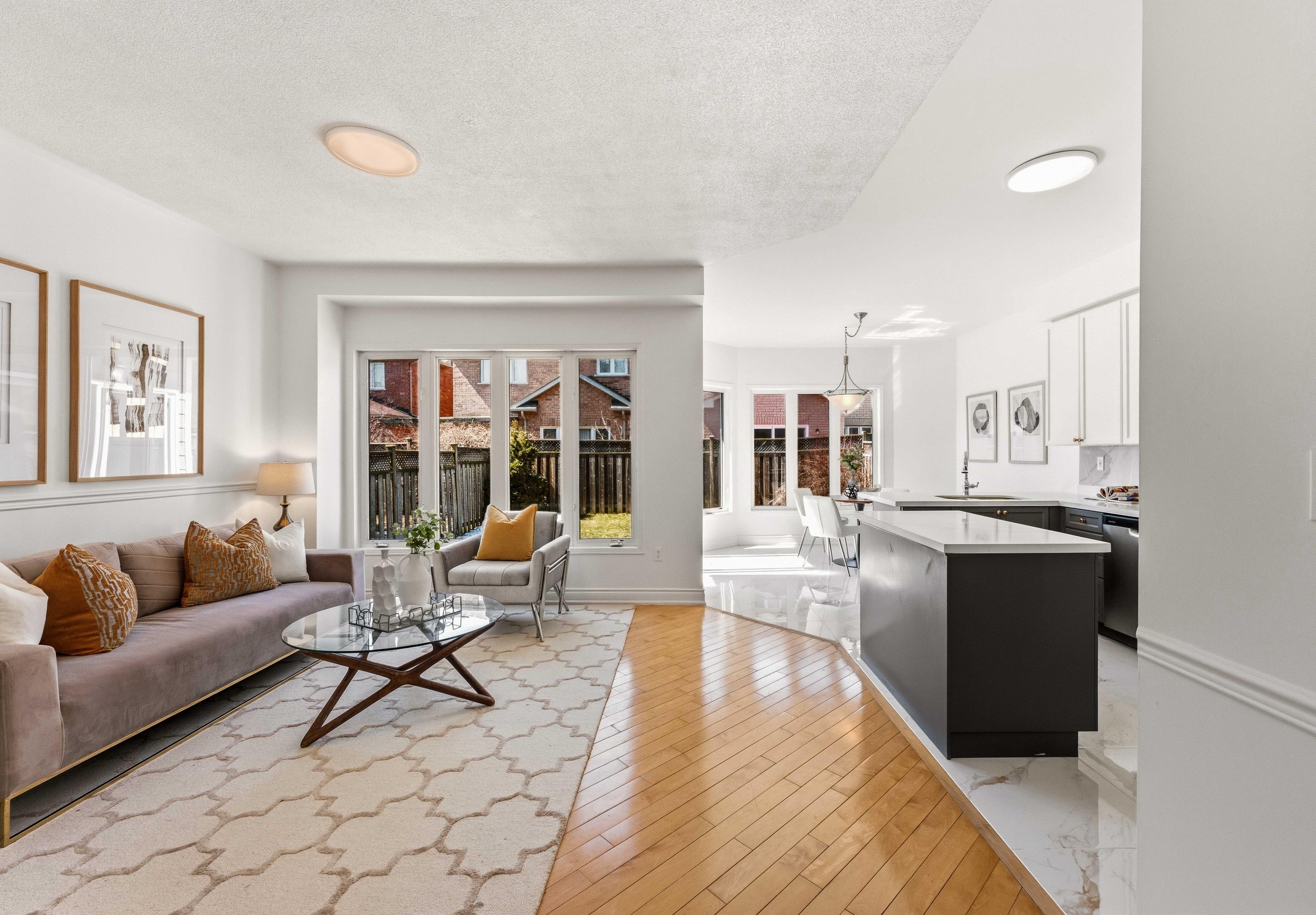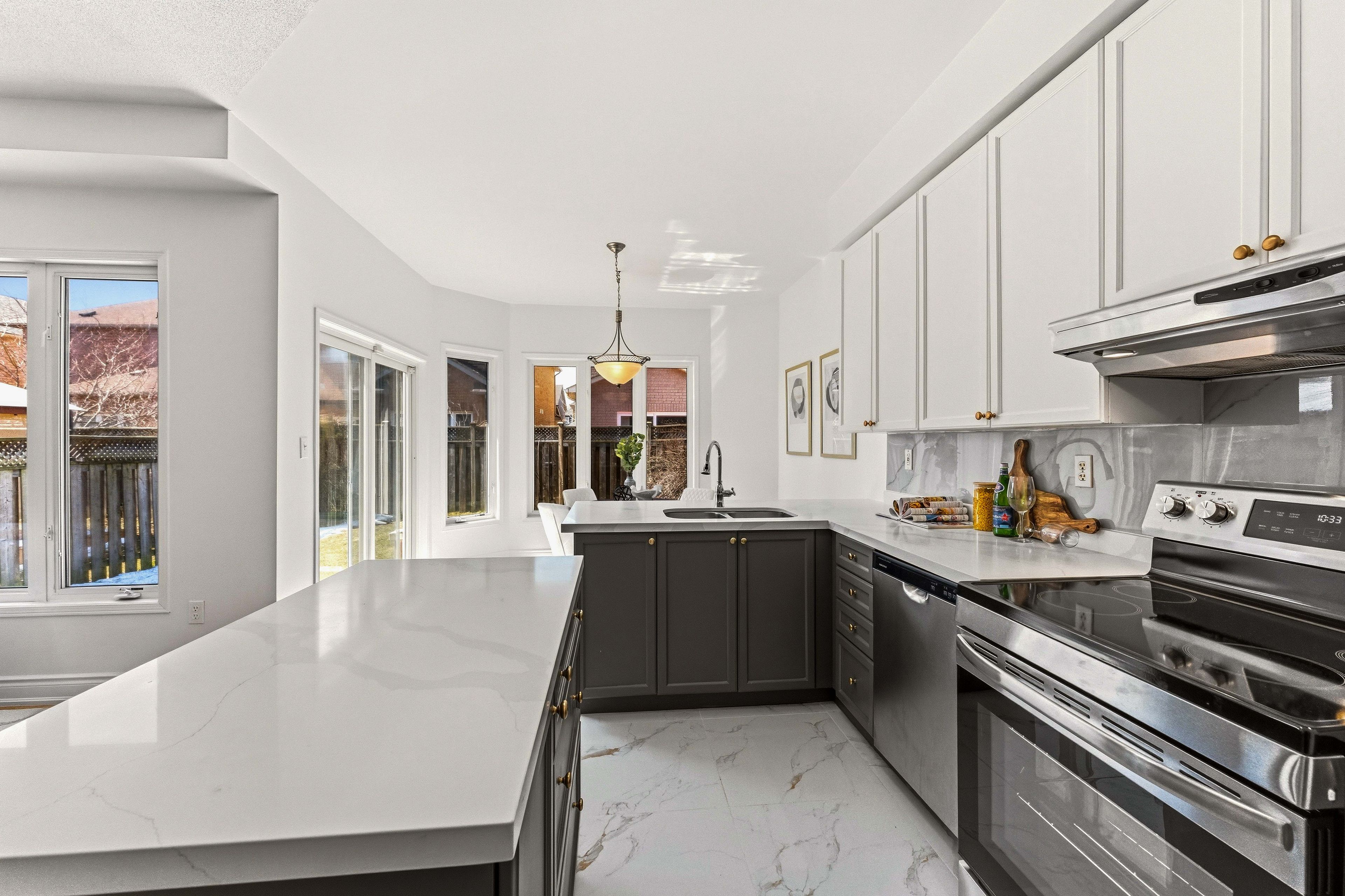 • Bright open-concept main floor with 9-ft ceilings and large windows.