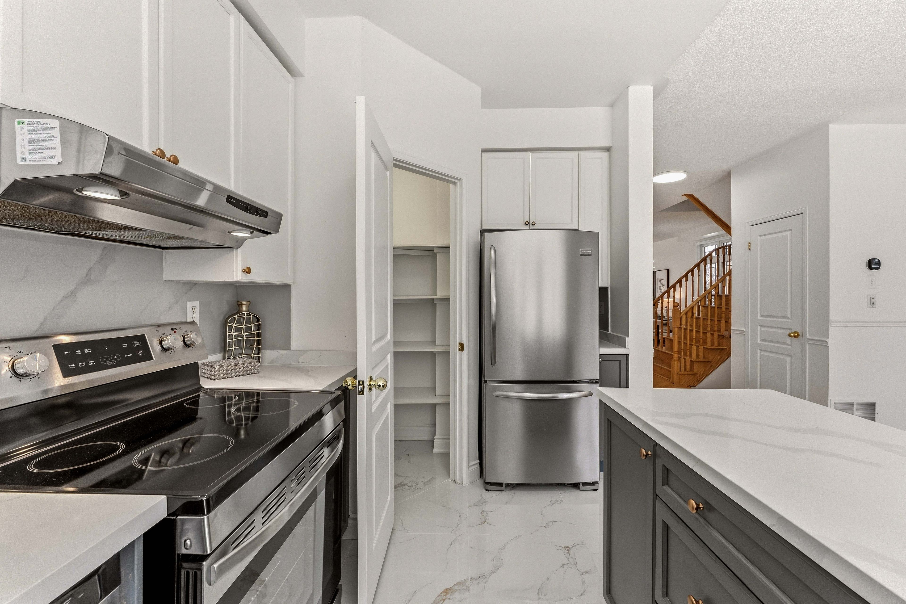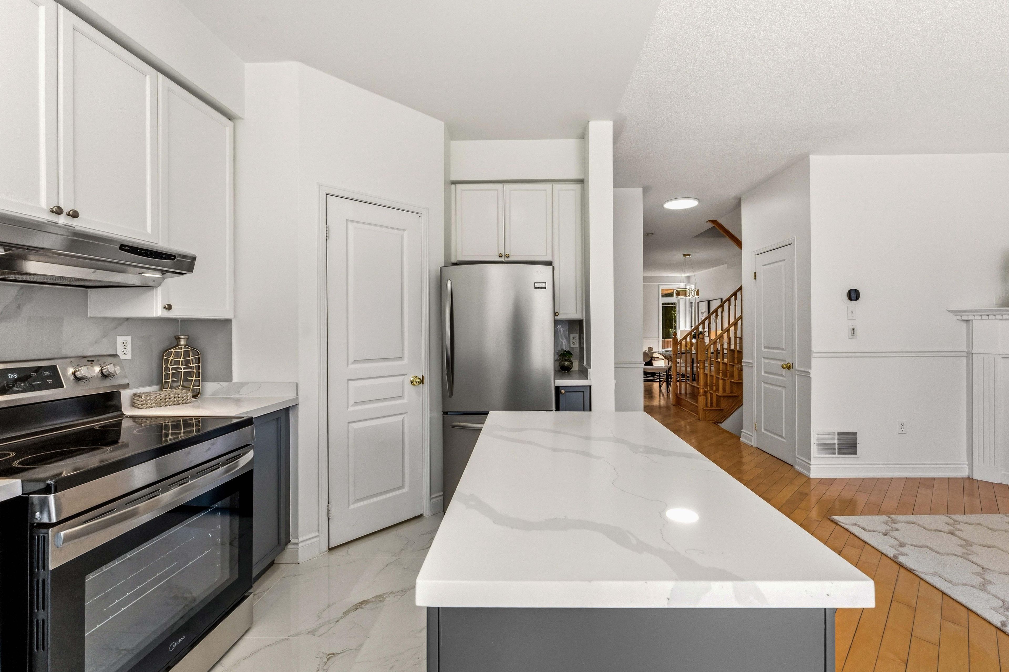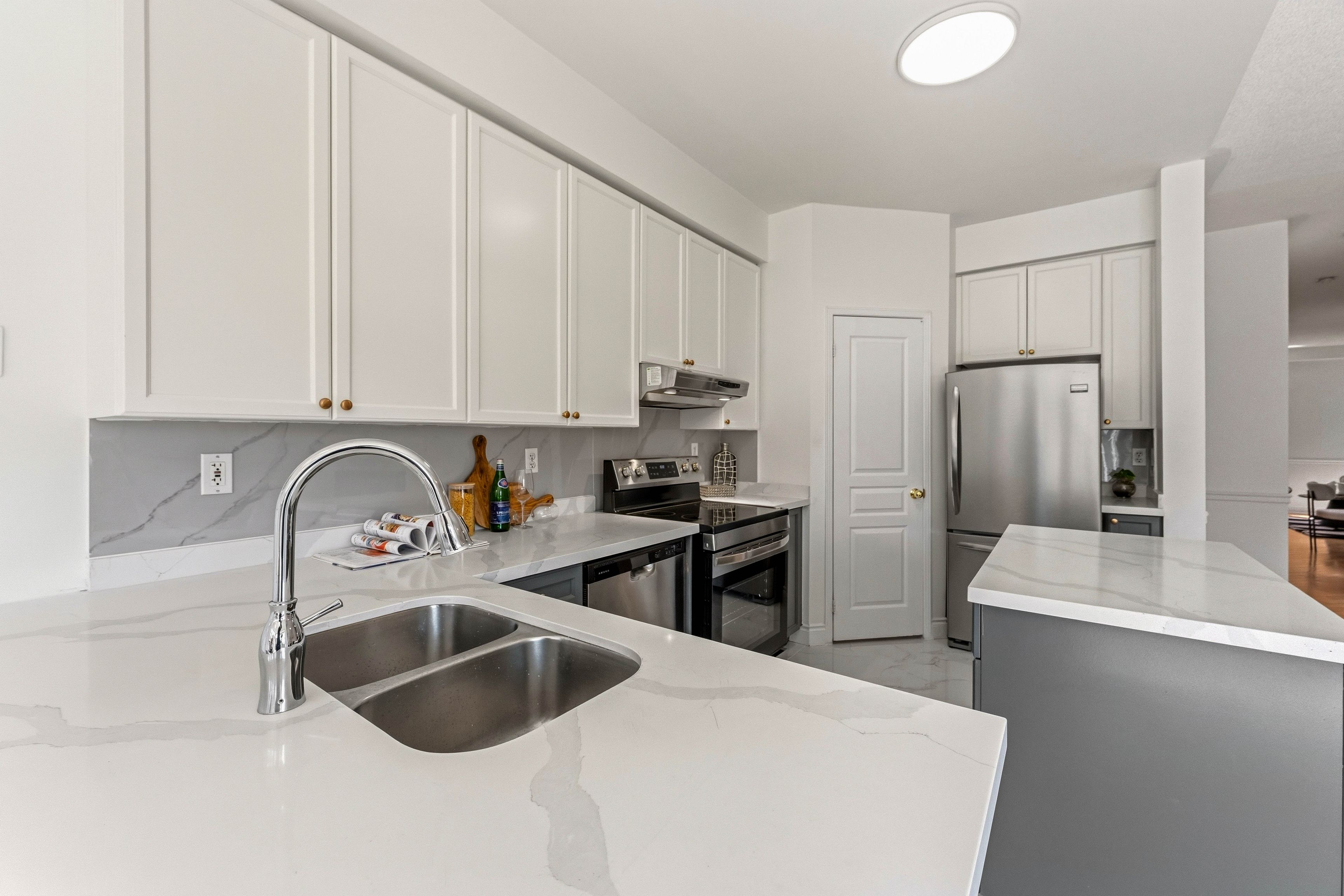 • Modern kitchen featuring marble countertops and updated cabinetry.