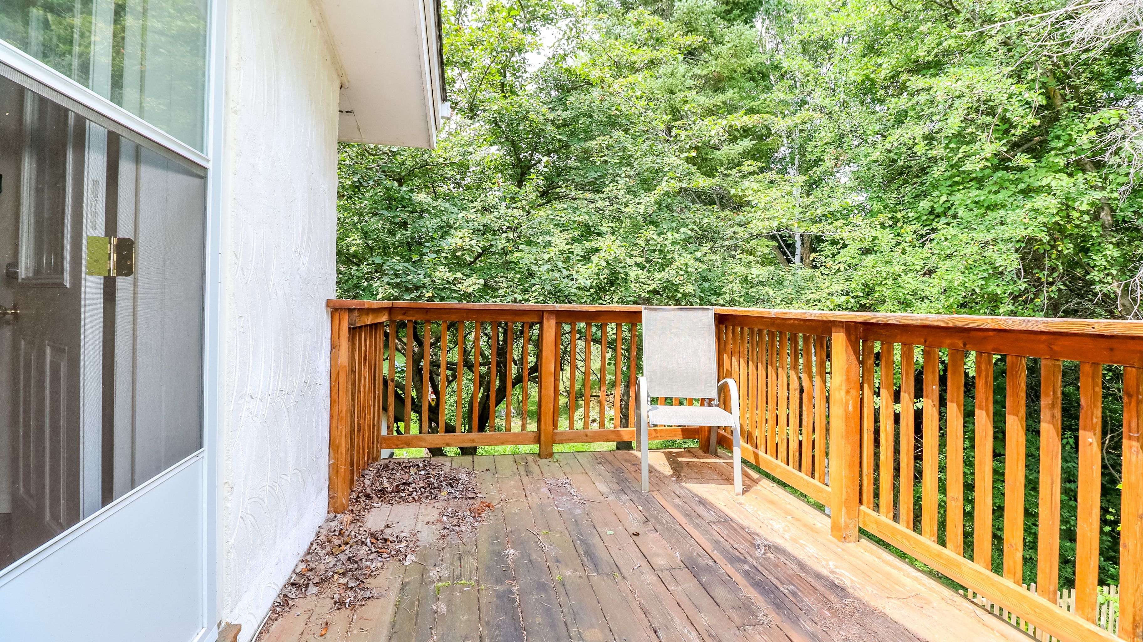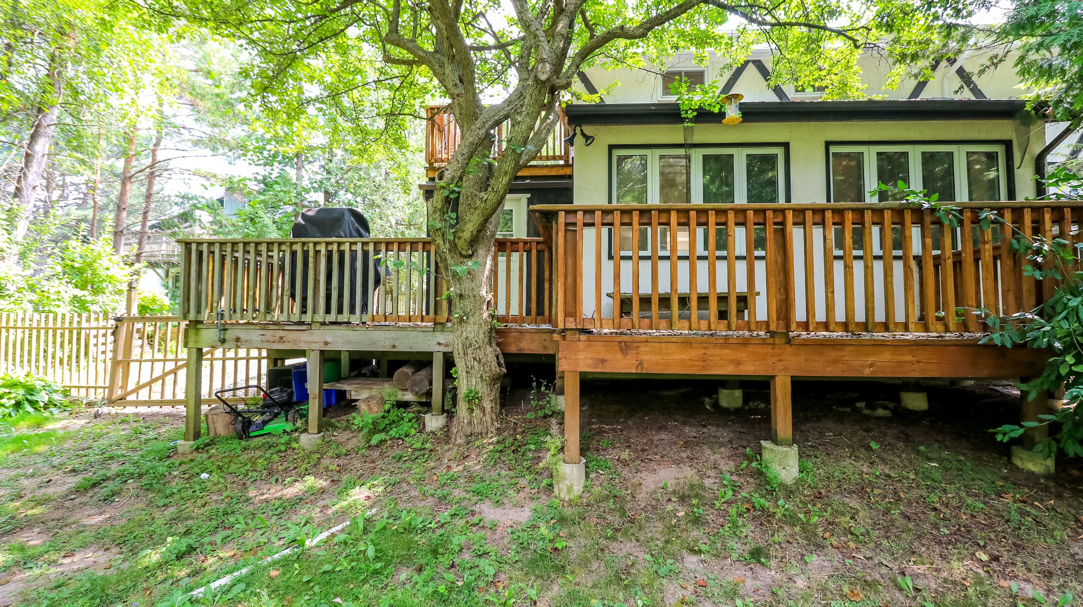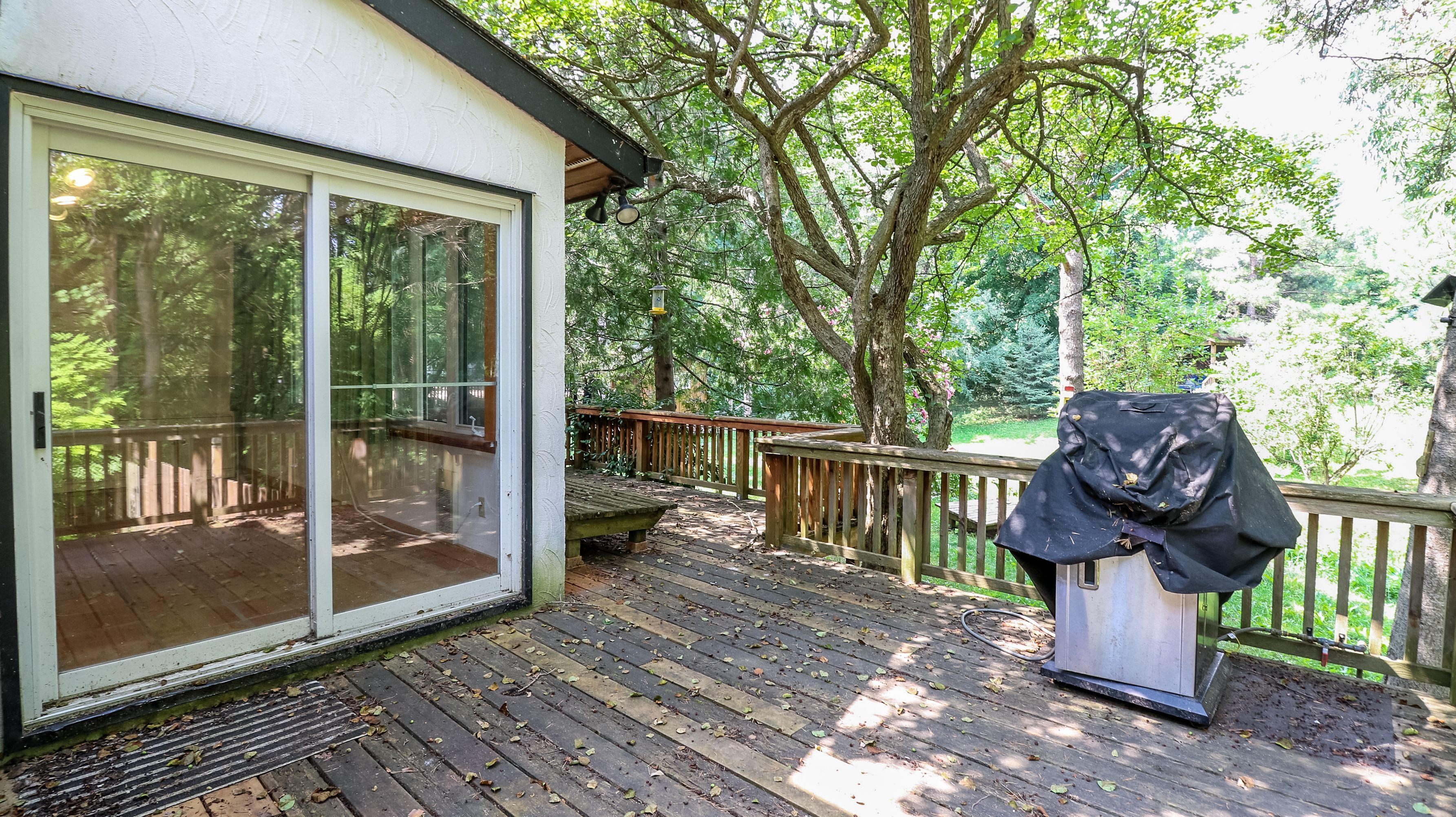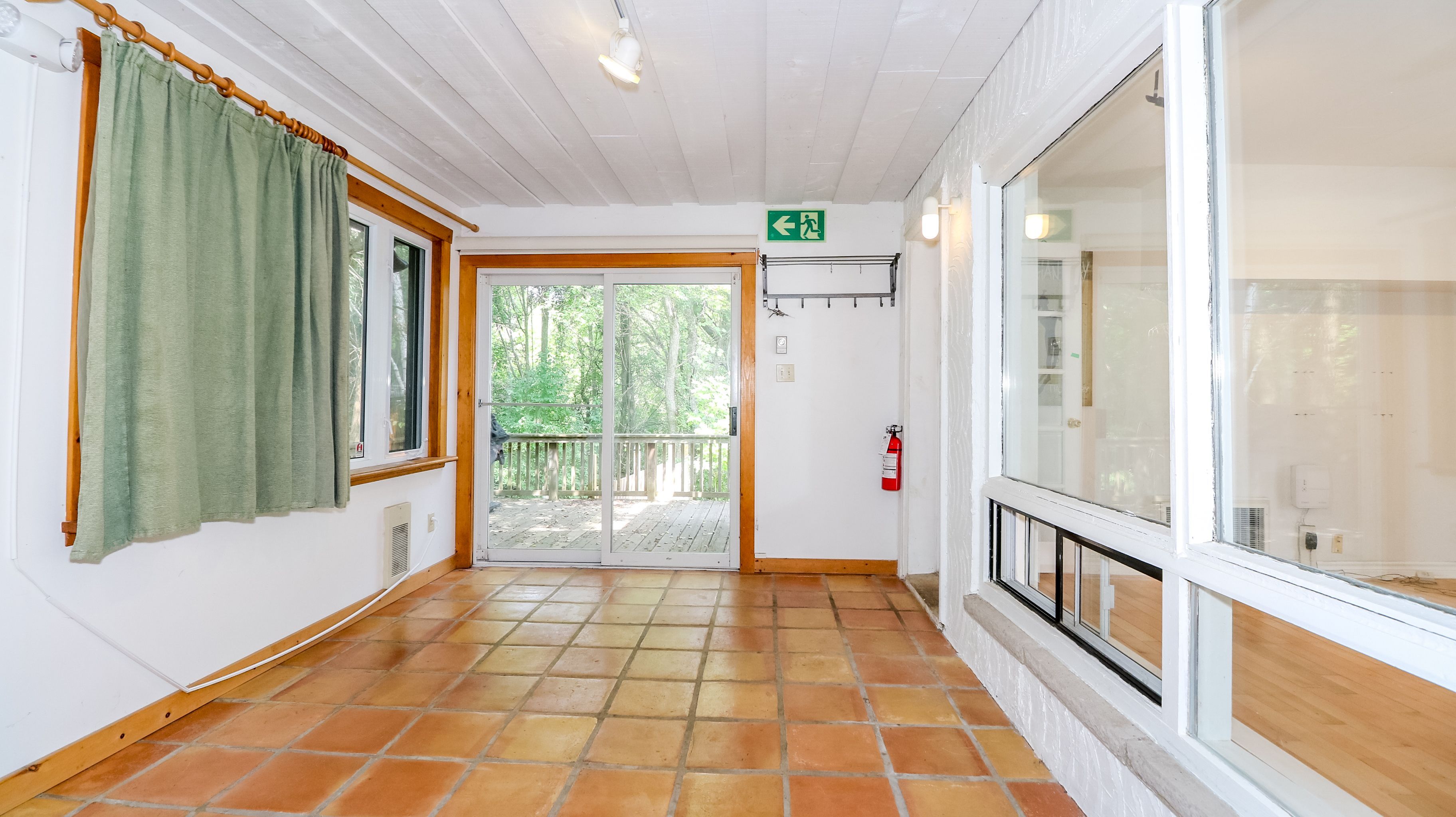 • Sunroom overlooking a deck and lush backyard for relaxation.