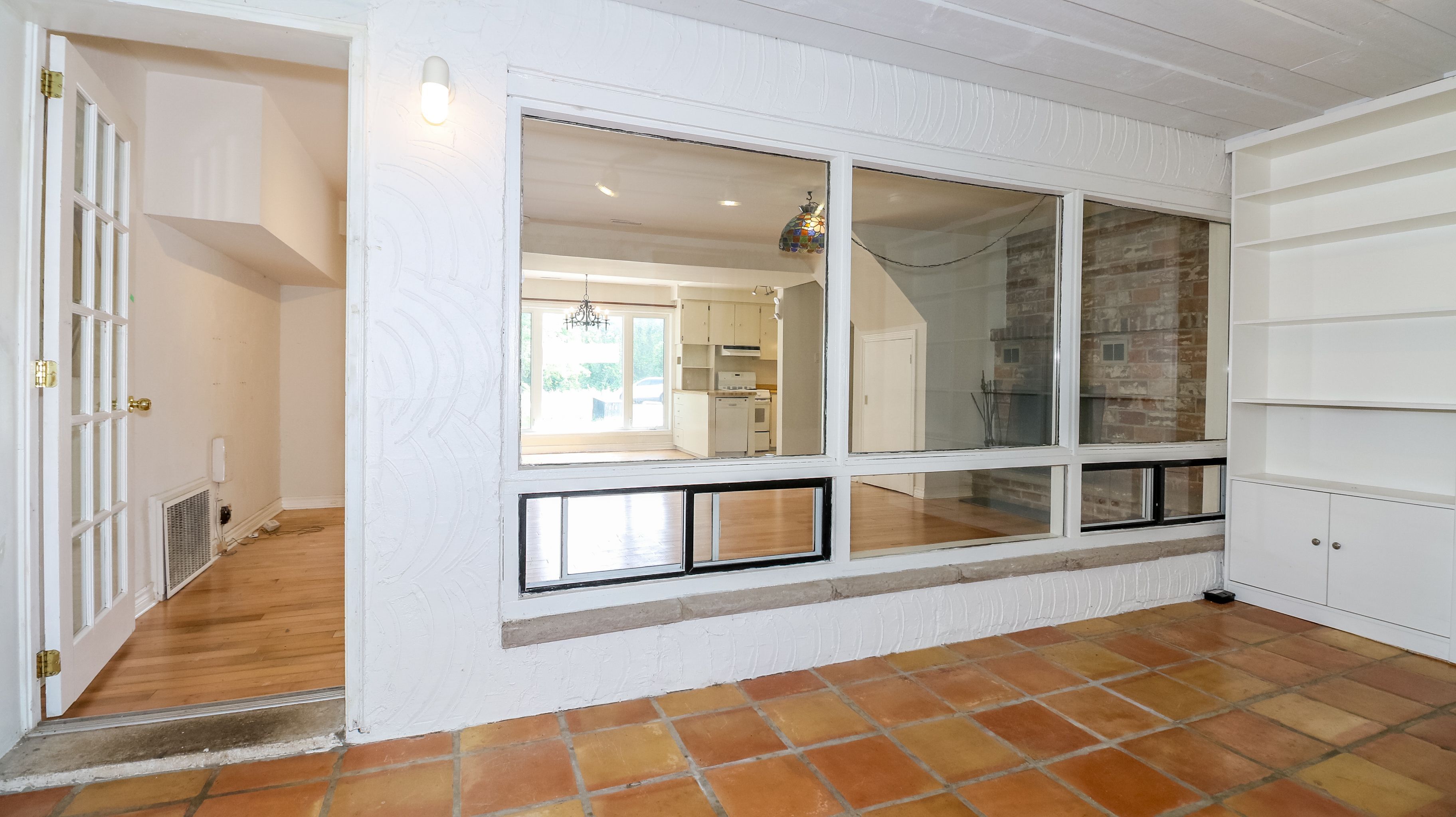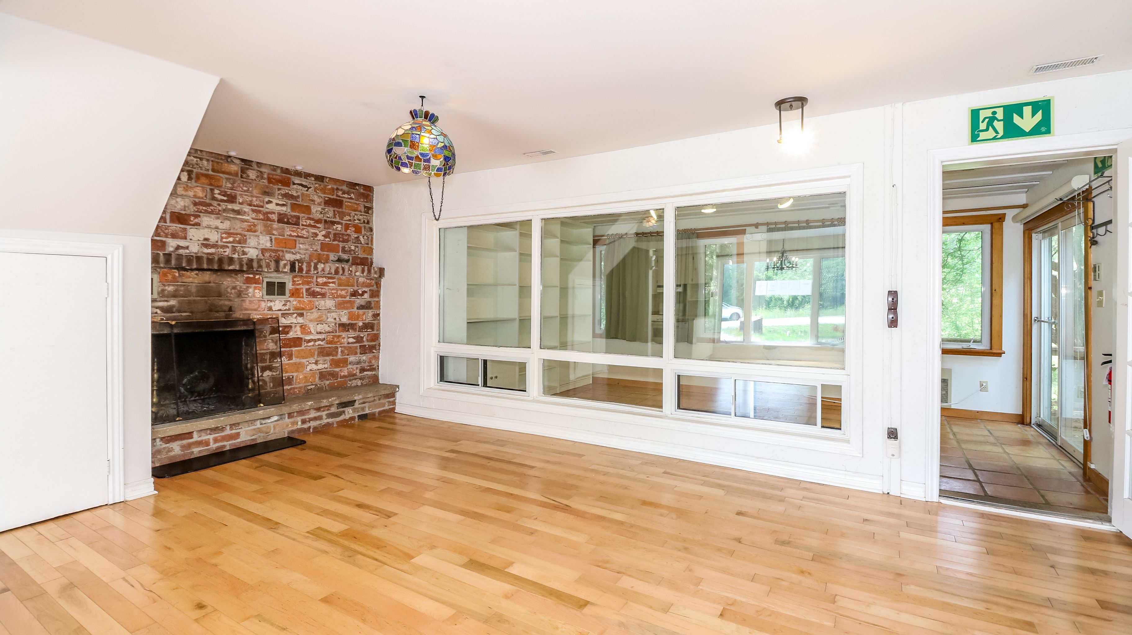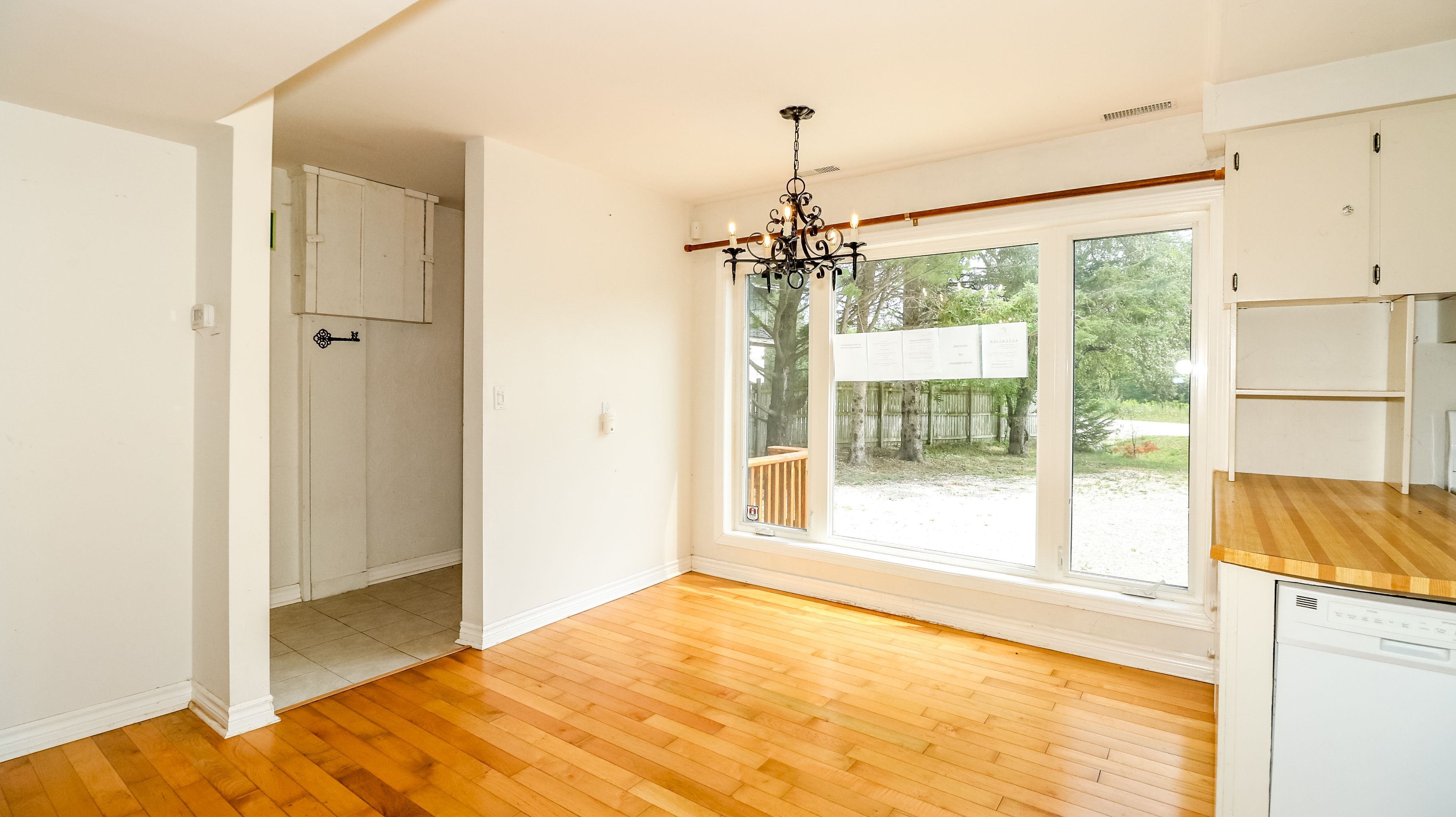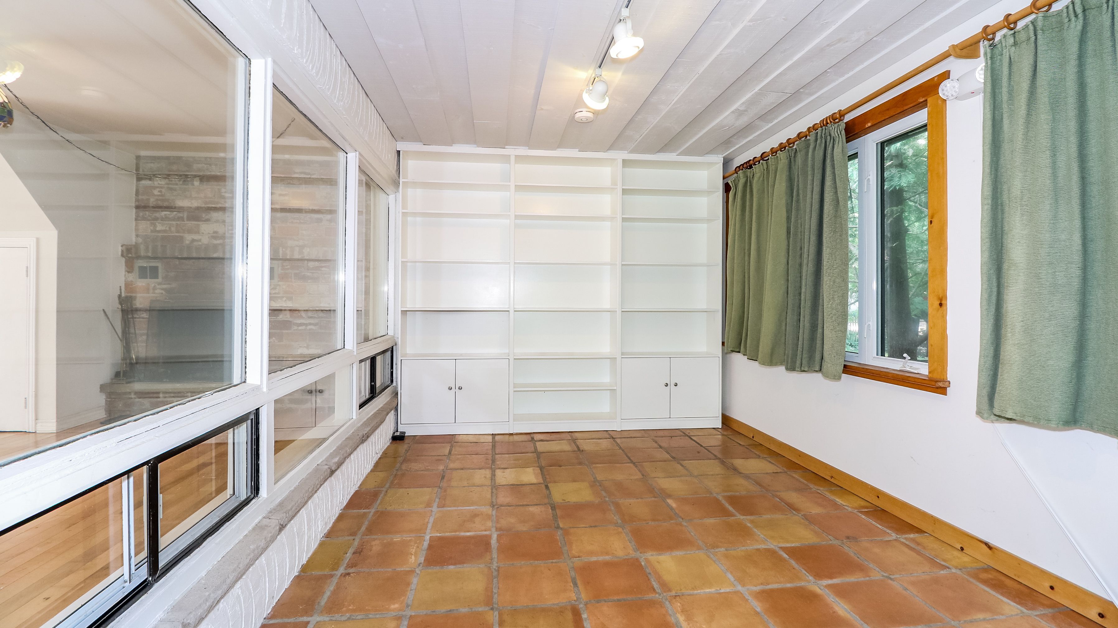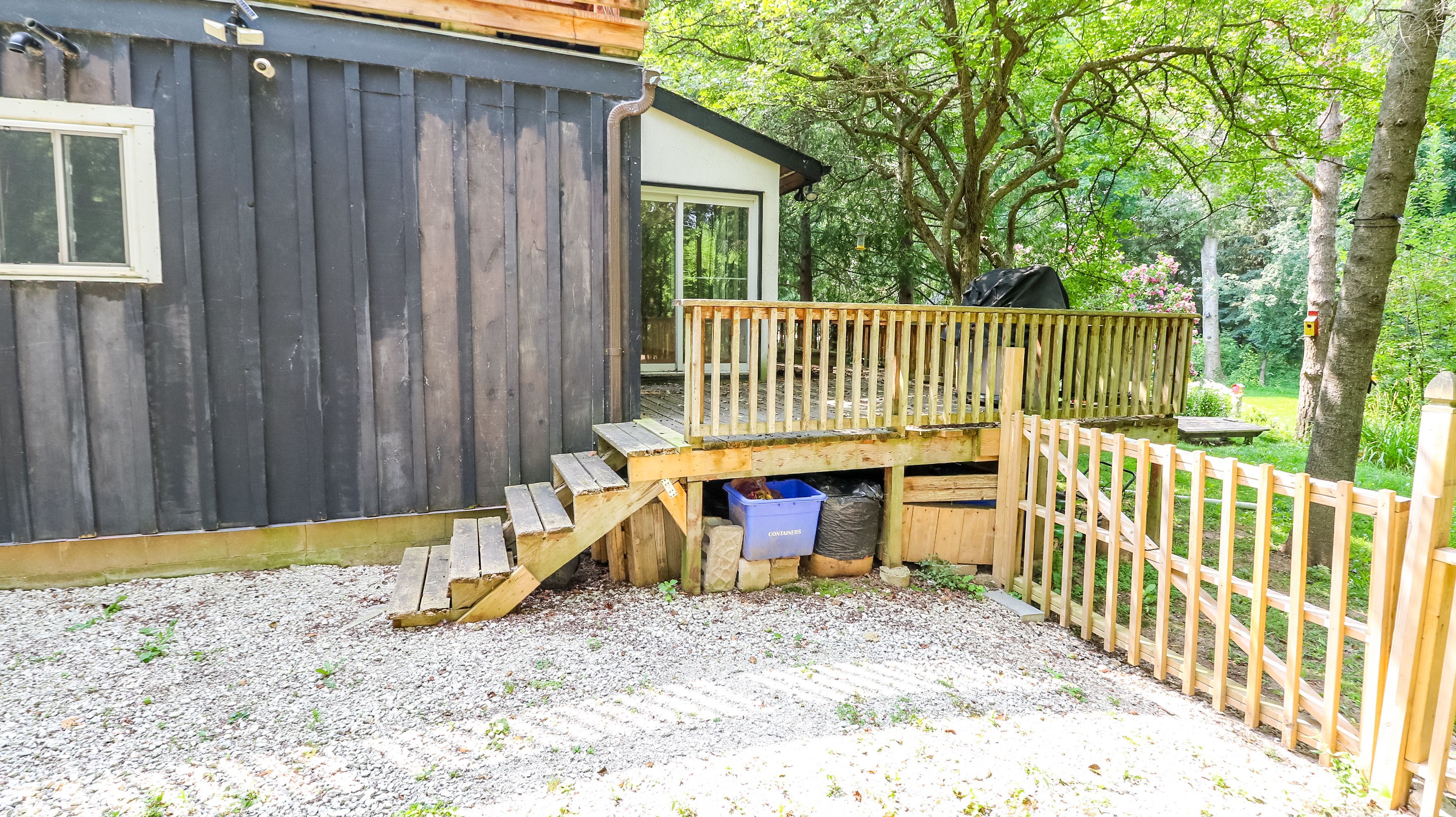 • Sunroom overlooking a deck and lush backyard for relaxation.