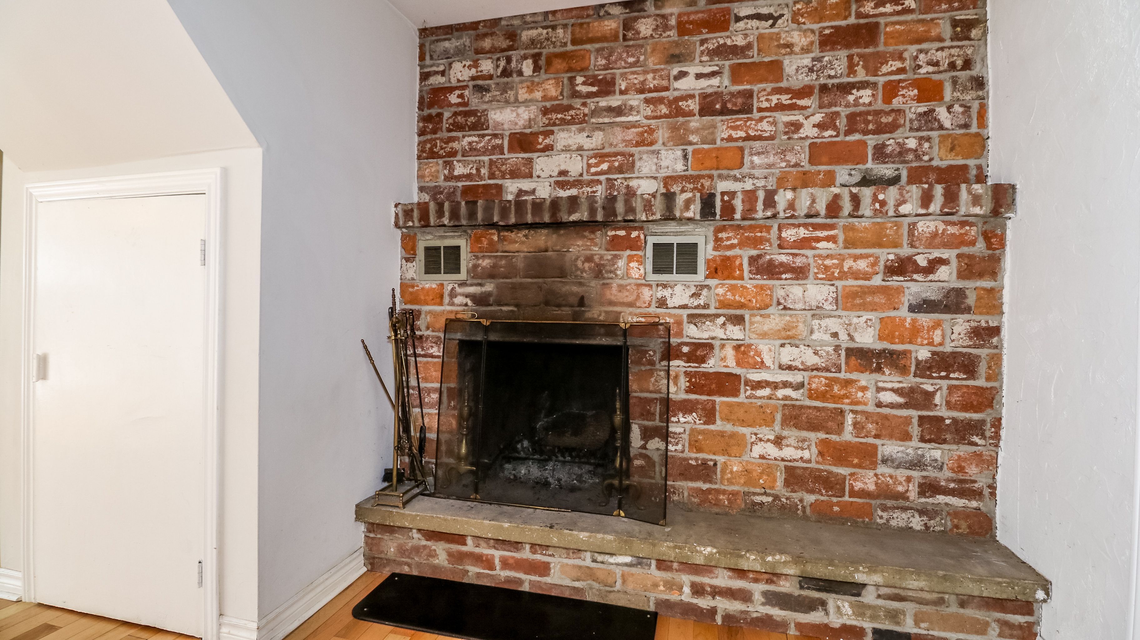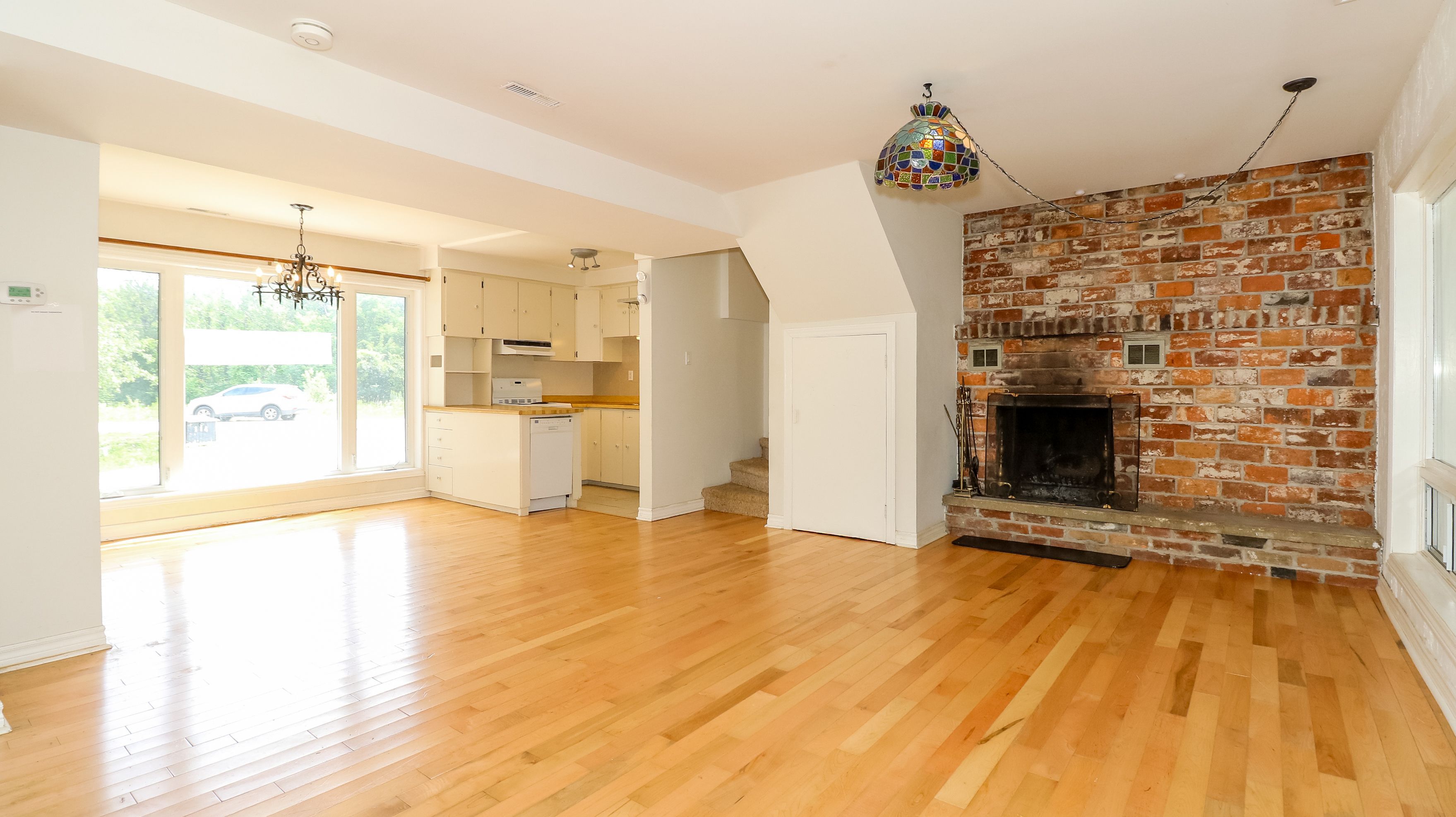 • Open concept kitchen, dining, and living area with a wood fireplace.