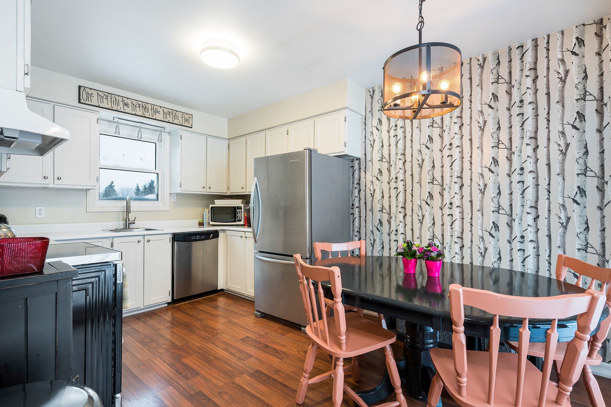 • Open concept kitchen and dining area with a wood-burning fireplace.