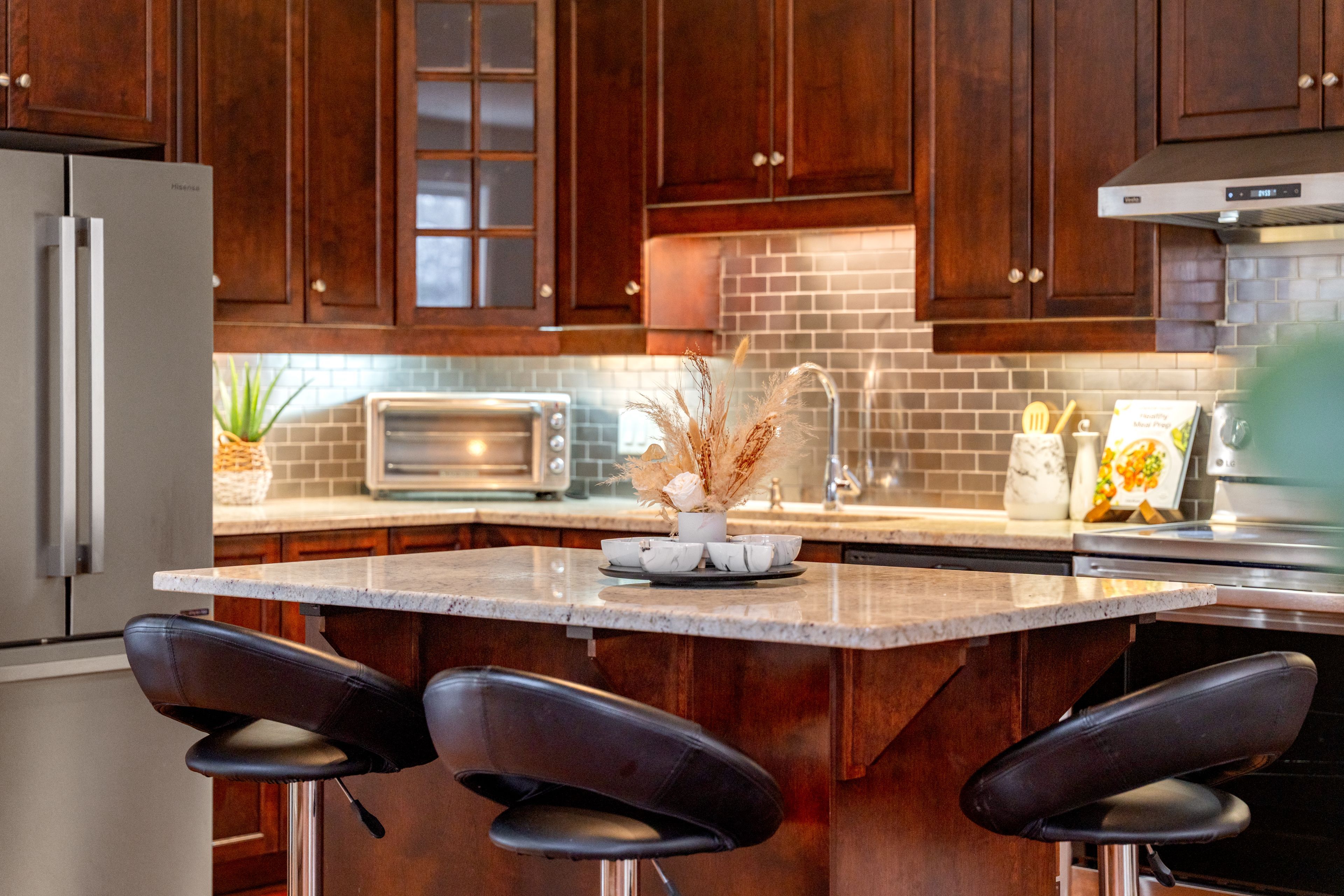 • Bright open-concept living space with impressive 9-ft ceilings.