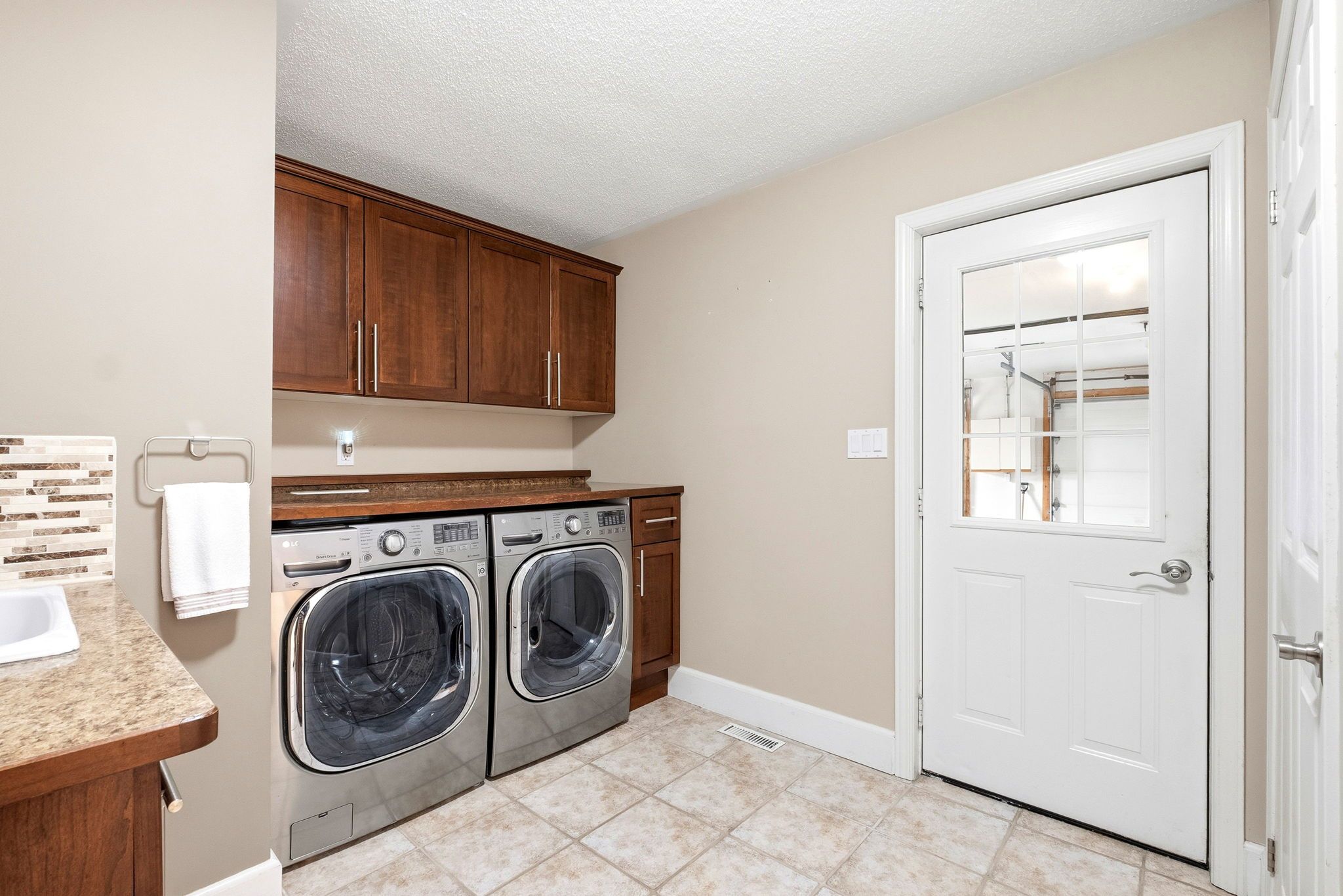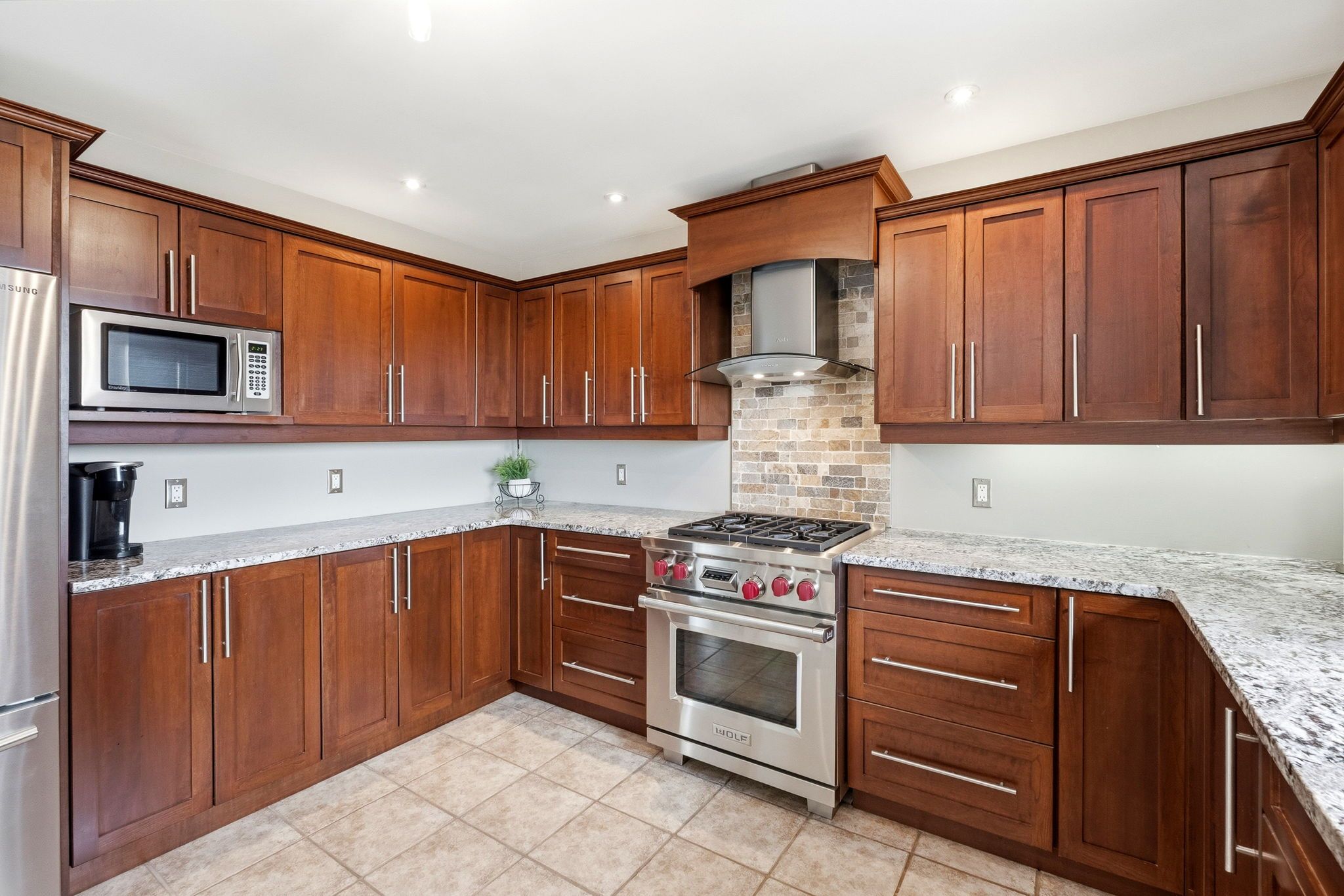 • Gourmet kitchen with professional-grade appliances and wine fridge.