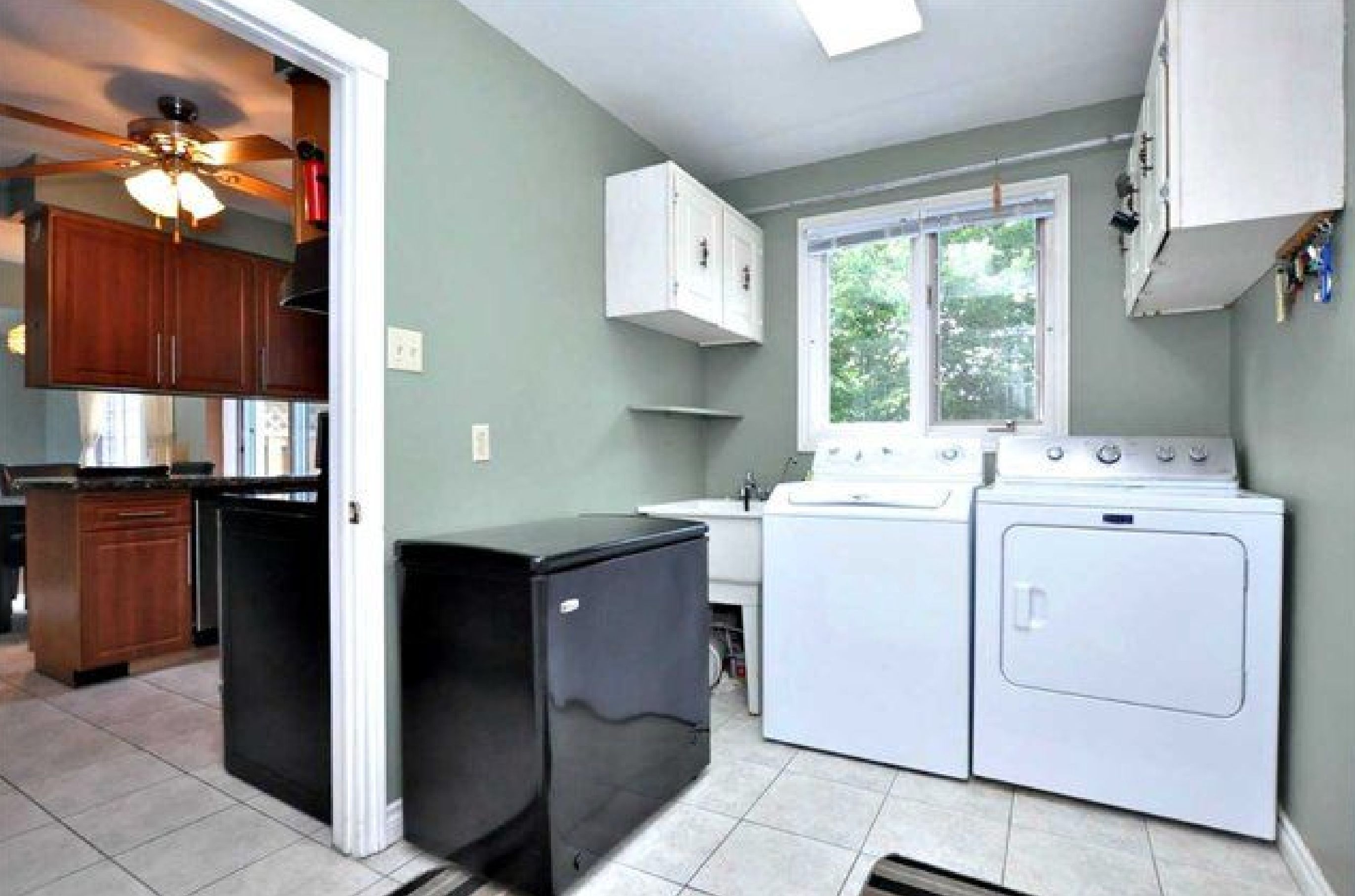 • Family room features cathedral ceilings, skylights, and a gas fireplace.