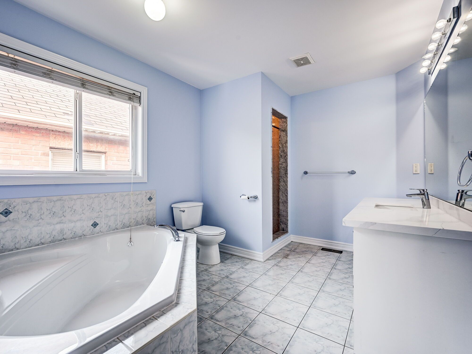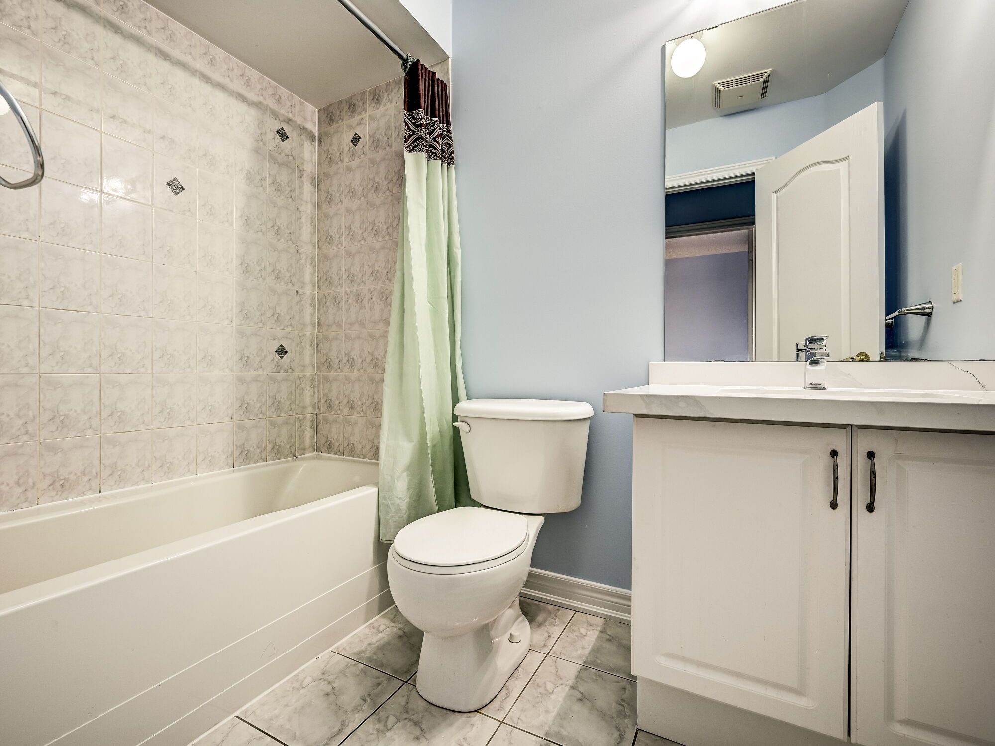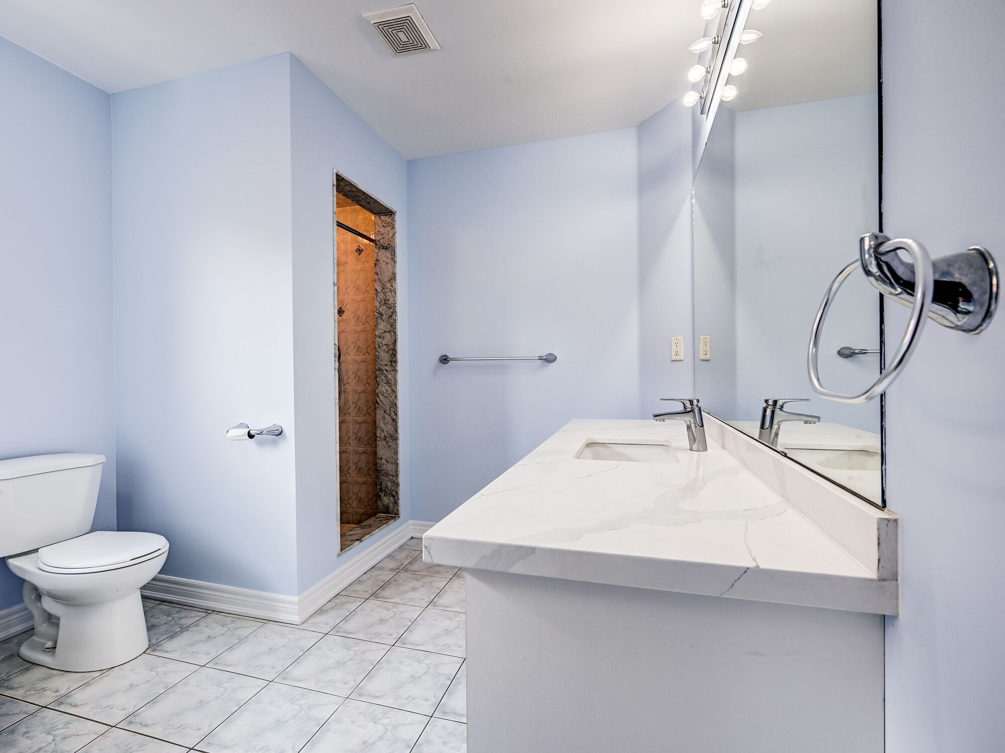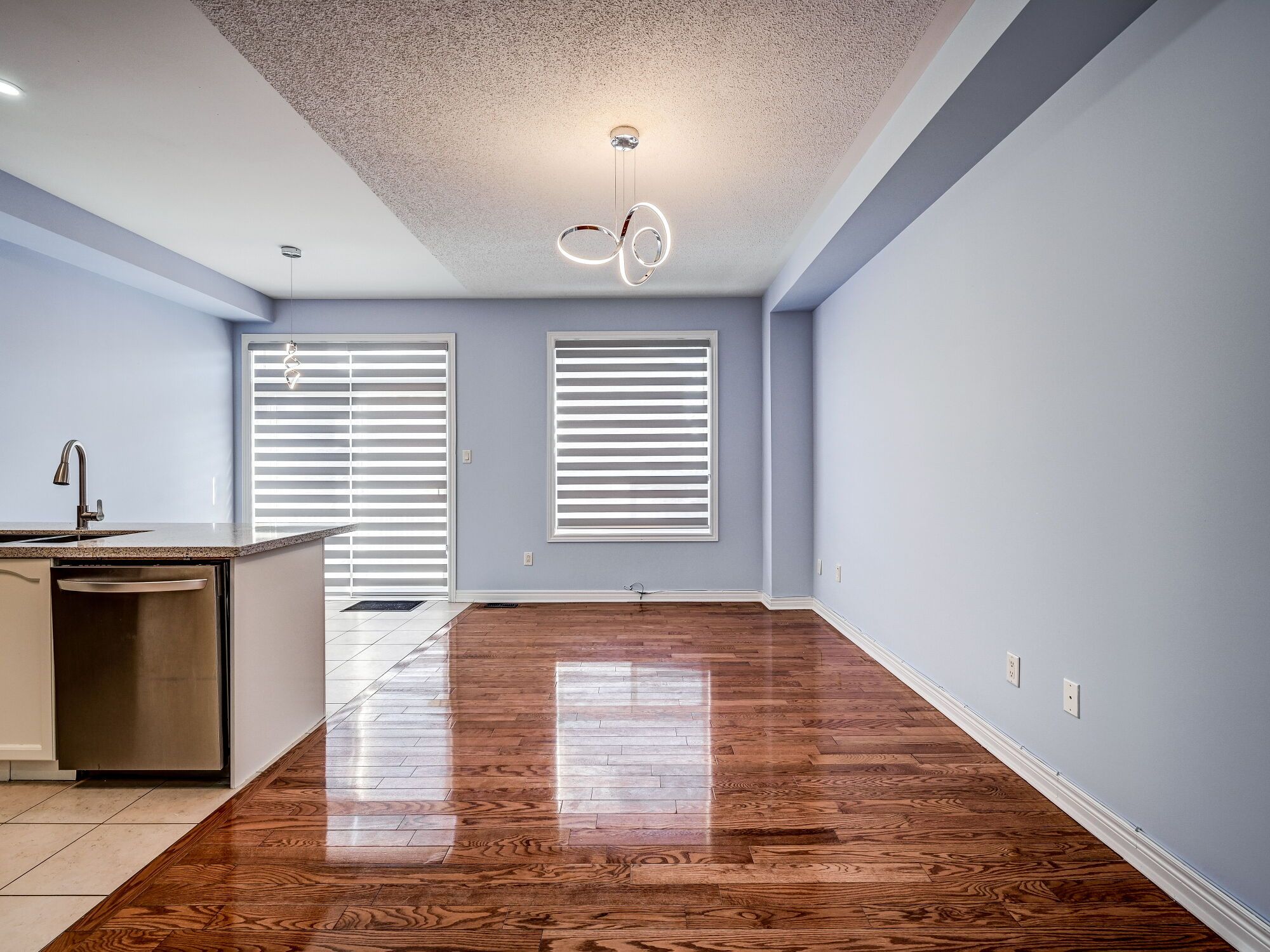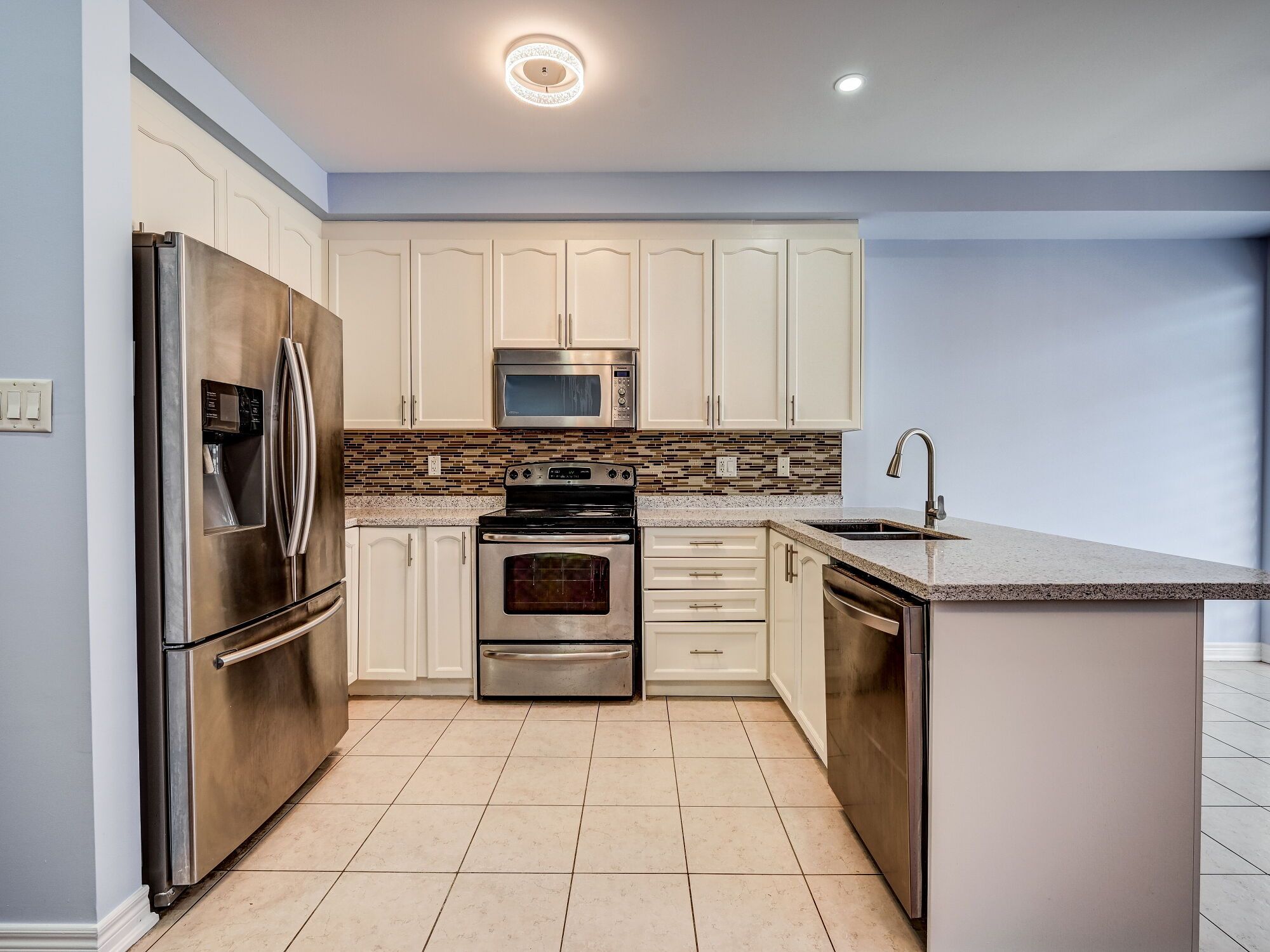 • Modern kitchen with quartz countertops and stylish backsplash.