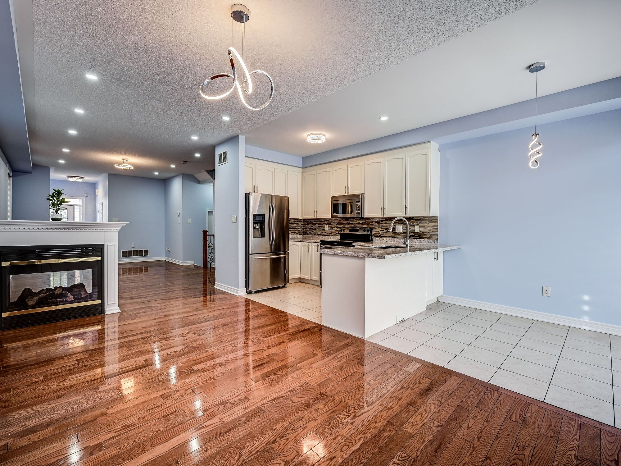 Location! Location! Location! Spacious semi-detached home in the desirable lakeland area featuring 3+1 large bedrooms and 4 bathrooms. The main floor offers 9ft ceilings, a huge family and living room with a beautiful double sided fireplace, and gleaming hardwood floors. The modern kitchen includes quartz countertops, stylish backsplash, and pot lights, perfect for everyday living and entertaining. The primary bedroom features a 4 piece ensuite and walk in closet, plus convenient access to the garage from inside the home. Ideally located close to all essential amenities including hwy 410, go transit, schools, shopping, and parks.