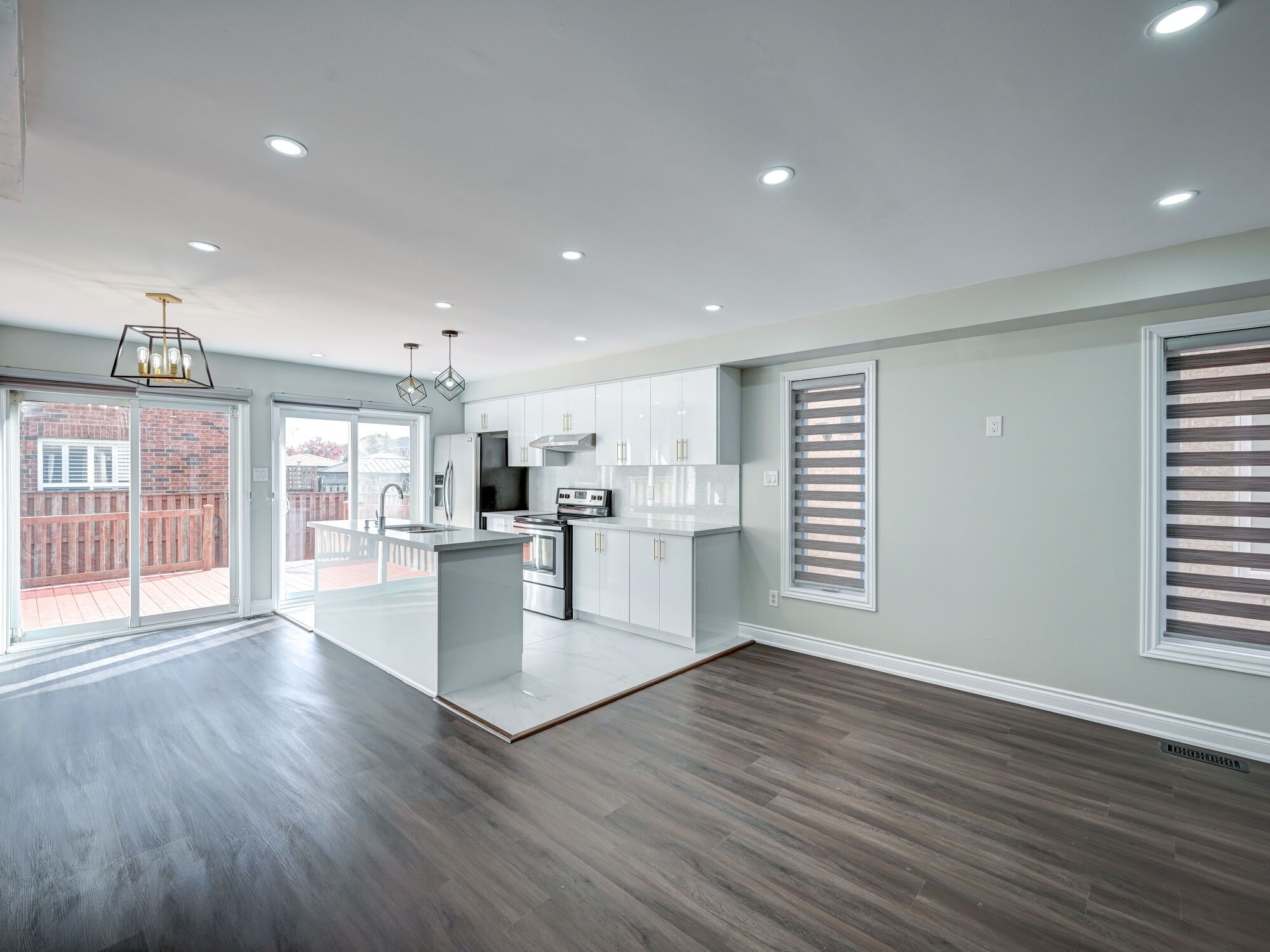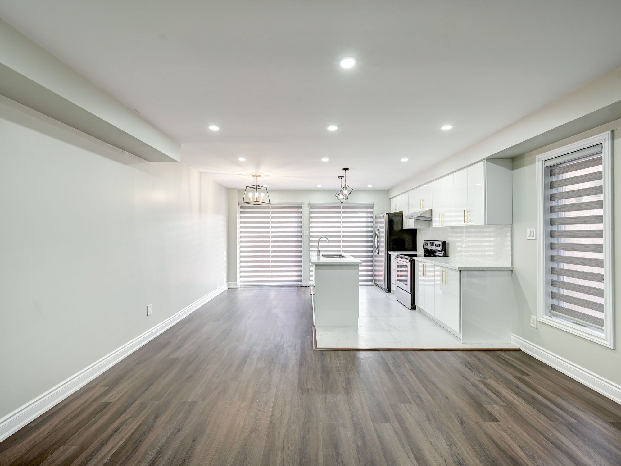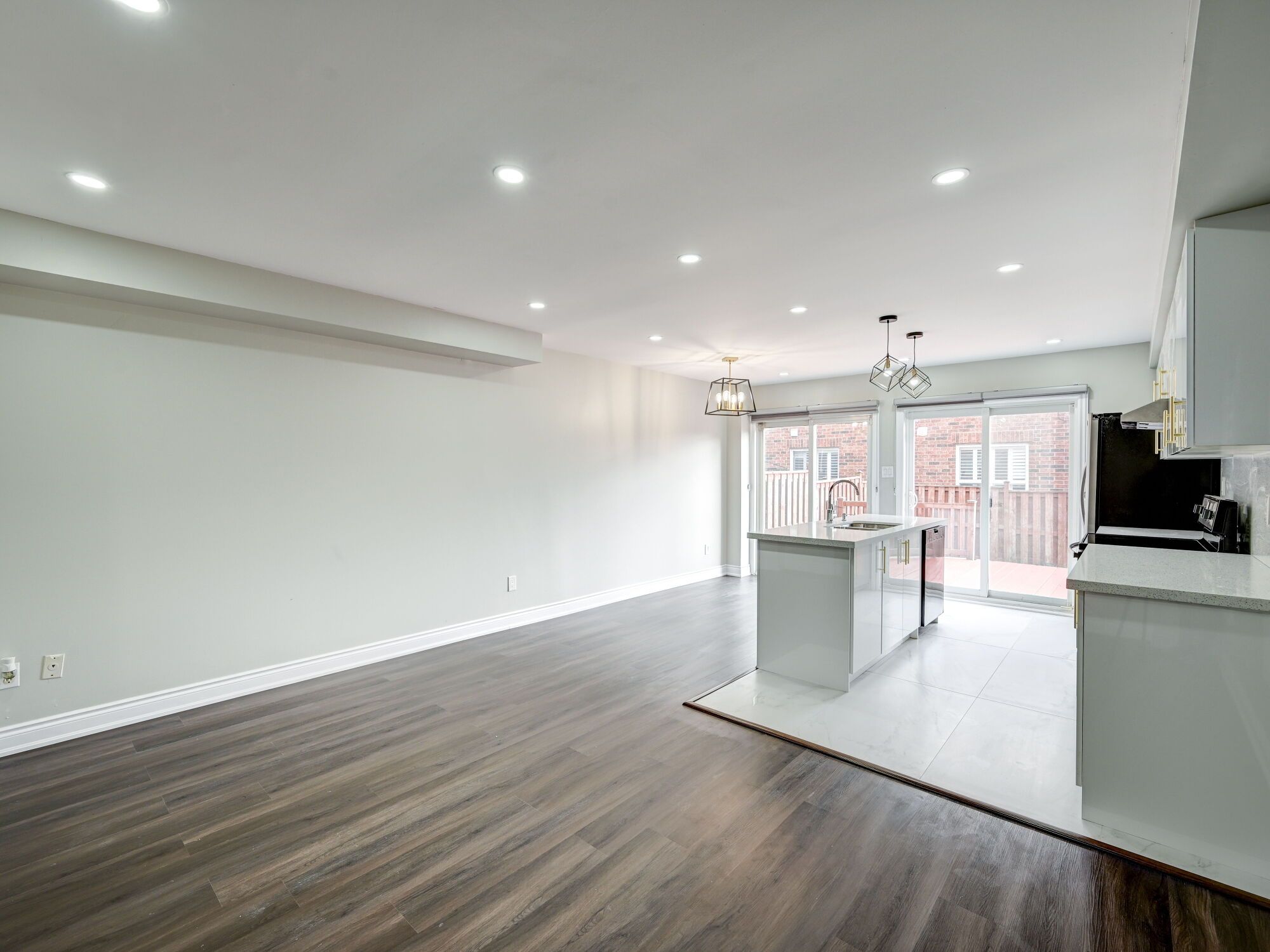 • Open concept living area with upgraded vinyl flooring and a modern kitchen.