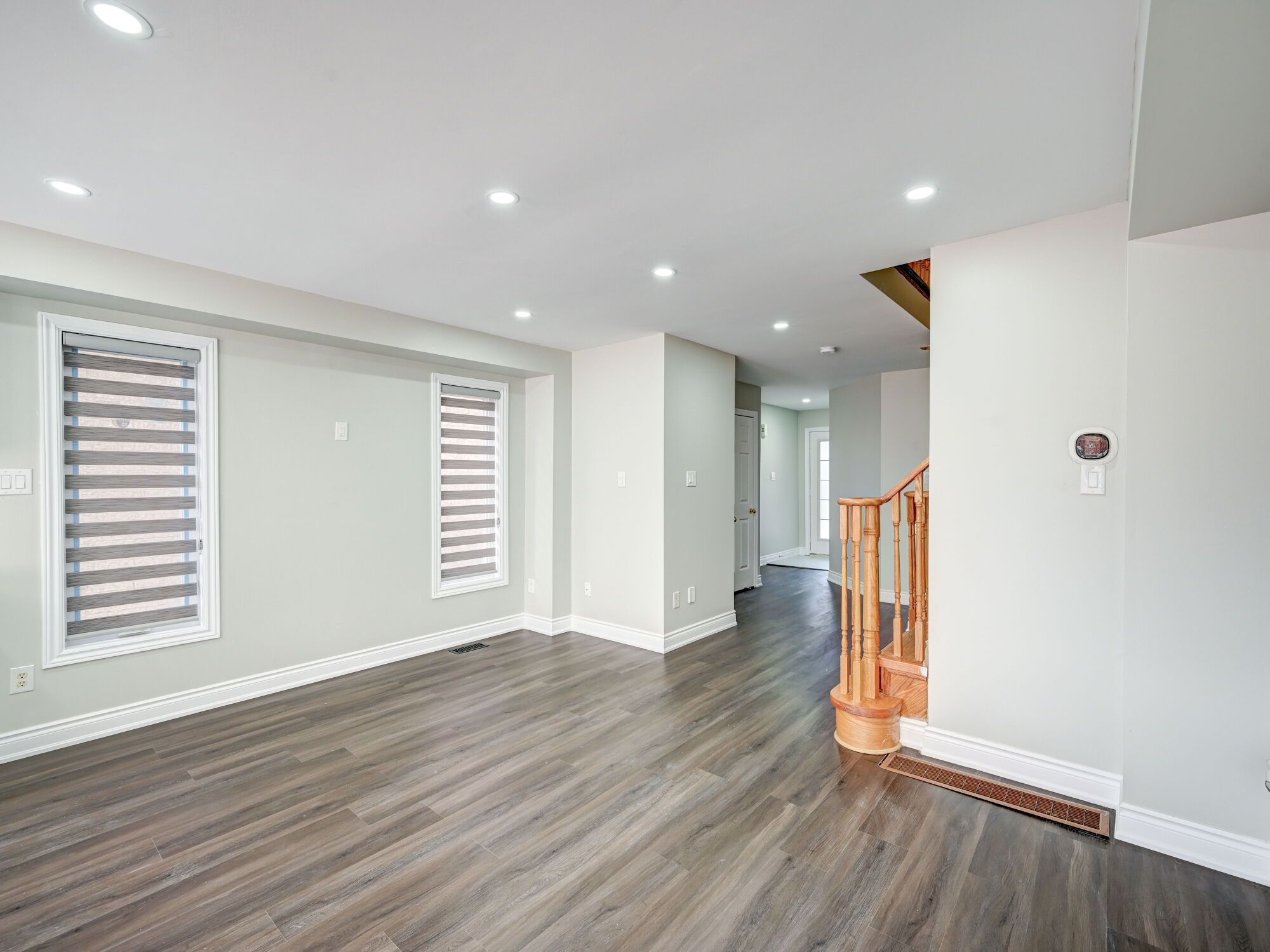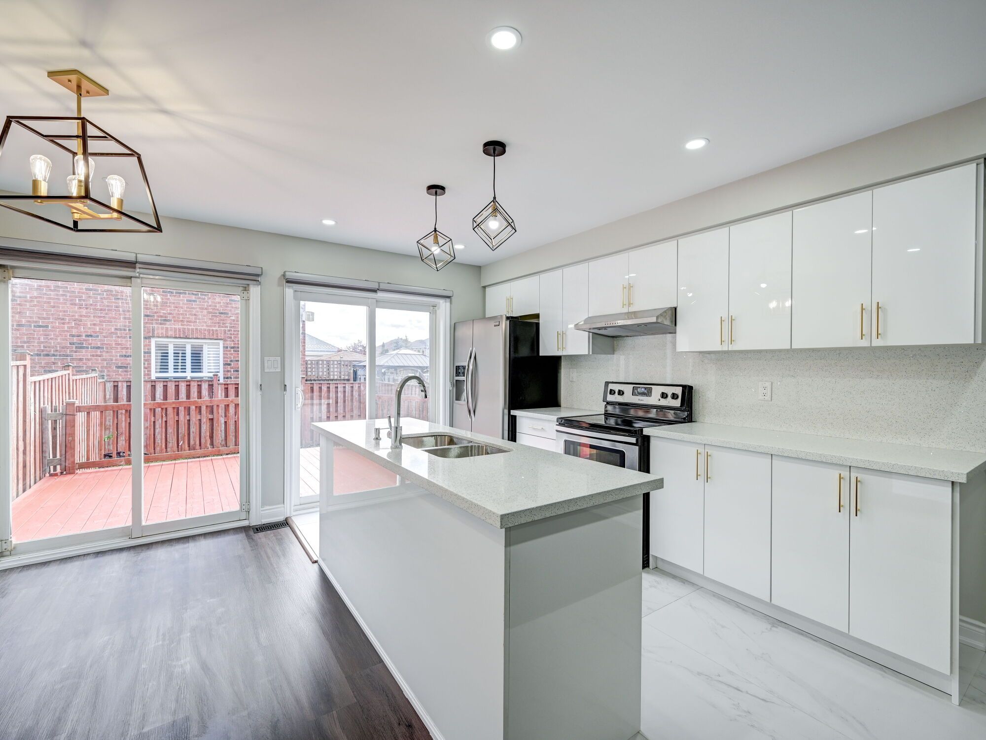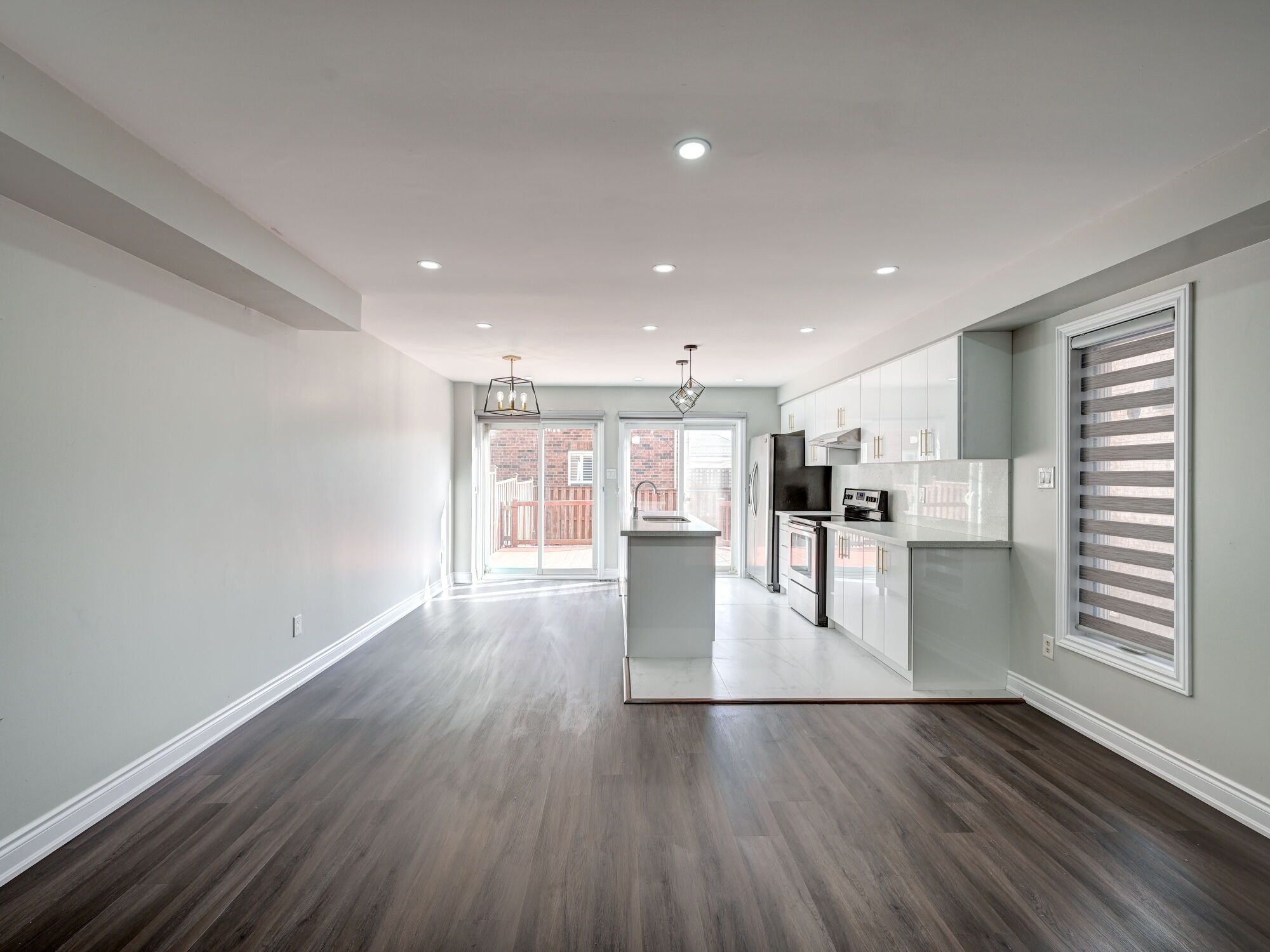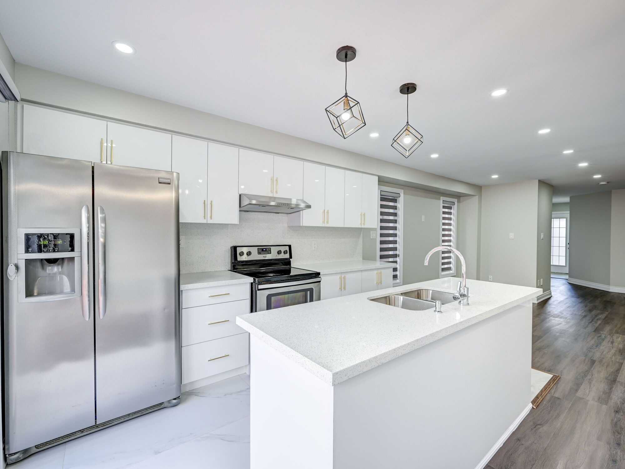 • Open concept living area with upgraded vinyl flooring and a modern kitchen.