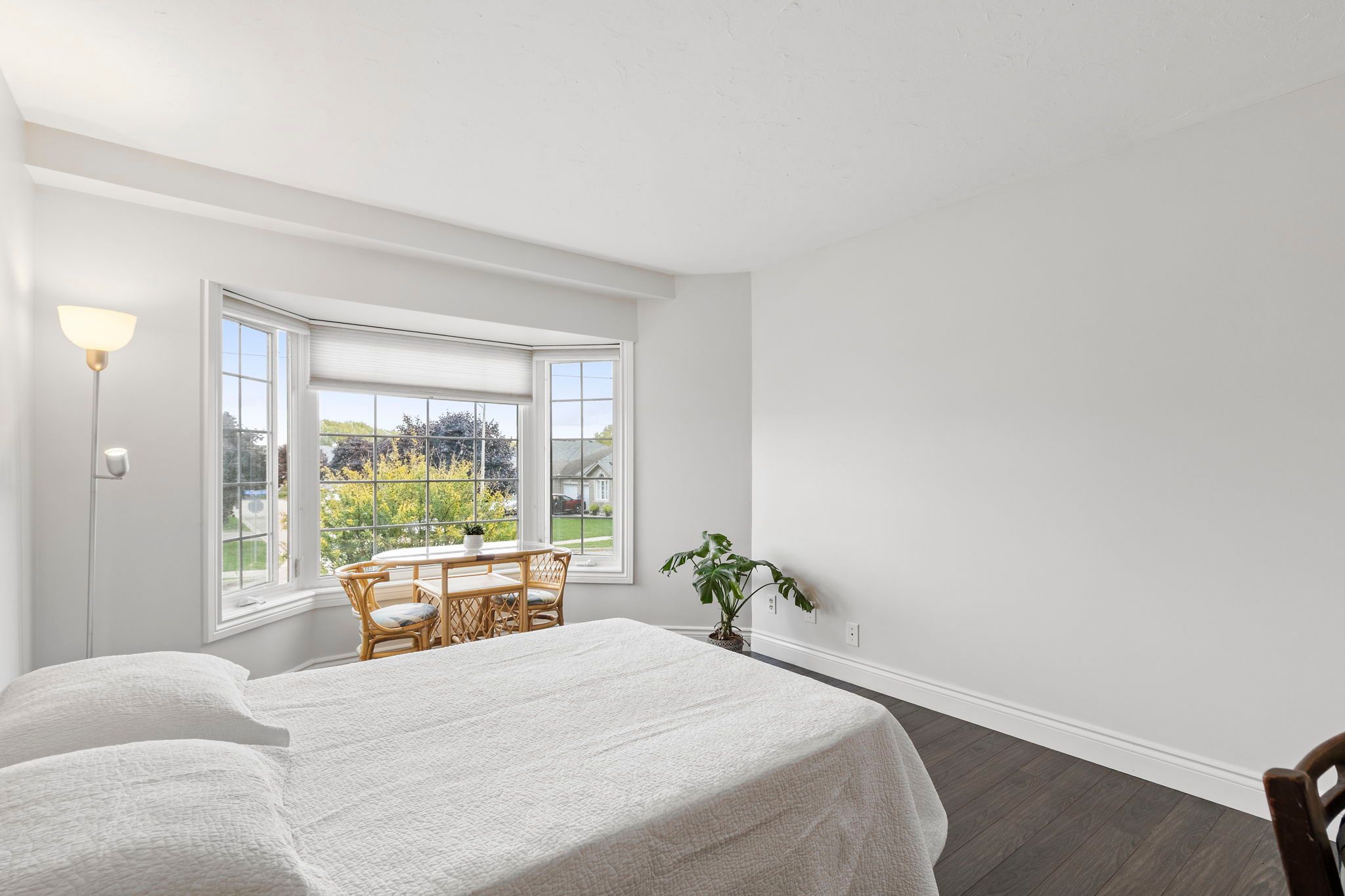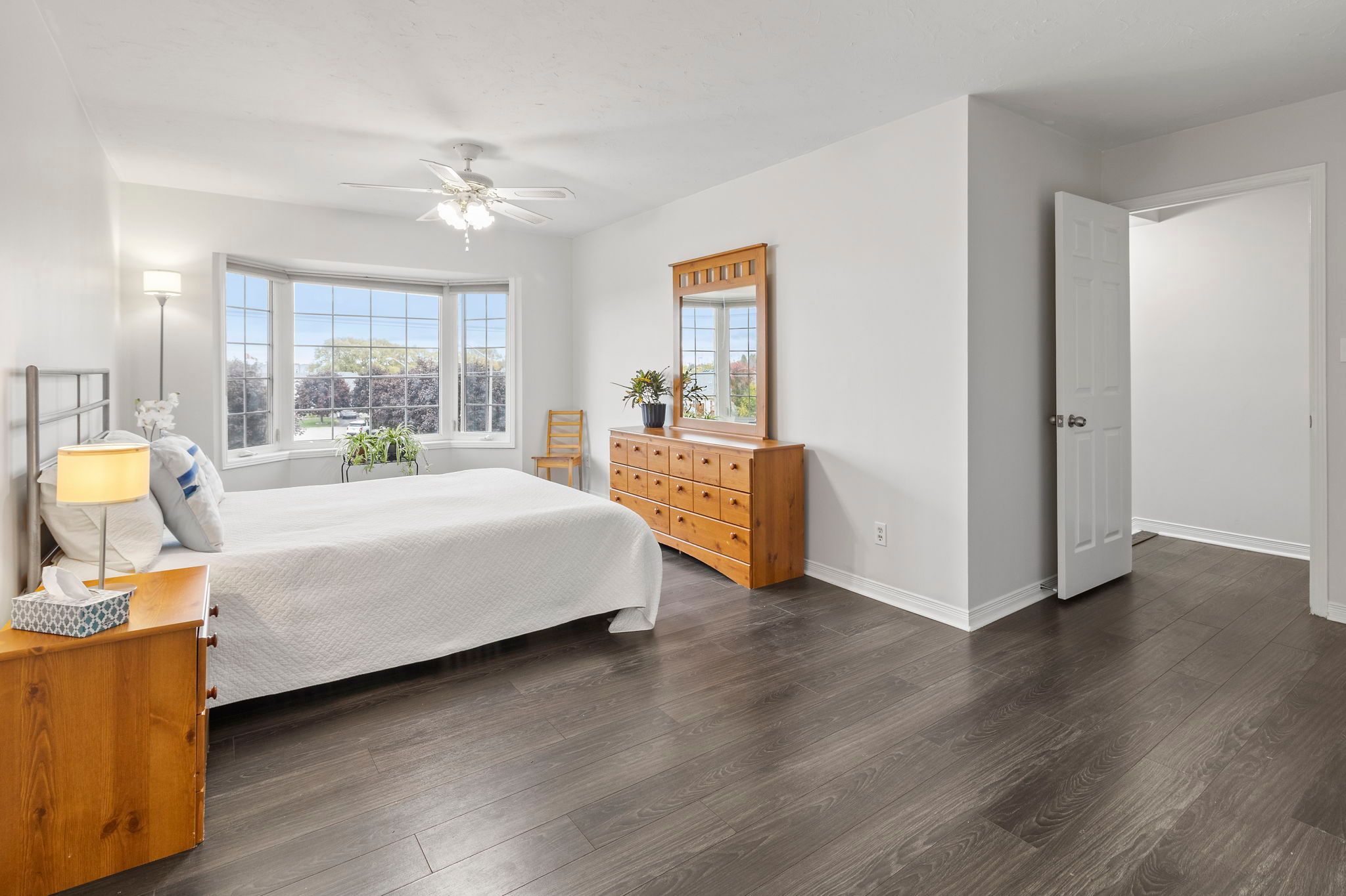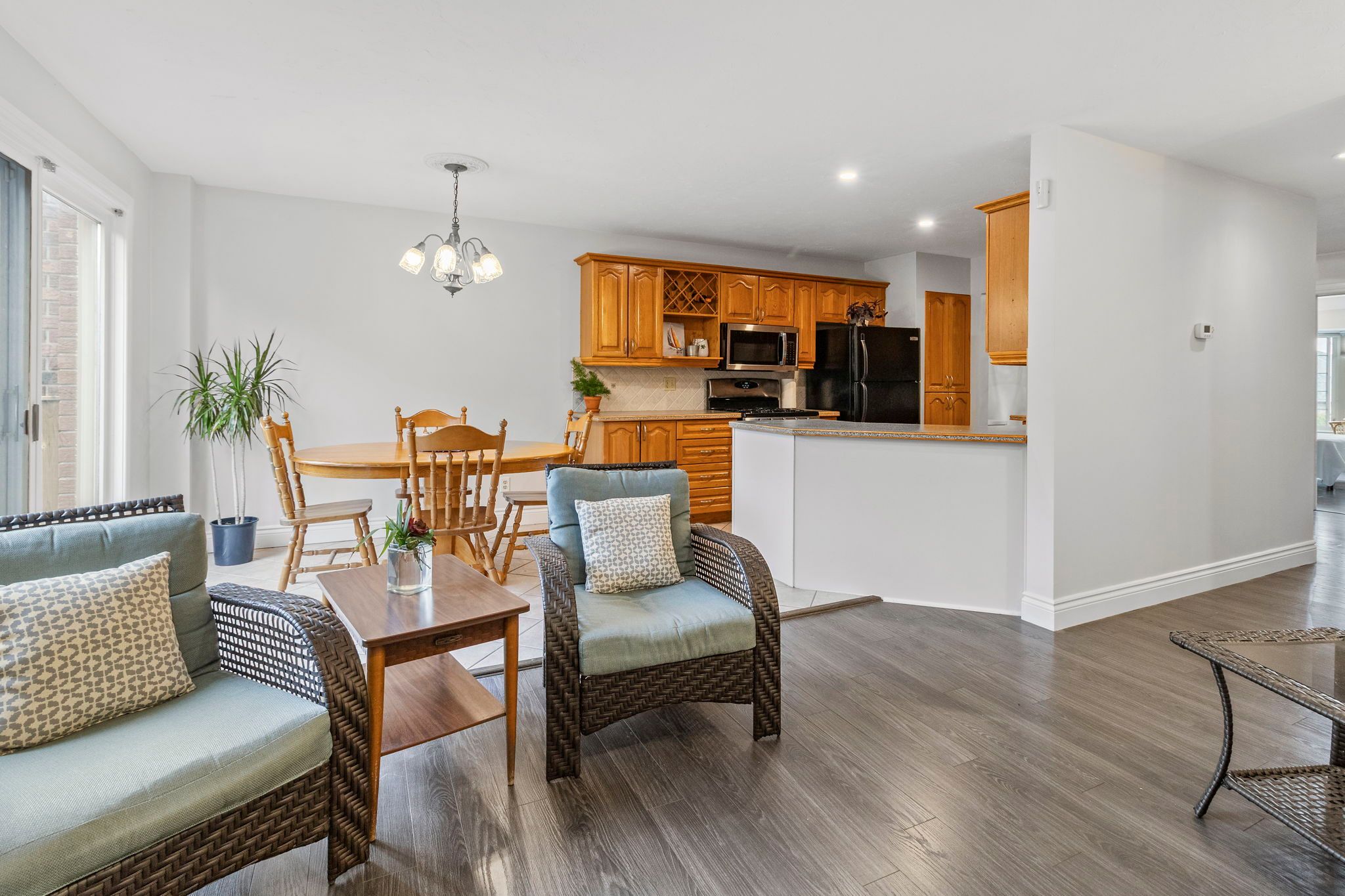 The expression "don't judge a book by its cover" applies here! These bright and spacious executive townhomes will surprise you with over 2300 sf of finished living space over 3 levels. A main floor triple patio door to a balcony and a ground level patio door to the beautiful backyard. With many large updated vinyl windows (2 walk-in bow picture windows) there is plenty of natural light throughout. The front yard has been developed with attractive gardens edged with beautiful stone edging. The foyer has a beautiful custom ceramic tile inlay you will love. The main floor boasts an oak kitchen with plenty of storage, a wine rack, pullout drawers, custom pullout pantry, under cabinet lighting, gas stove and new microwave range hood. The kitchen peninsula keeps you connected with family/guests enjoying the dining or the family room which features a natural gas fireplace & mantel. The spacious main floor living room can be used as a bedroom or home office. The main floor large 2pce bathroom is so convenient. Upstairs boasts a massive primary bedroom with walk-in closet and 4pce ensuite, two more spacious bedrooms with double closets and another 4pce bath. Updated quality flooring throughout the main and second floors and a beautiful hardwood staircase with attractive iron railings too. The lower level provides access from your single car garage into a generous mudroom with 2 closets, a large l-shaped rec room with cozy natural gas fireplace and custom made built-ins/wainscoting/ceiling pot lights and generous sized laundry/utility room. Enjoy nature in your backyard with carefully designed perennial gardens/small trees - a calm peaceful surrounding - with mature trees in neighbouring yards that provide perfect privacy. Recently repainted so you can move right in. Carpet free. All appliances included. Economical nat. Gas heating costs ($90/month average). Great north-end location walking distance to schools (including st. Lawrence college) and amenities. Come see!