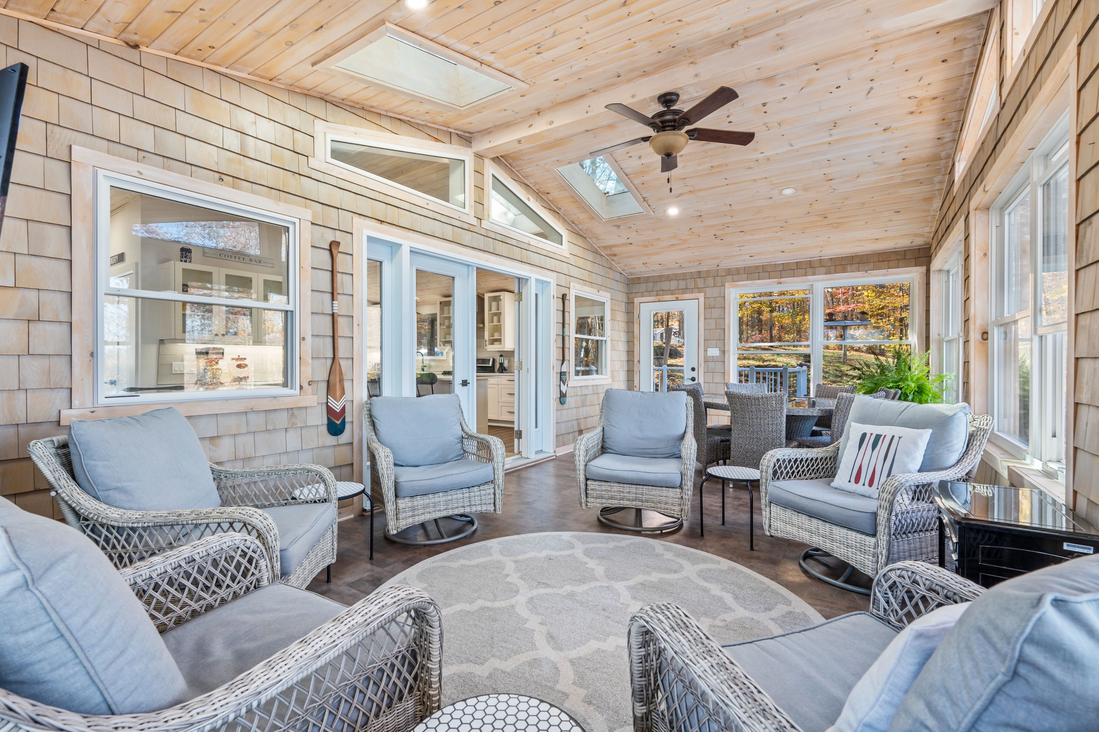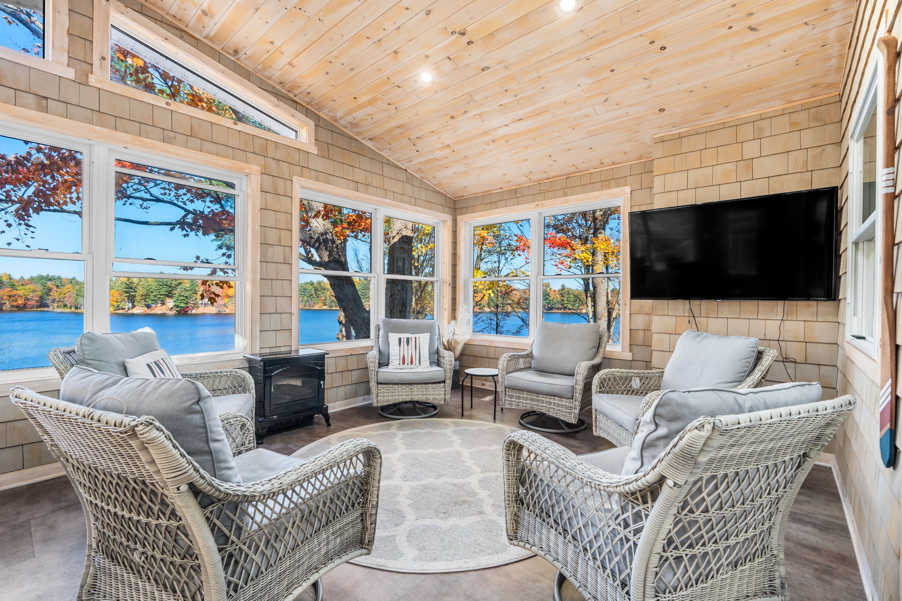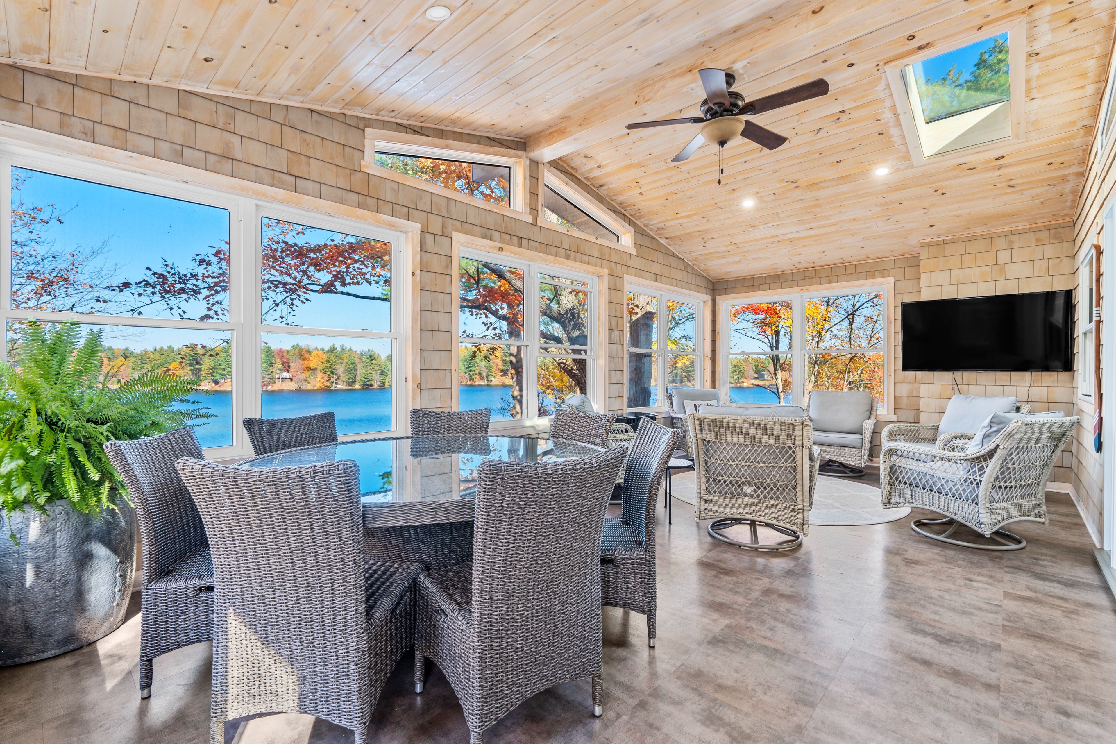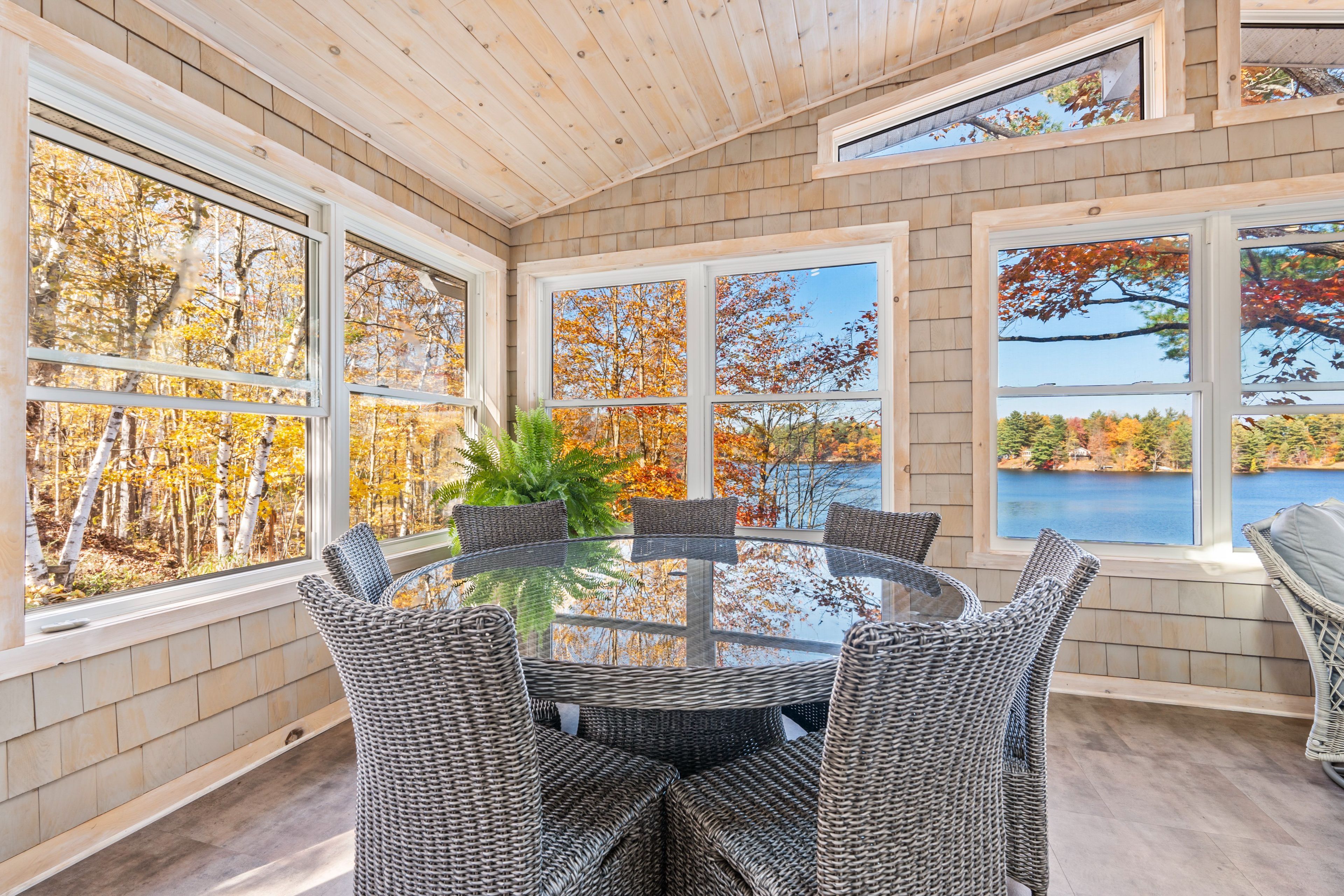 • Spacious sunroom with panoramic lake views and natural light.