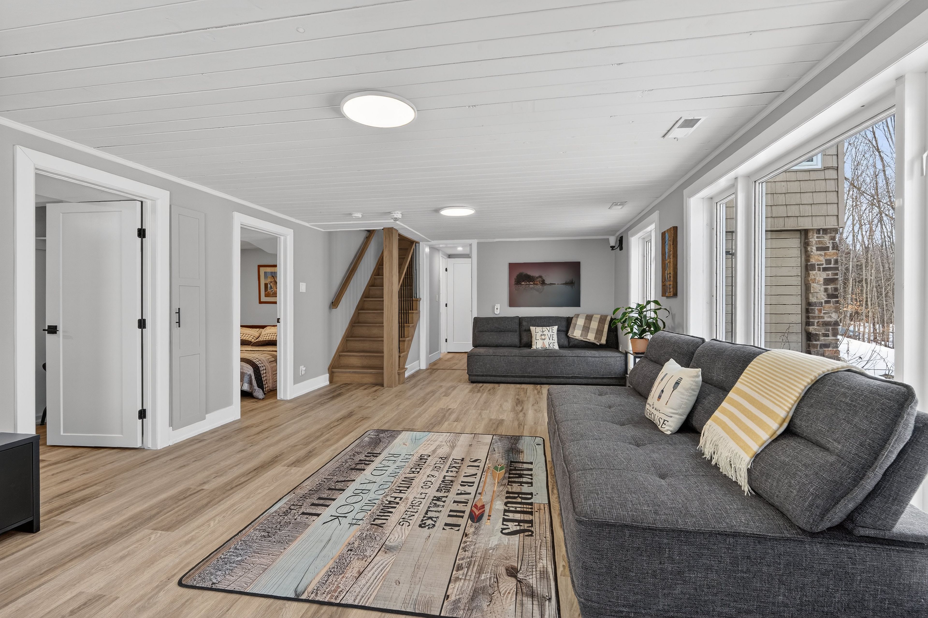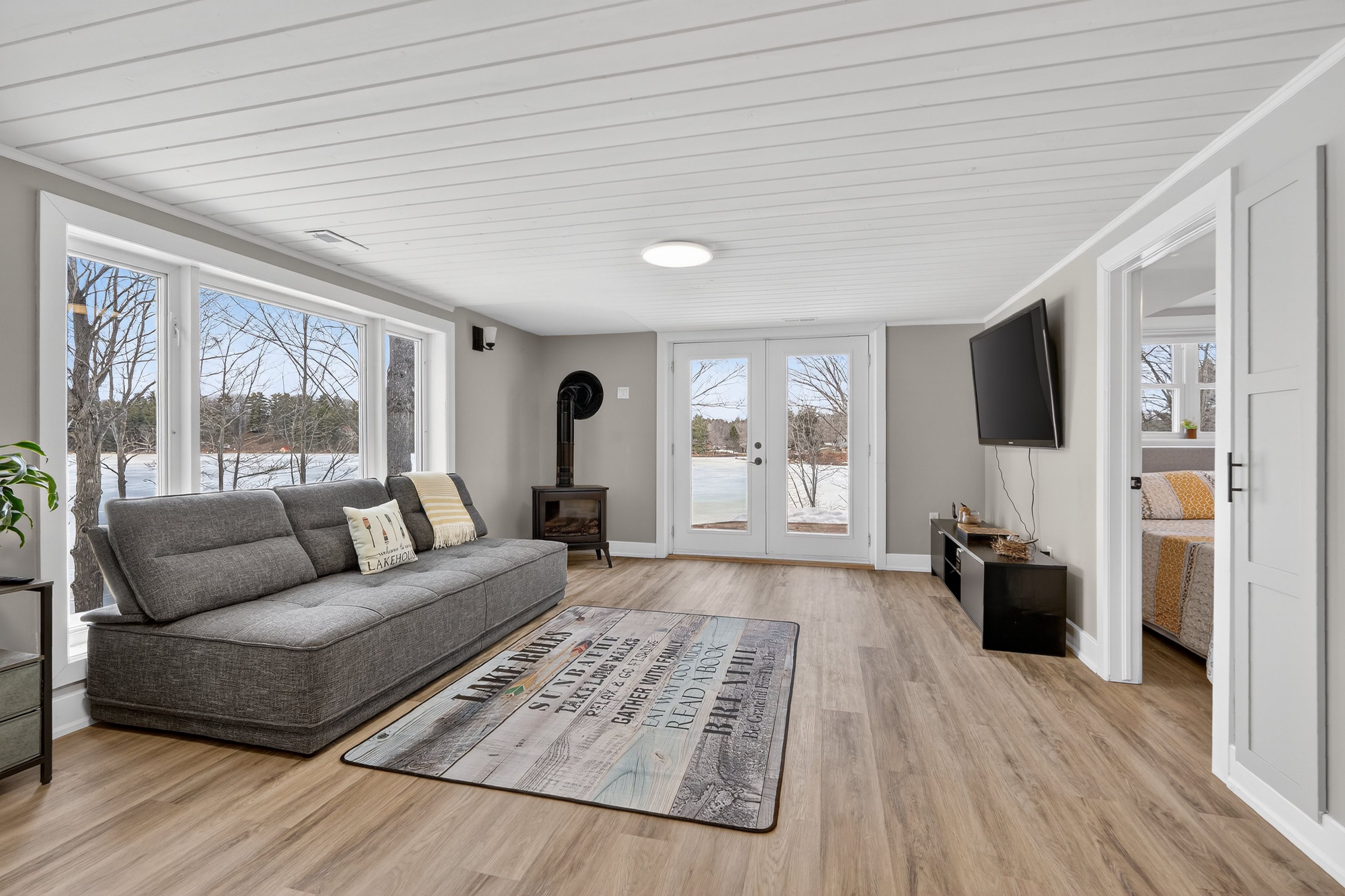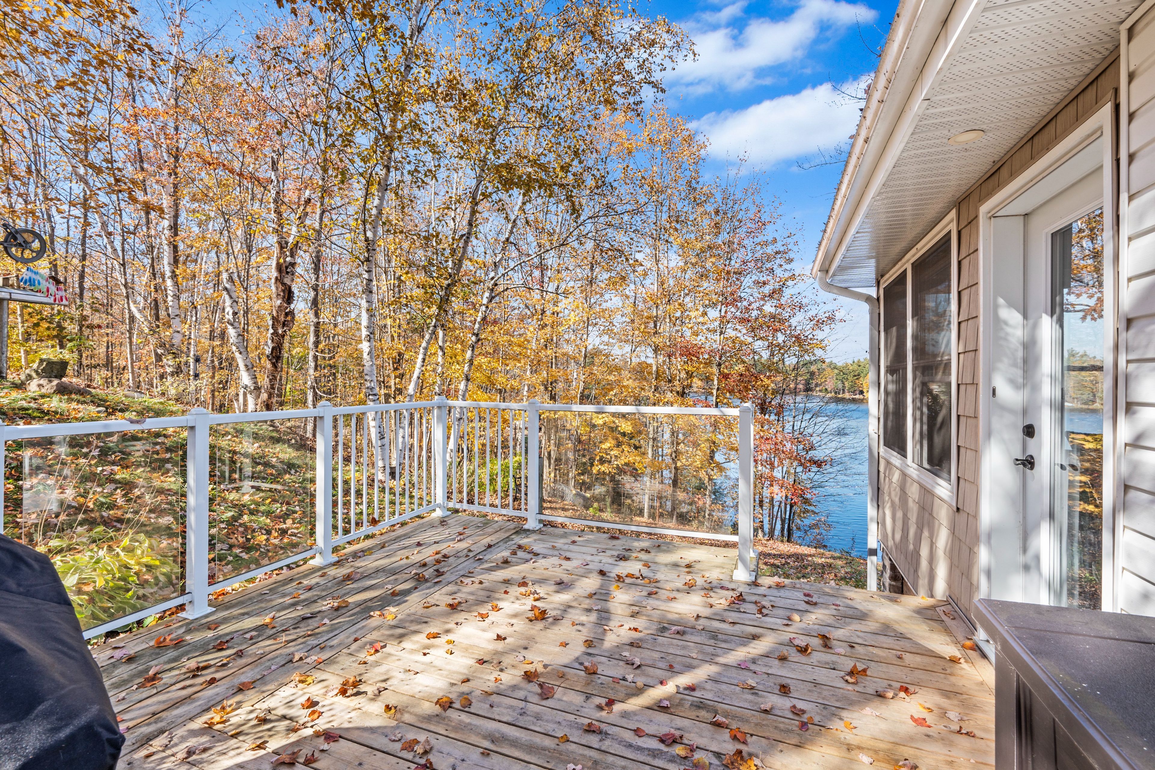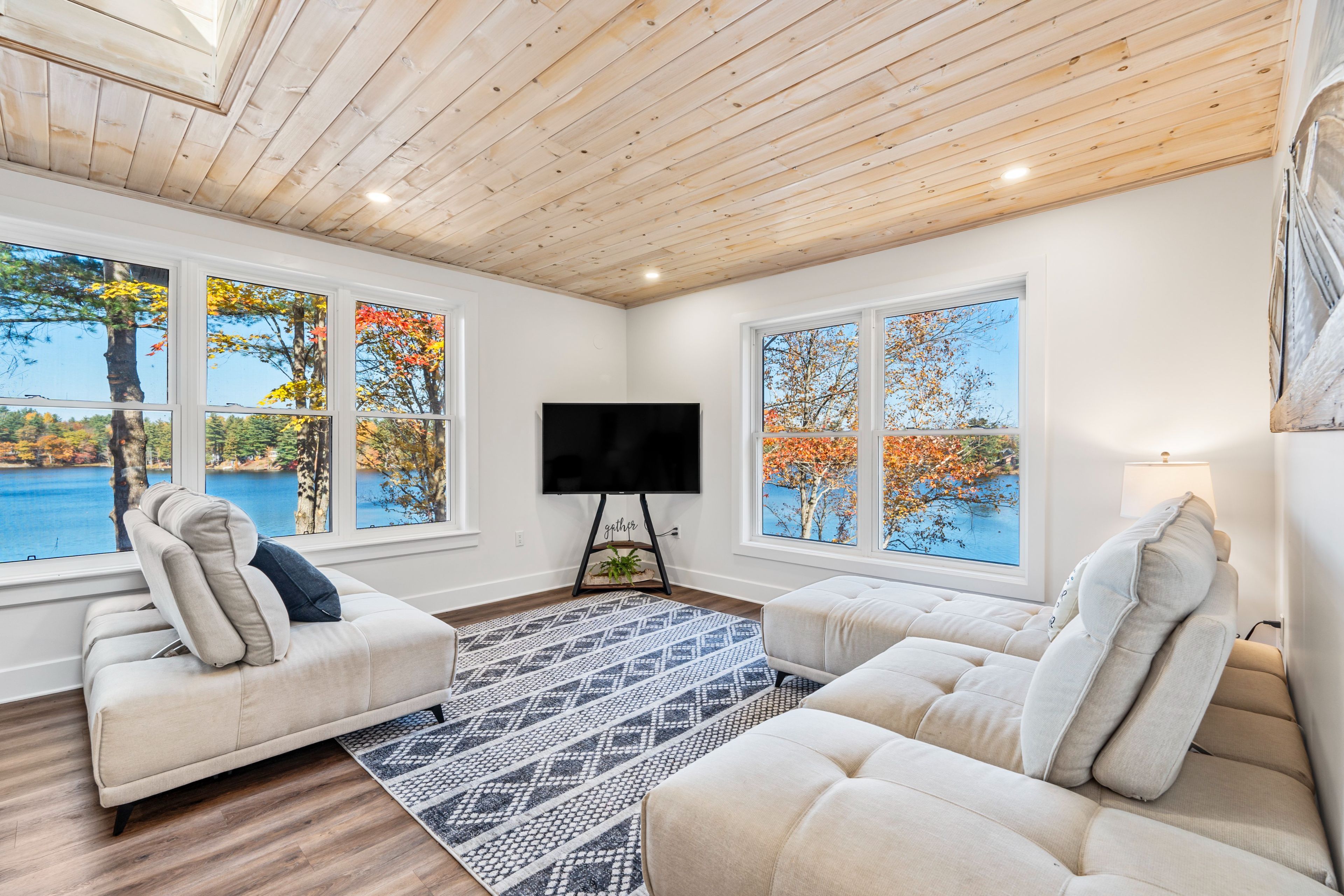 • Spacious sunroom with panoramic lake views and natural light.