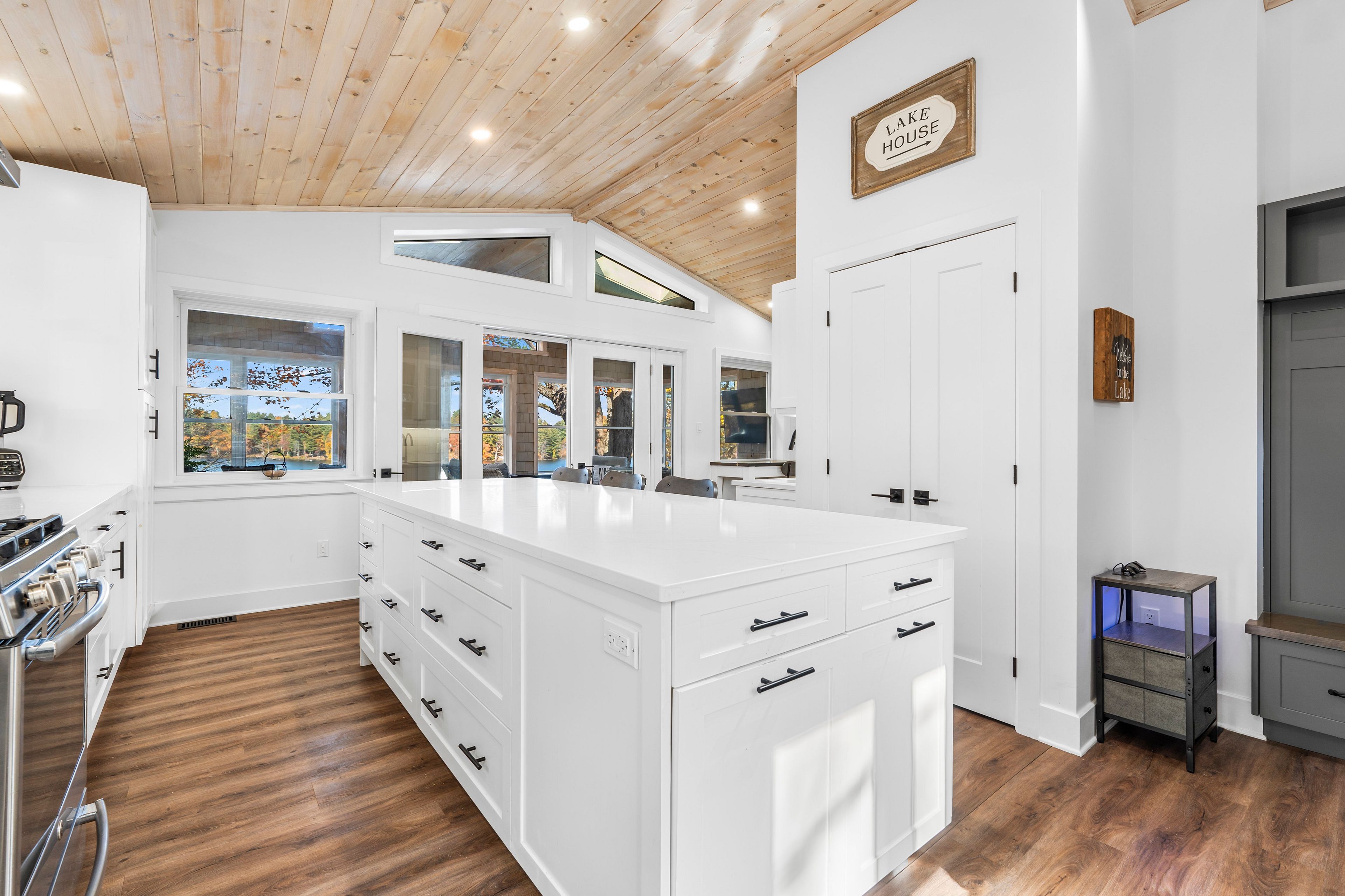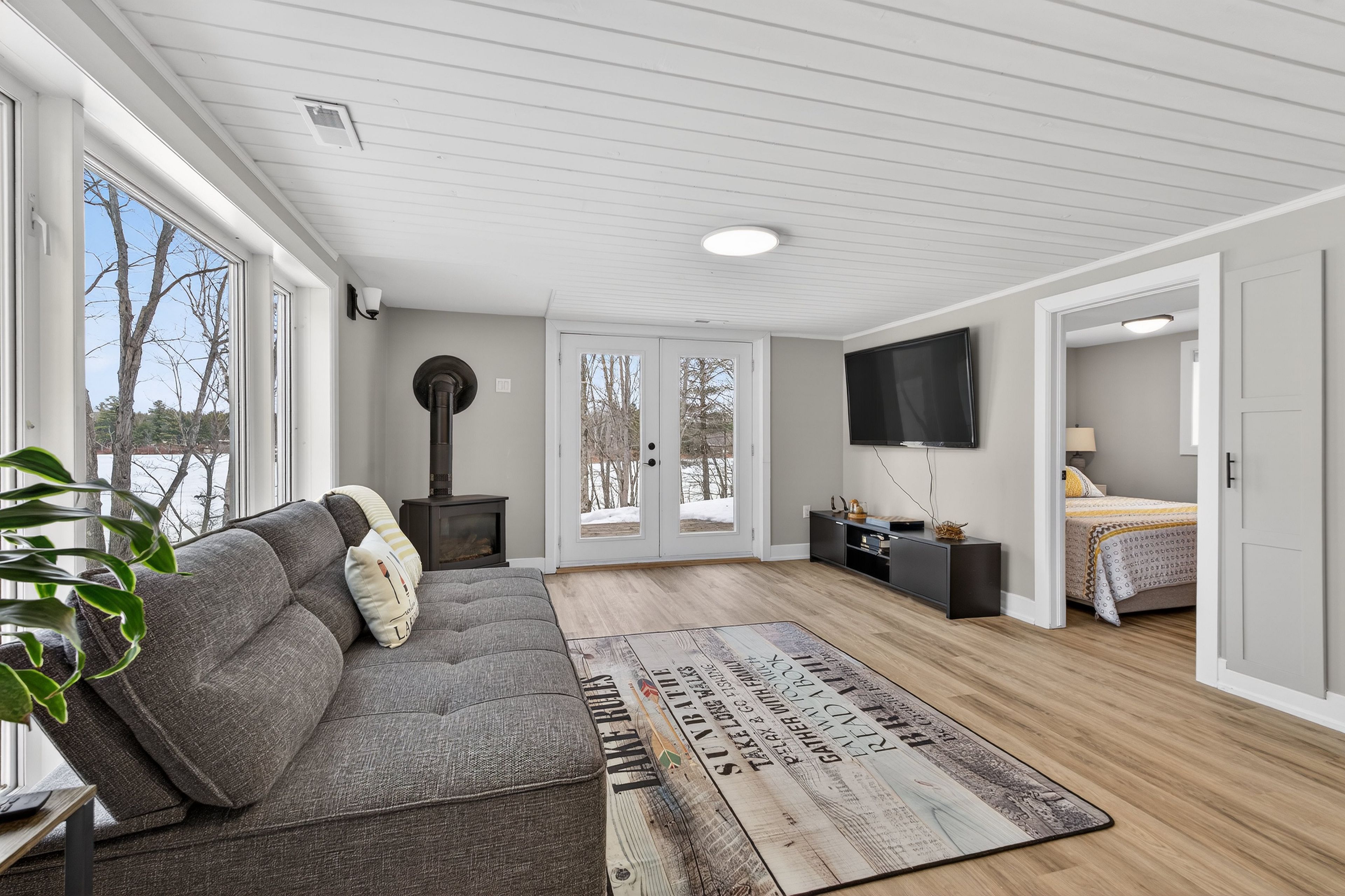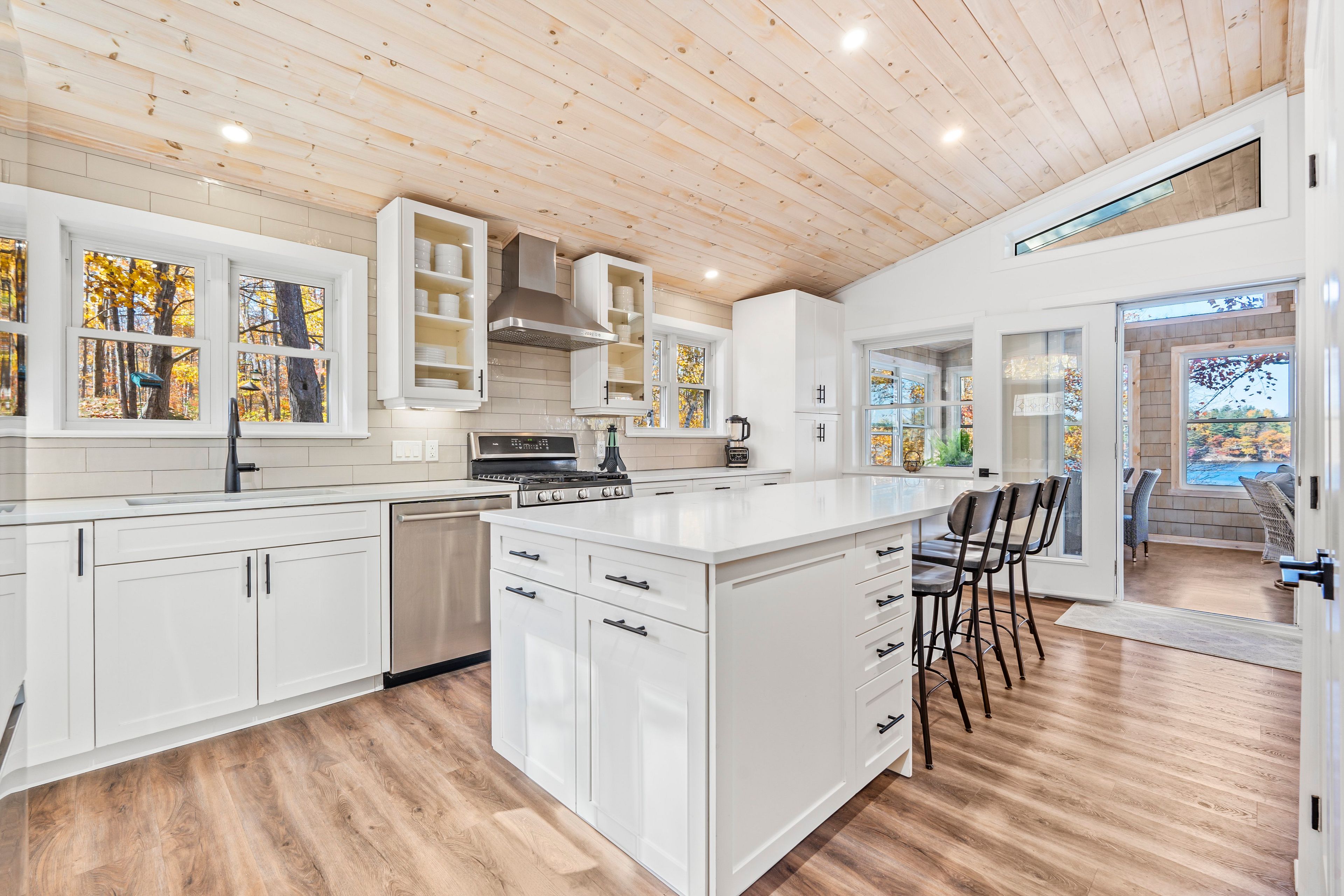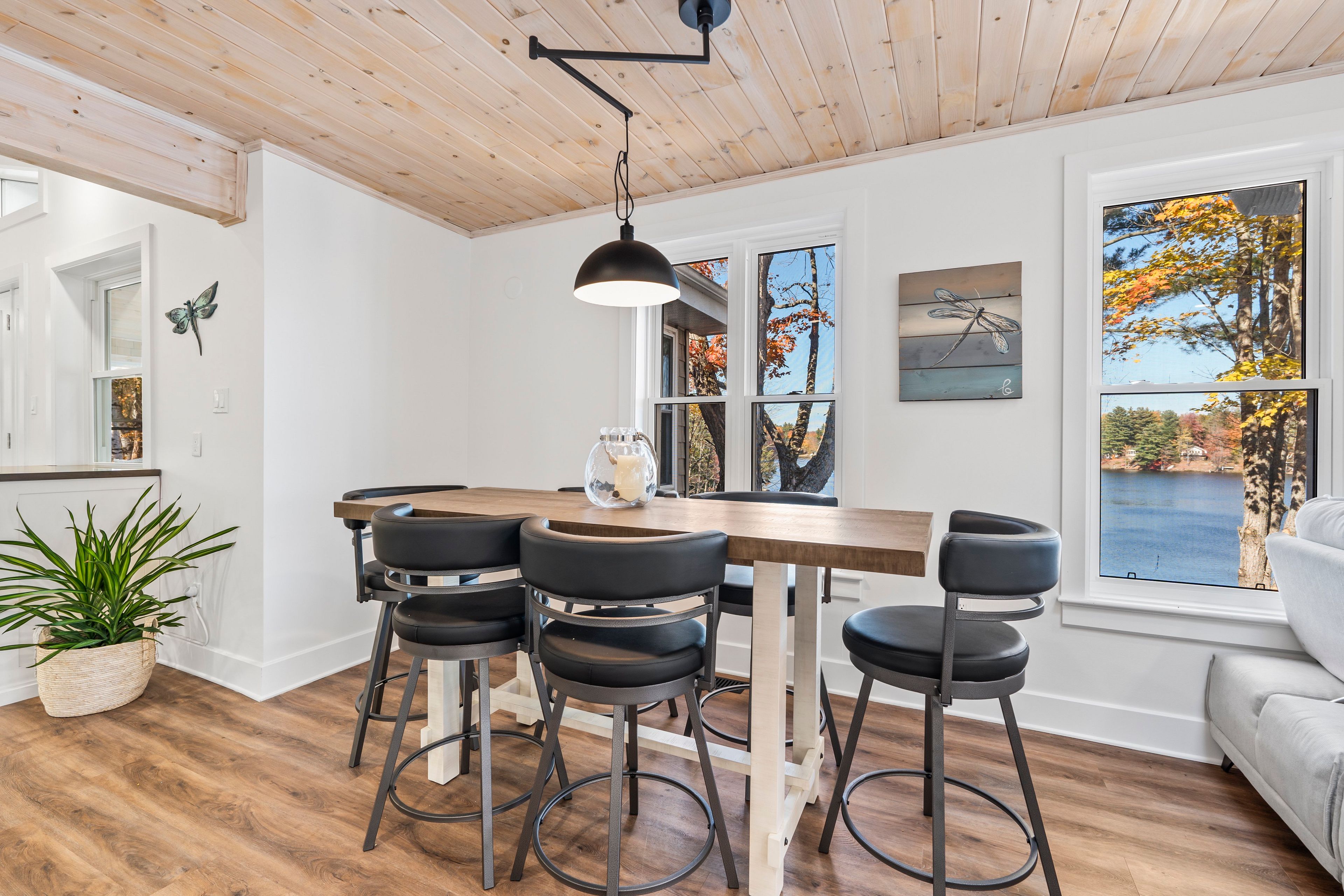 • Spacious sunroom with panoramic lake views and natural light.