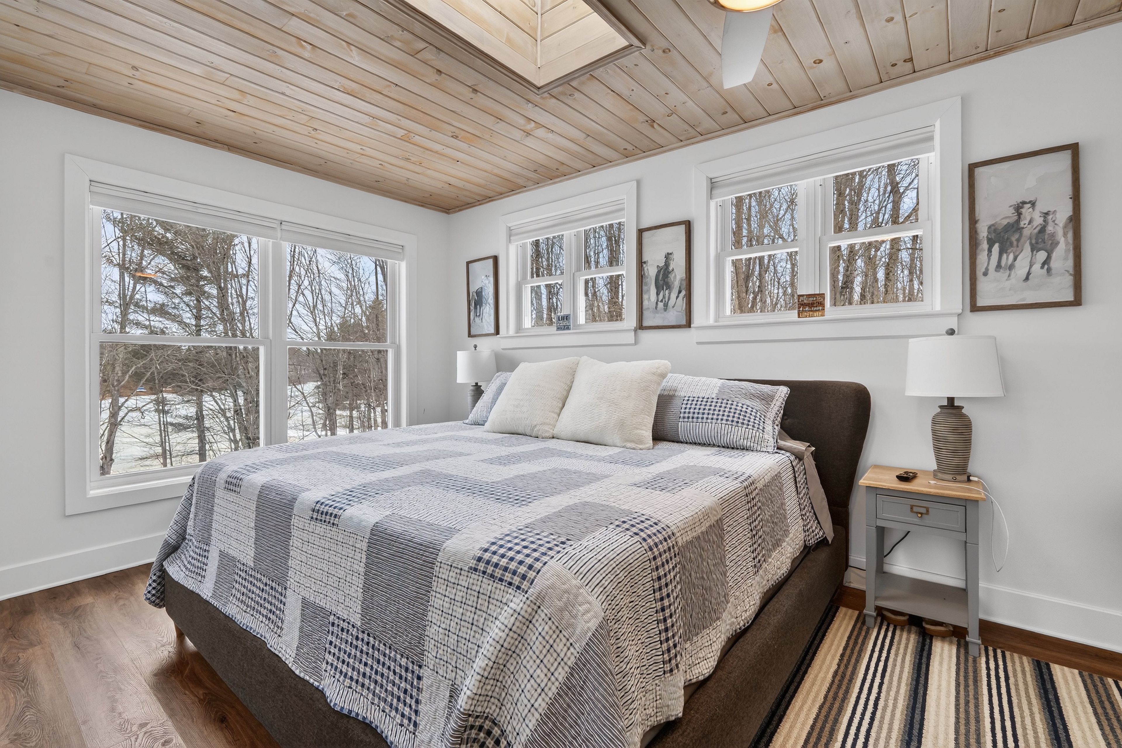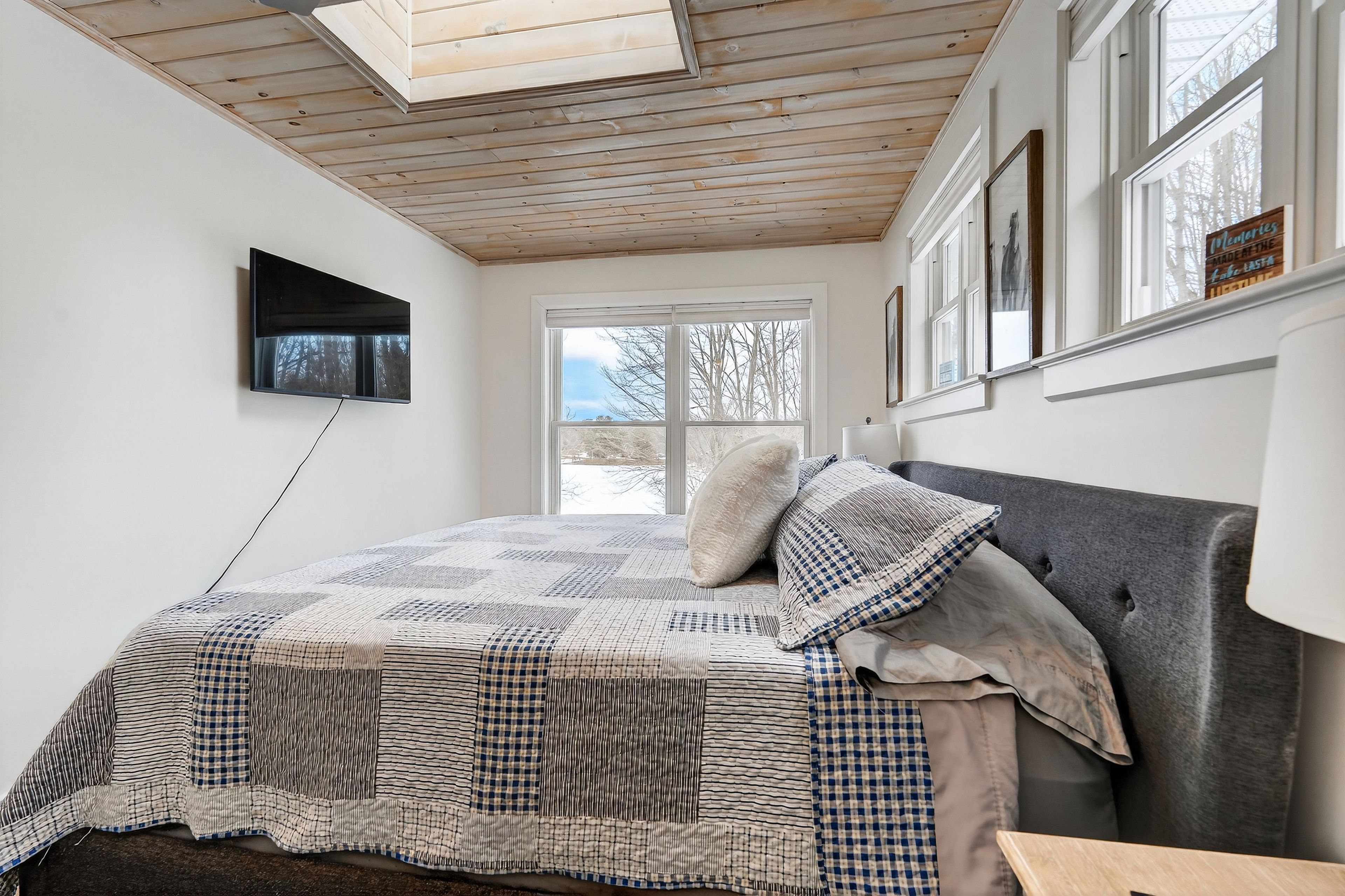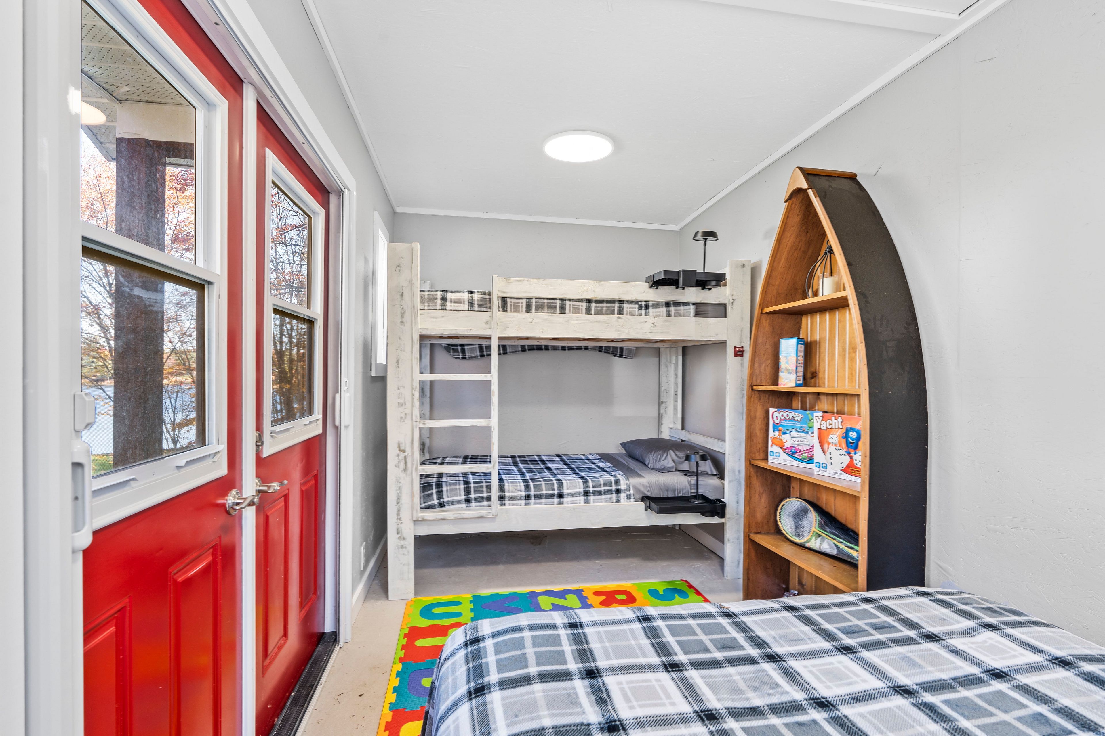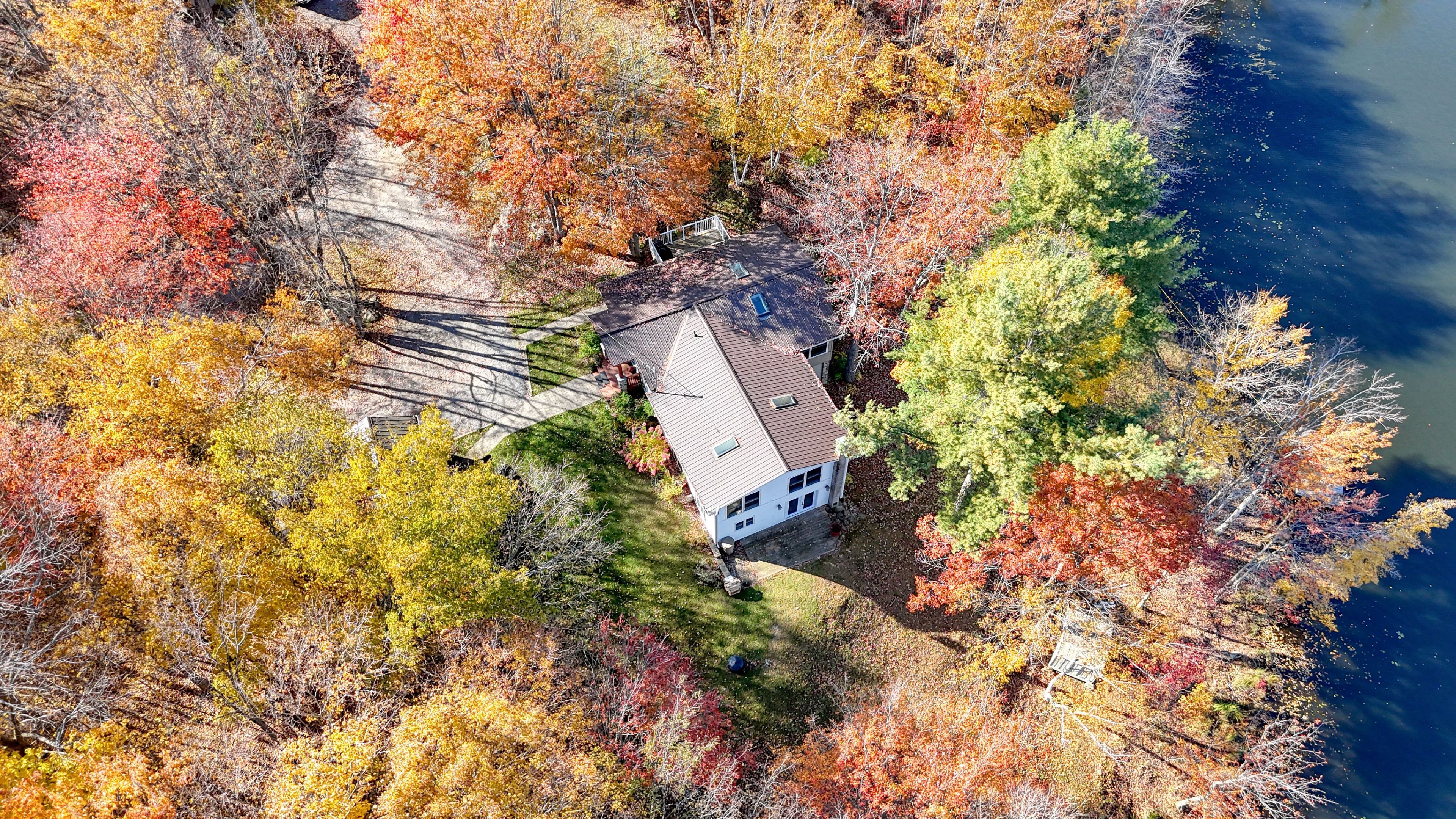 • Spacious sunroom with panoramic lake views and natural light.