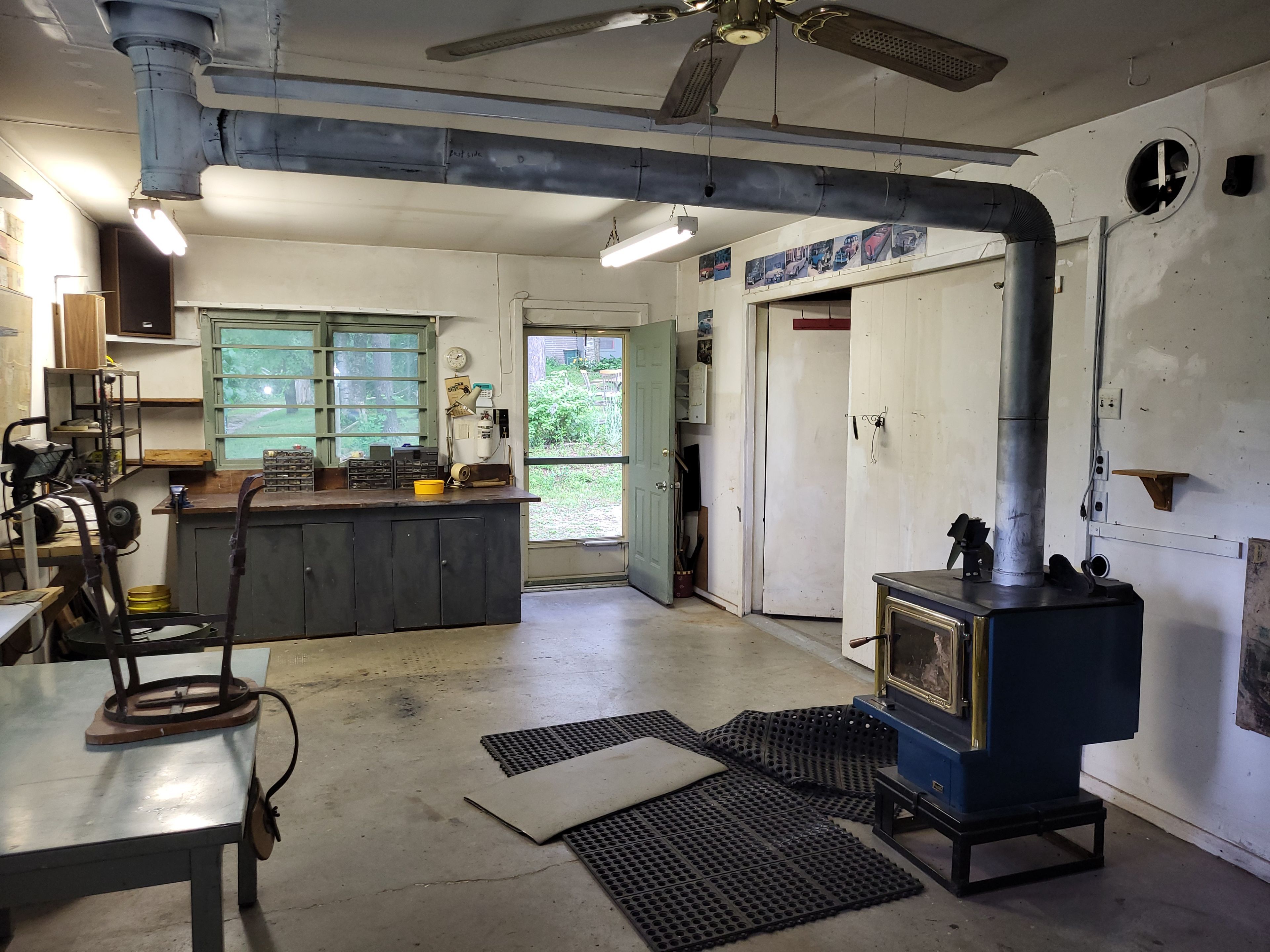 • Workshop features a full basement for additional storage or projects.