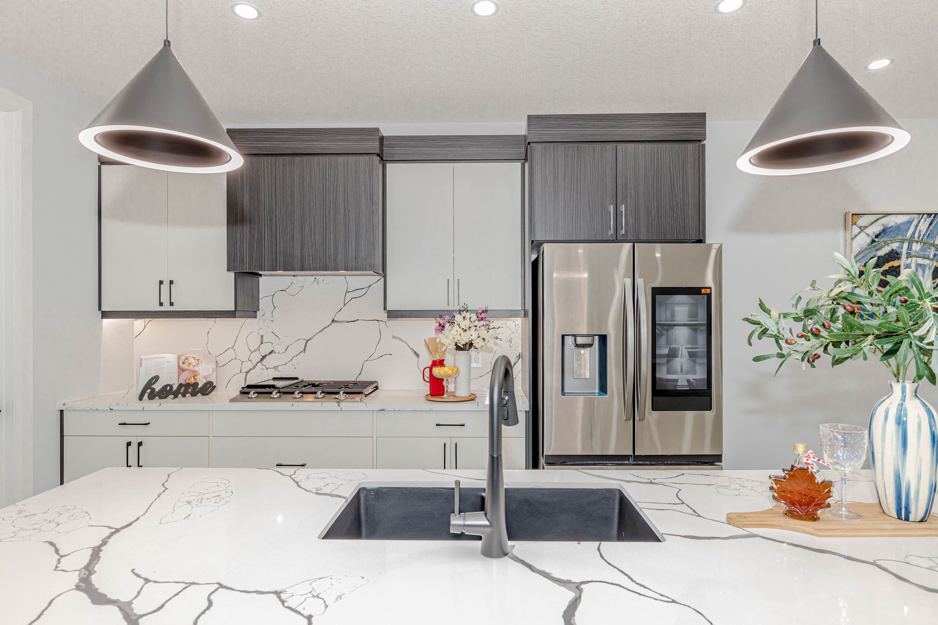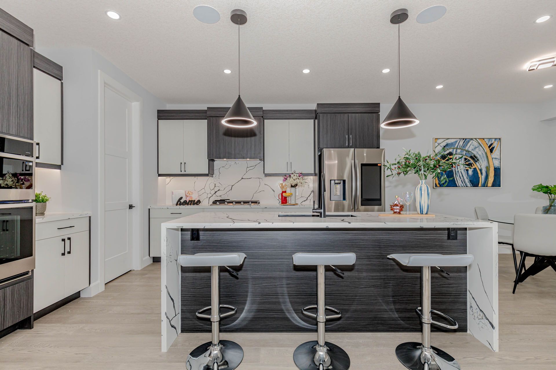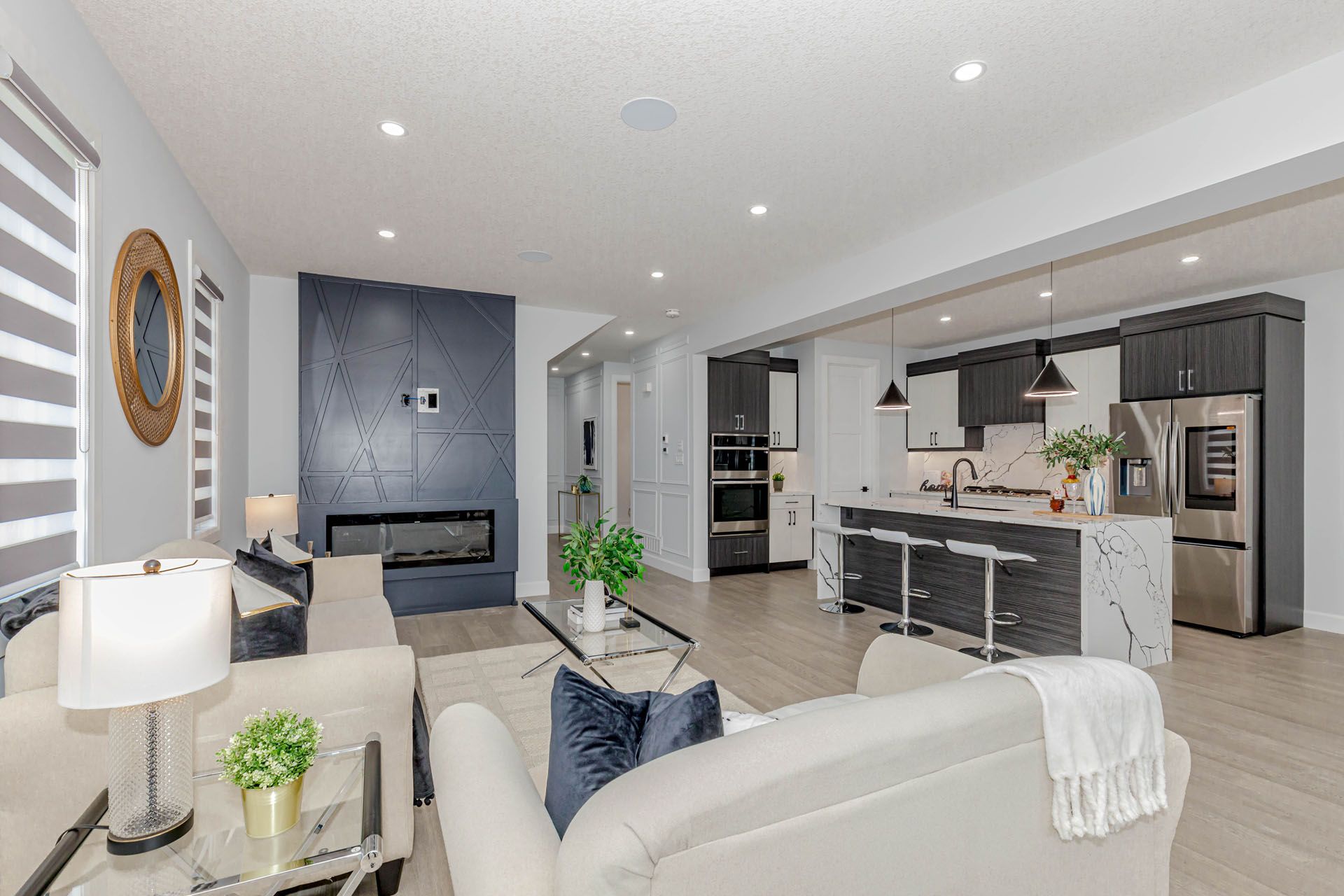 Luxurious 4-bedroom home with finished basement nearly 3,500 sq ft of elegant living space! Featuring premium upgrades throughout for a truly upscale lifestyle stunning home offers an impressive 2-car garage and concrete driveway with no sidewalk, providing 6 car parking. The upgraded exterior elevation features brick, stucco, and siding finished with stucco, offering a sleek and modern curb appeal. Double door entry with a multipoint locking system into a grand open-to-above foyer, enhanced with accent walls on both the main and second floors. The home boasts with engineered hardwood tiles in wet area, complemented by 9 ft ceilings and 8 ft doors with modern black hardware on the main floor. Designer touches such as elegant light fixtures, pot lights throughout, a spacious family room with an electric fireplace, and built-in speakers perfect for entertaining. The chefs dream kitchen features an oversized island with waterfall quartz countertops, upgraded sink and fixtures, built-in appliances, gas cooktop, soft-close drawers, and a walk-in pantry for optimal storage. The upgraded powder room and a large mudroom provide convenience and functionality. Step out to your 12x8 ft covered deck, ideal for year-round outdoor enjoyment. Upstairs, the luxurious primary suite includes a 5-piece upgraded ensuite with a glass shower, large walk-in closet, and a 10x6 ft balcony with glass railing and aluminum siding. Two generously sized bedrooms share a 5-piece jack & jill bath, while a second master bedroom offers its own 4-piece ensuite and walk-in closet. The laundry room is conveniently located on the upper level and includes a tub and linen closet. The finished lookout basement features a separate side entrance, 5 large egress windows, and a 4-piece bathroom and large open living space. Additionally200 amp electrical panel, security system with 2 exterior cameras . This home seamlessly combines function, style, and comfort, with no detail overlooked. A must see!!