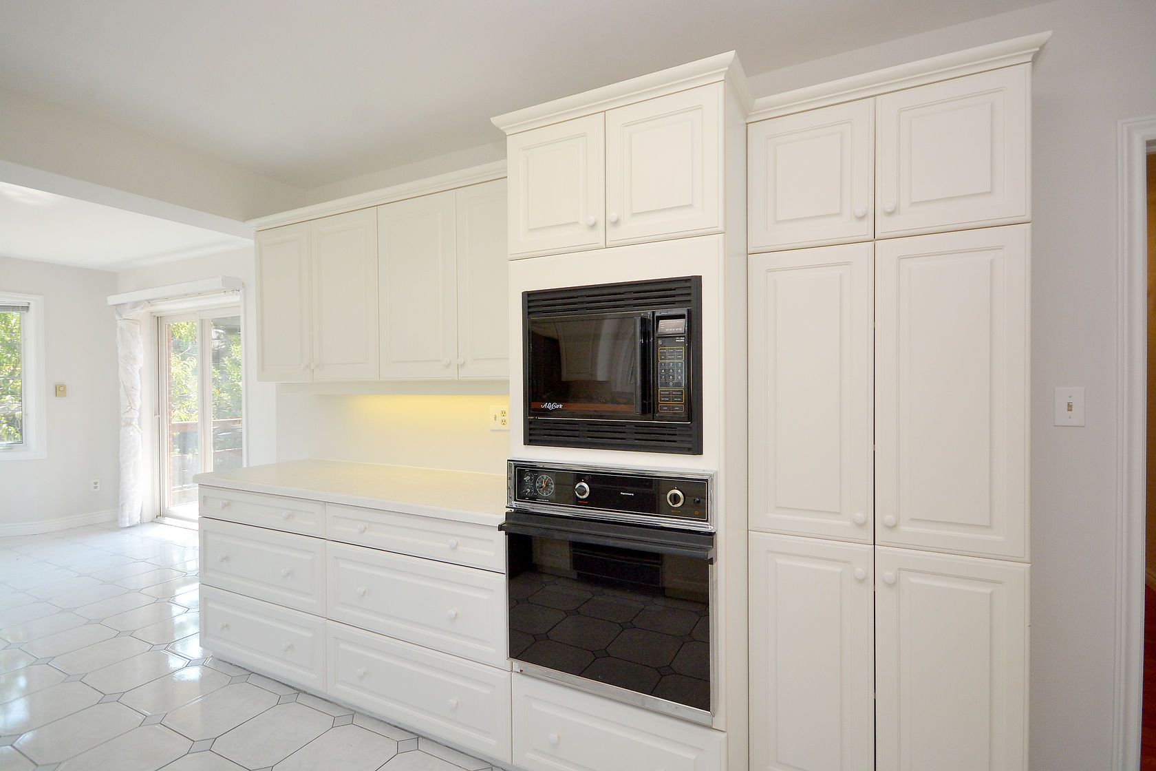 • Kitchen equipped with built-in appliances and breakfast area with deck access.