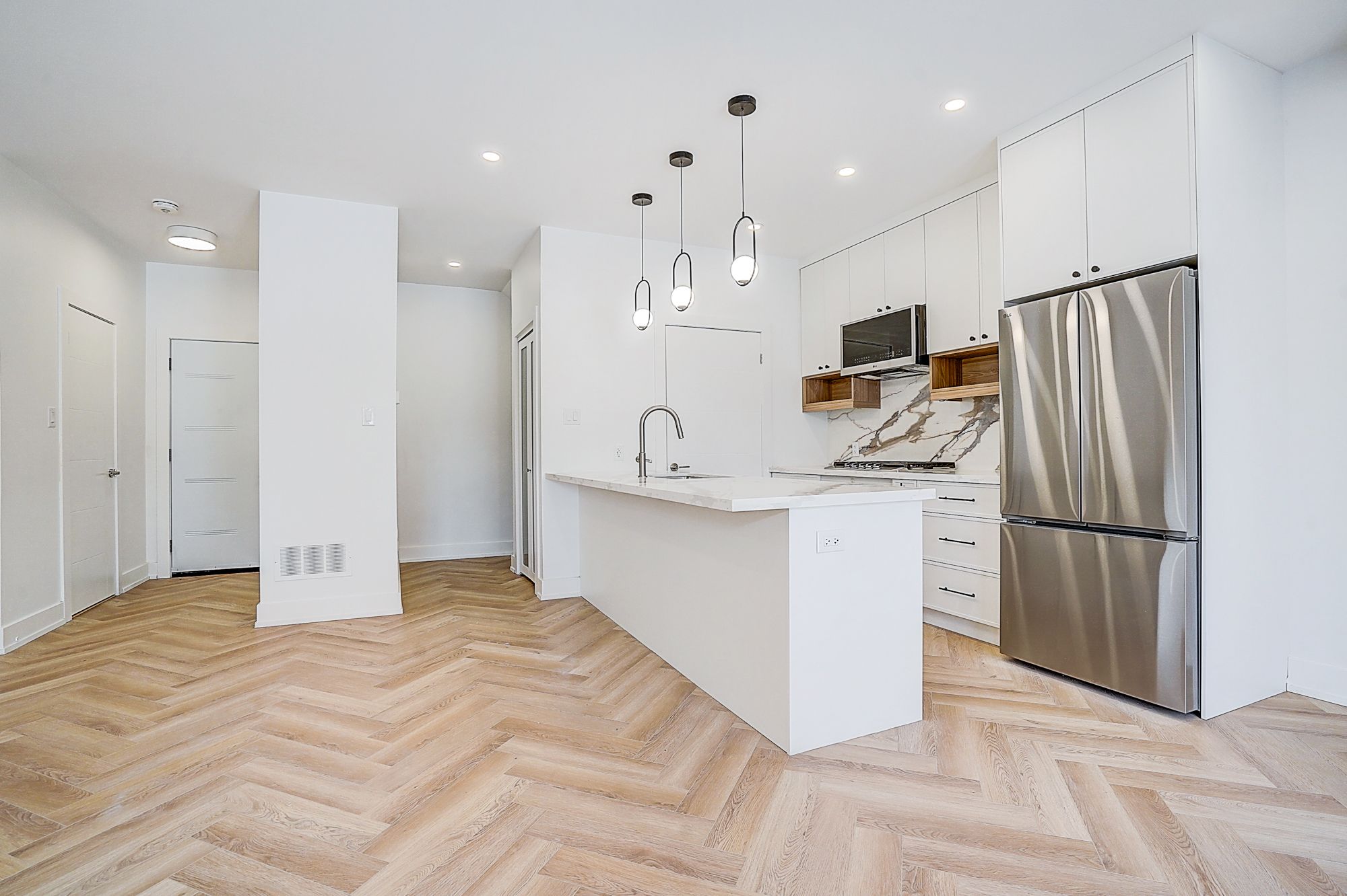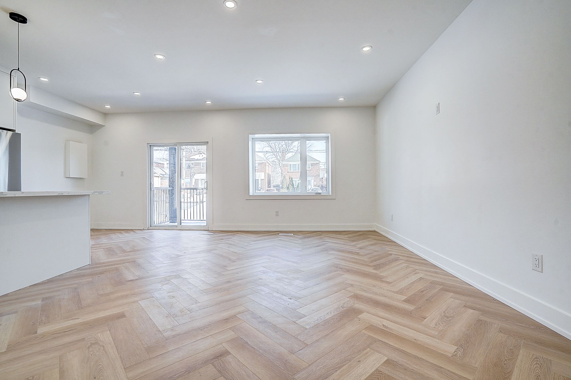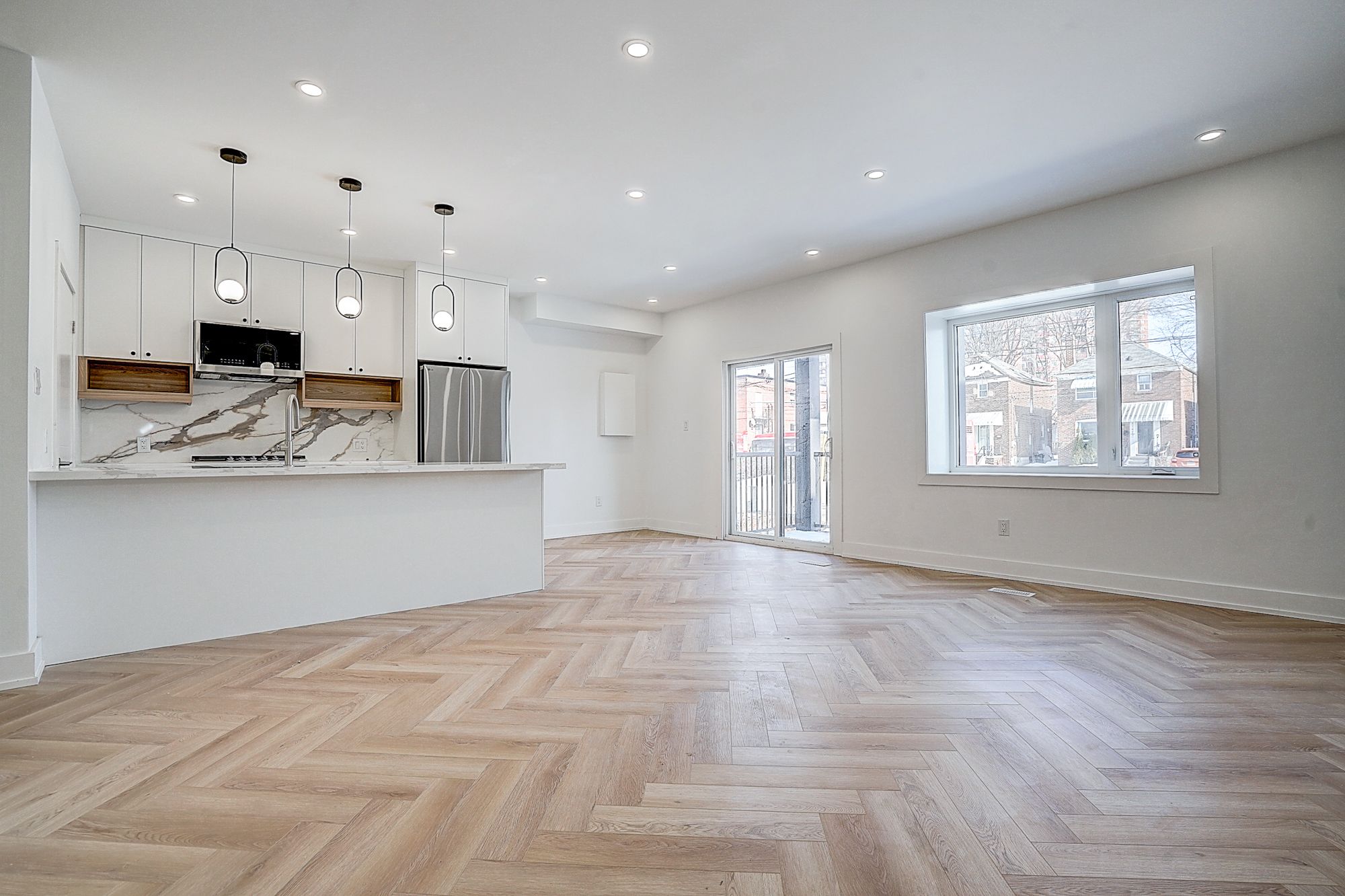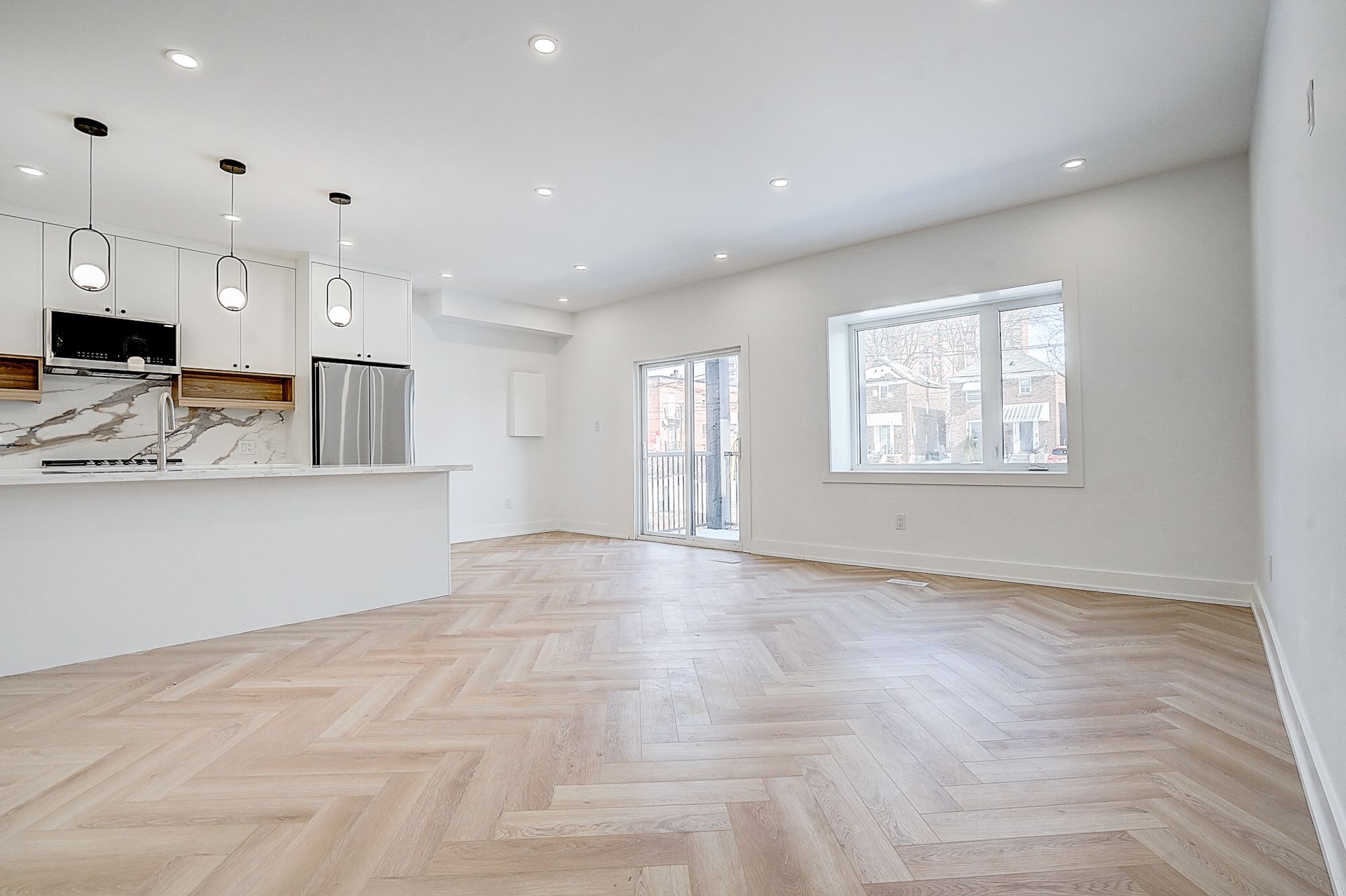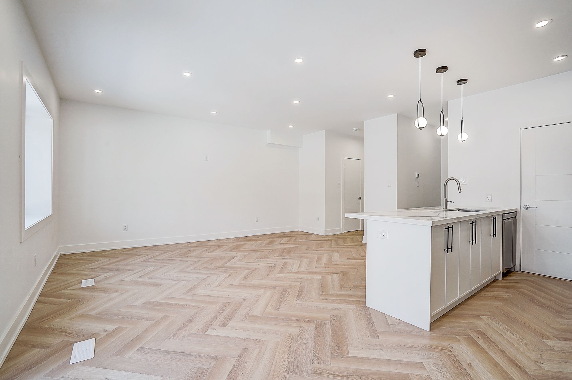• Spacious open-concept living/dining/kitchen with herringbone flooring.
