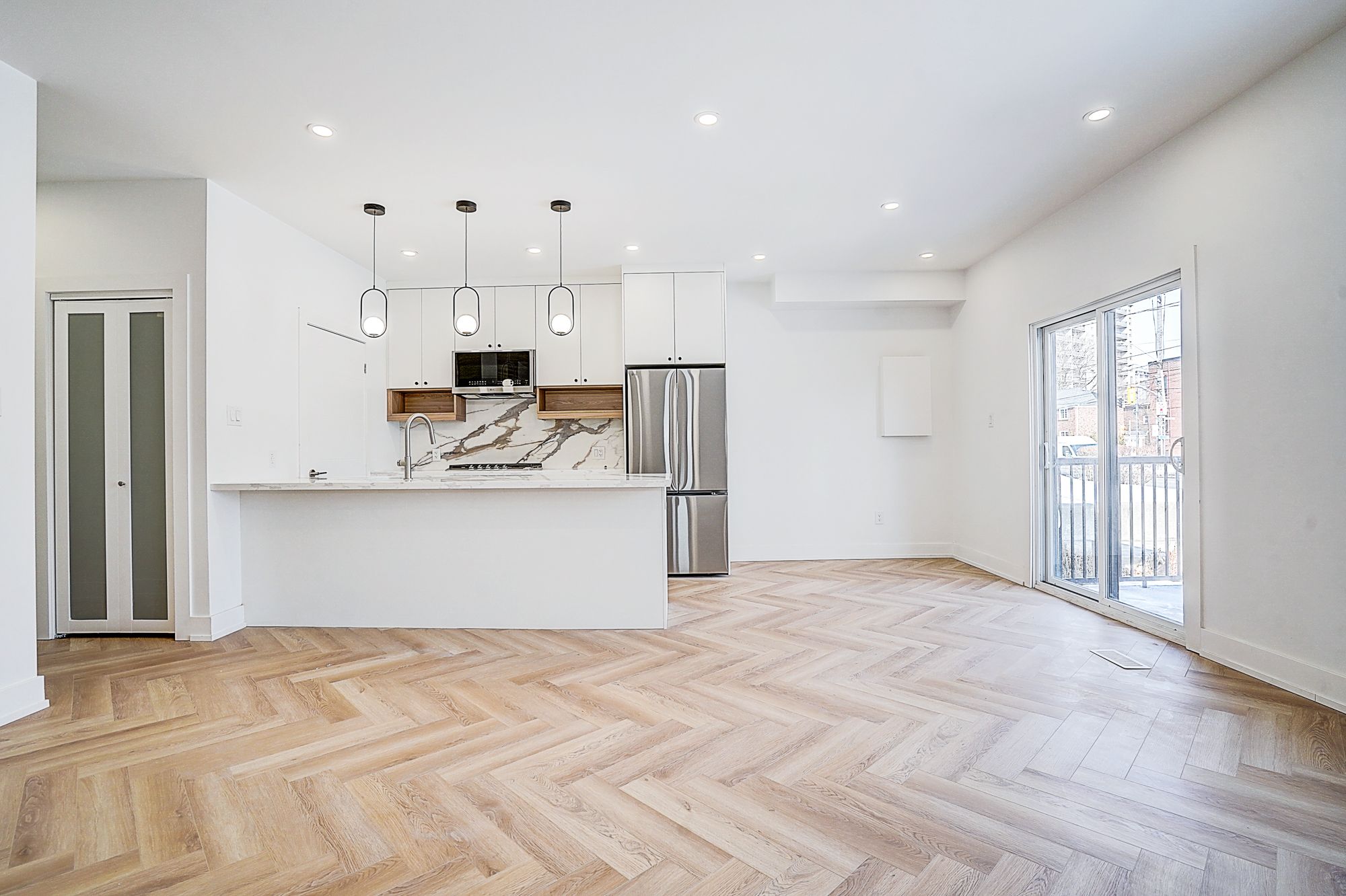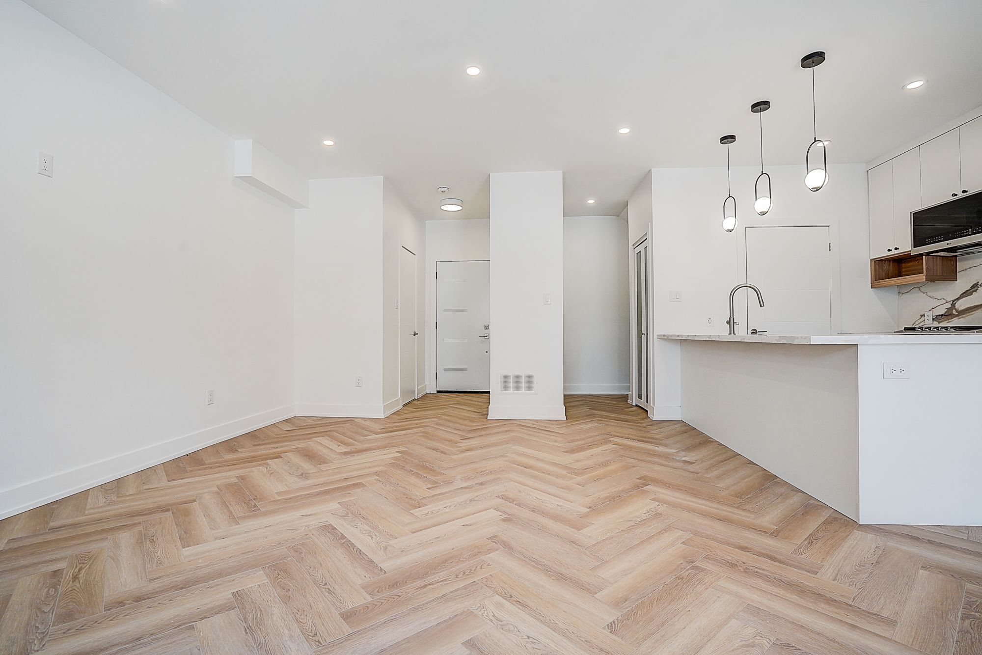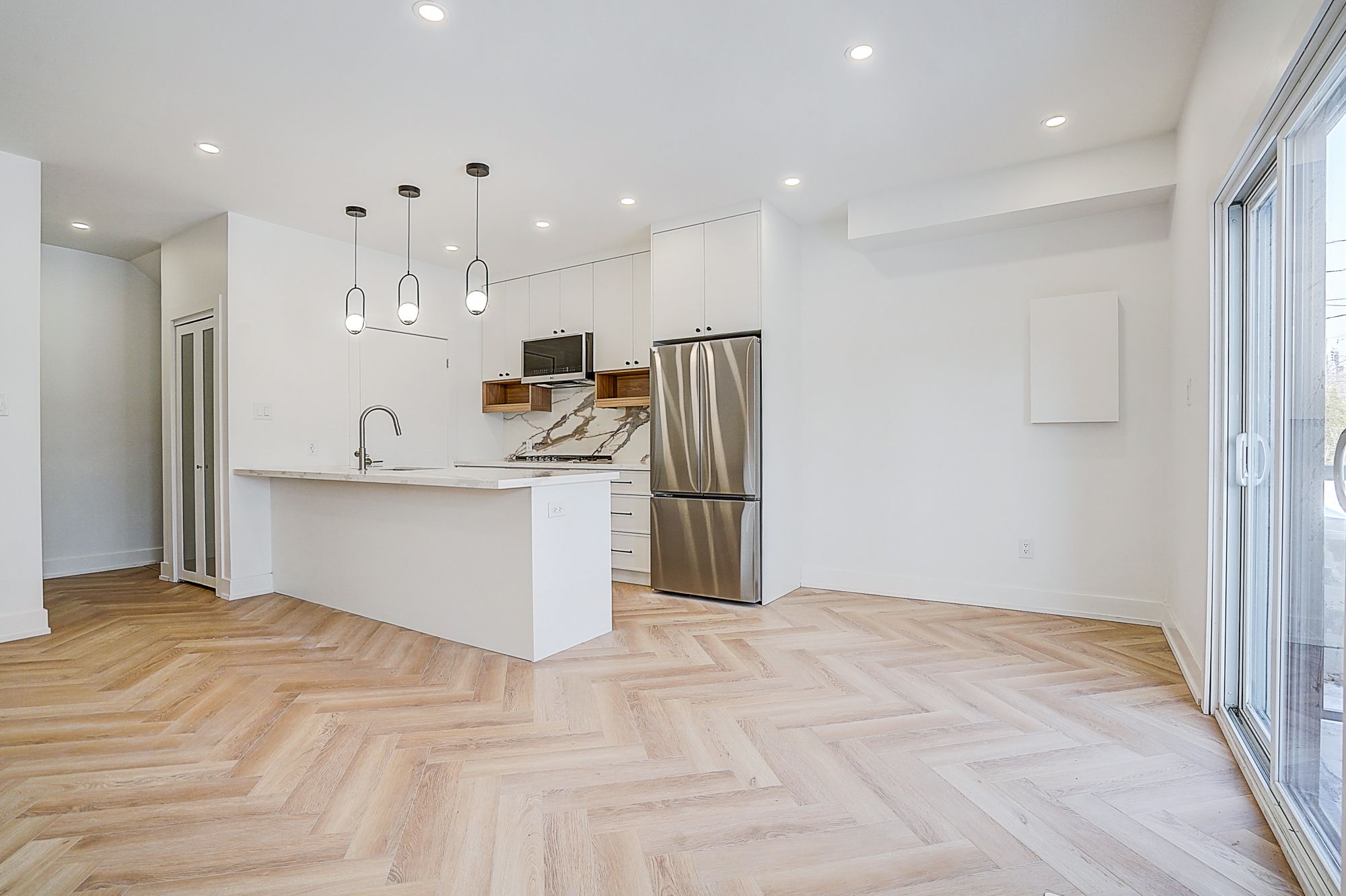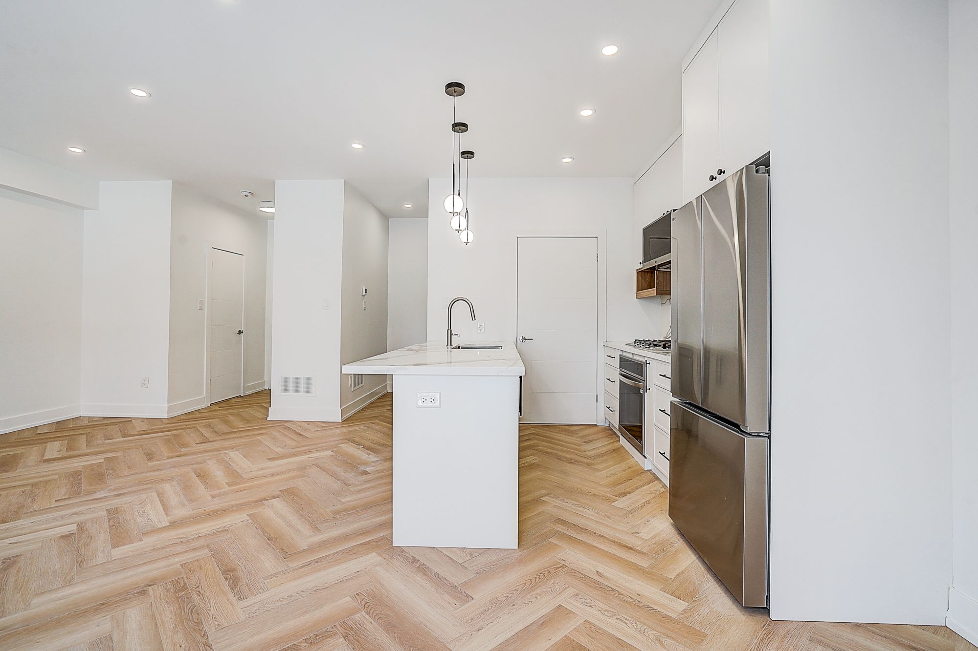 • Spacious open-concept living/dining/kitchen with herringbone flooring.