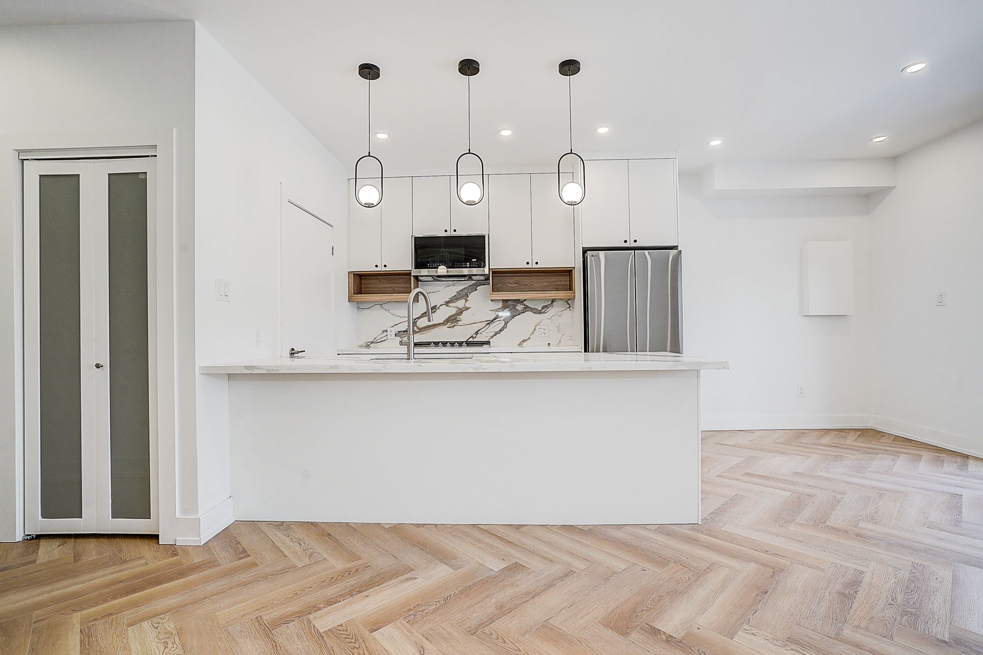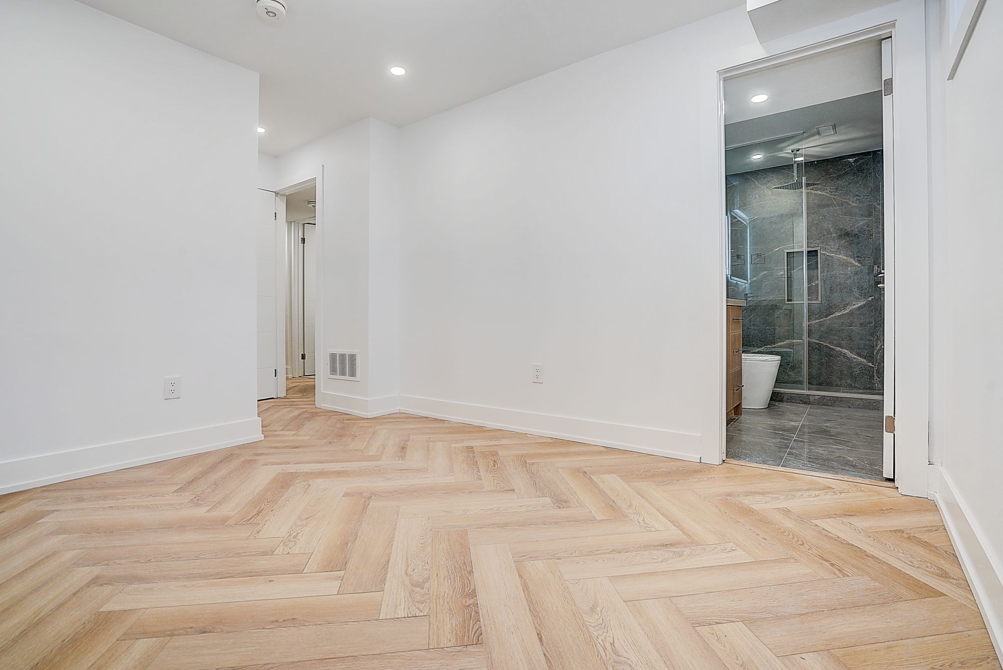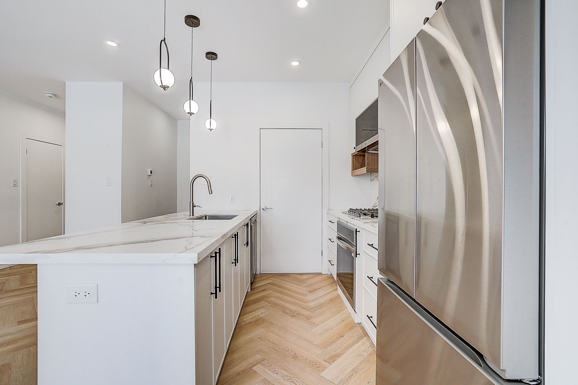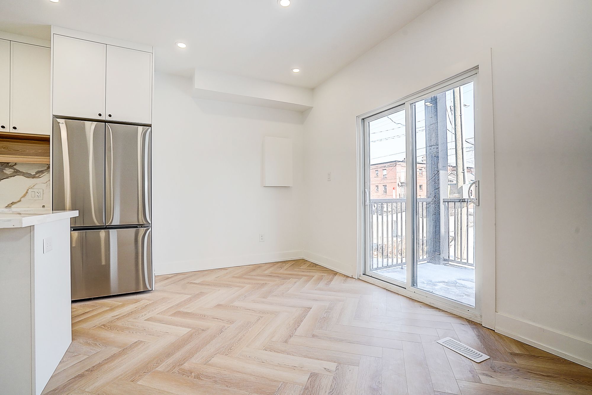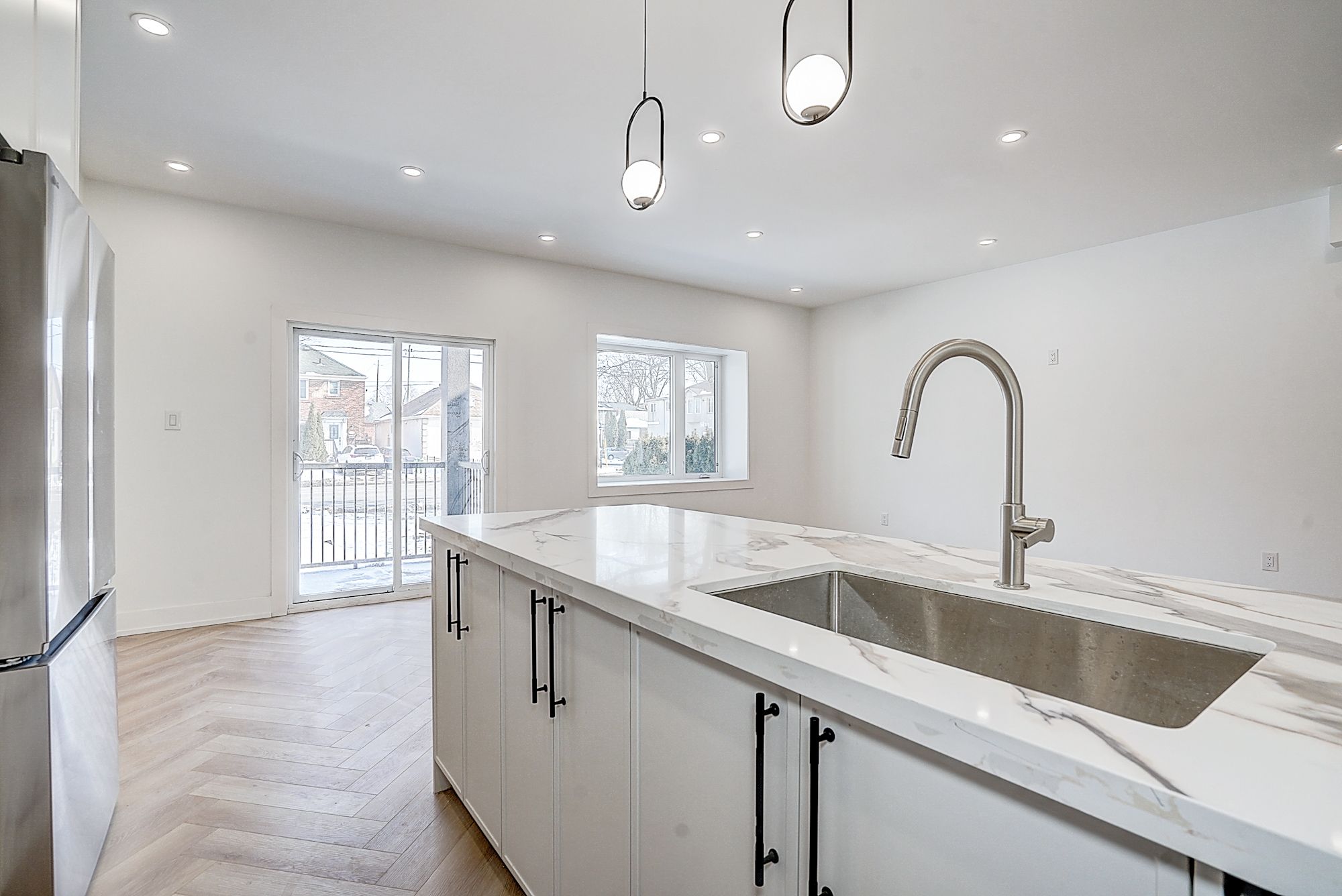• Spacious open-concept living/dining/kitchen with herringbone flooring.