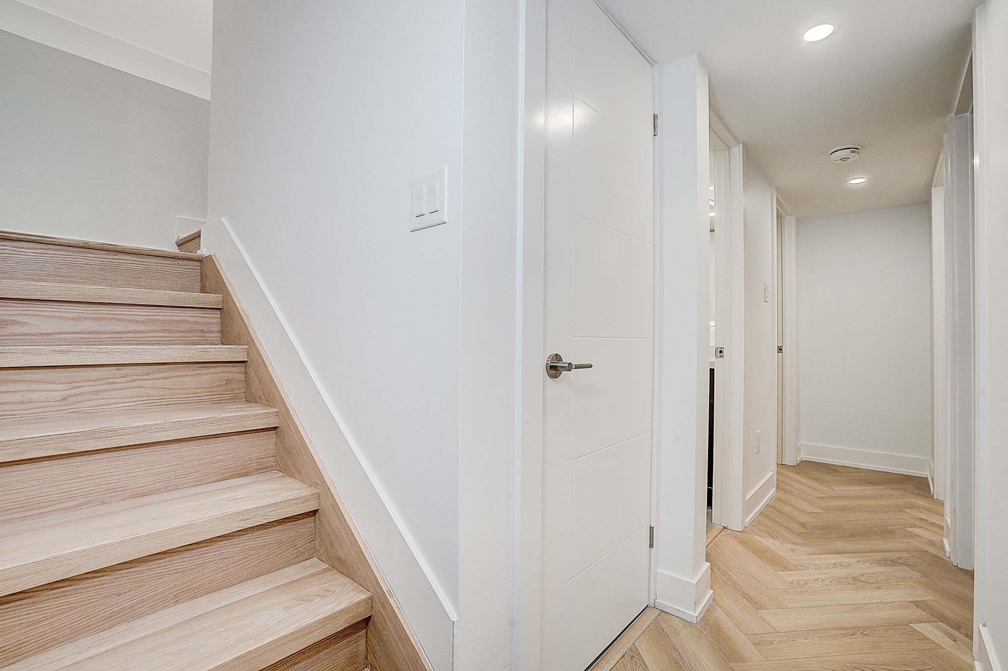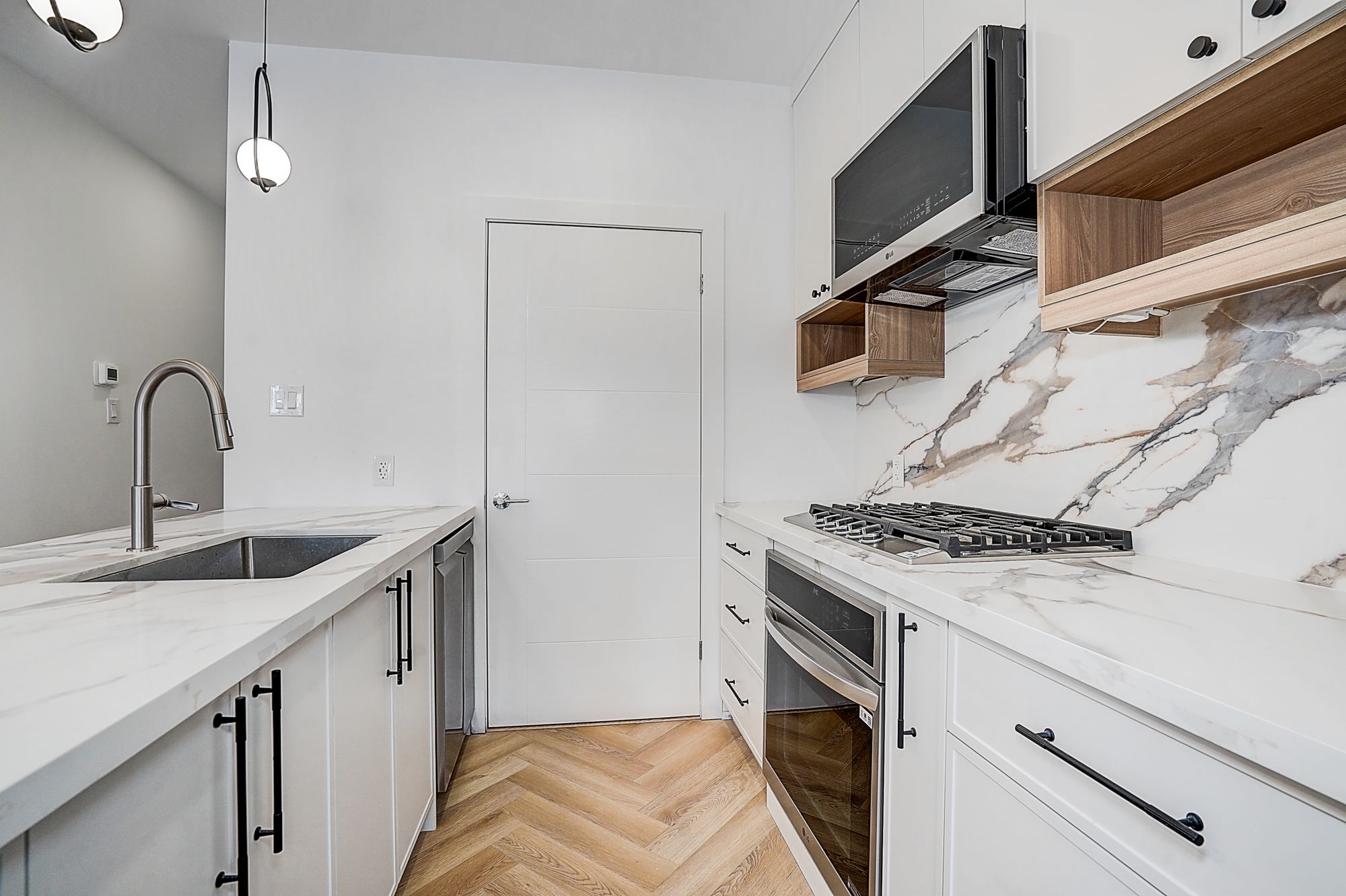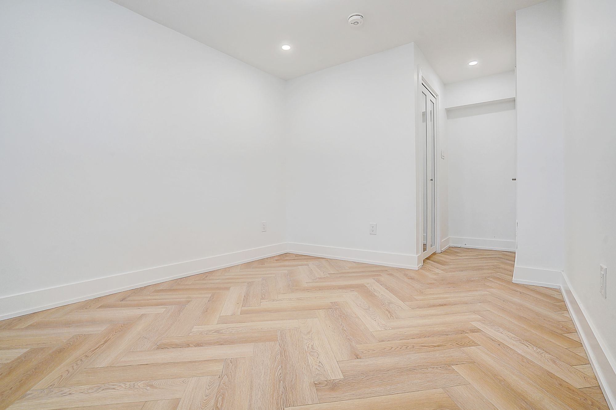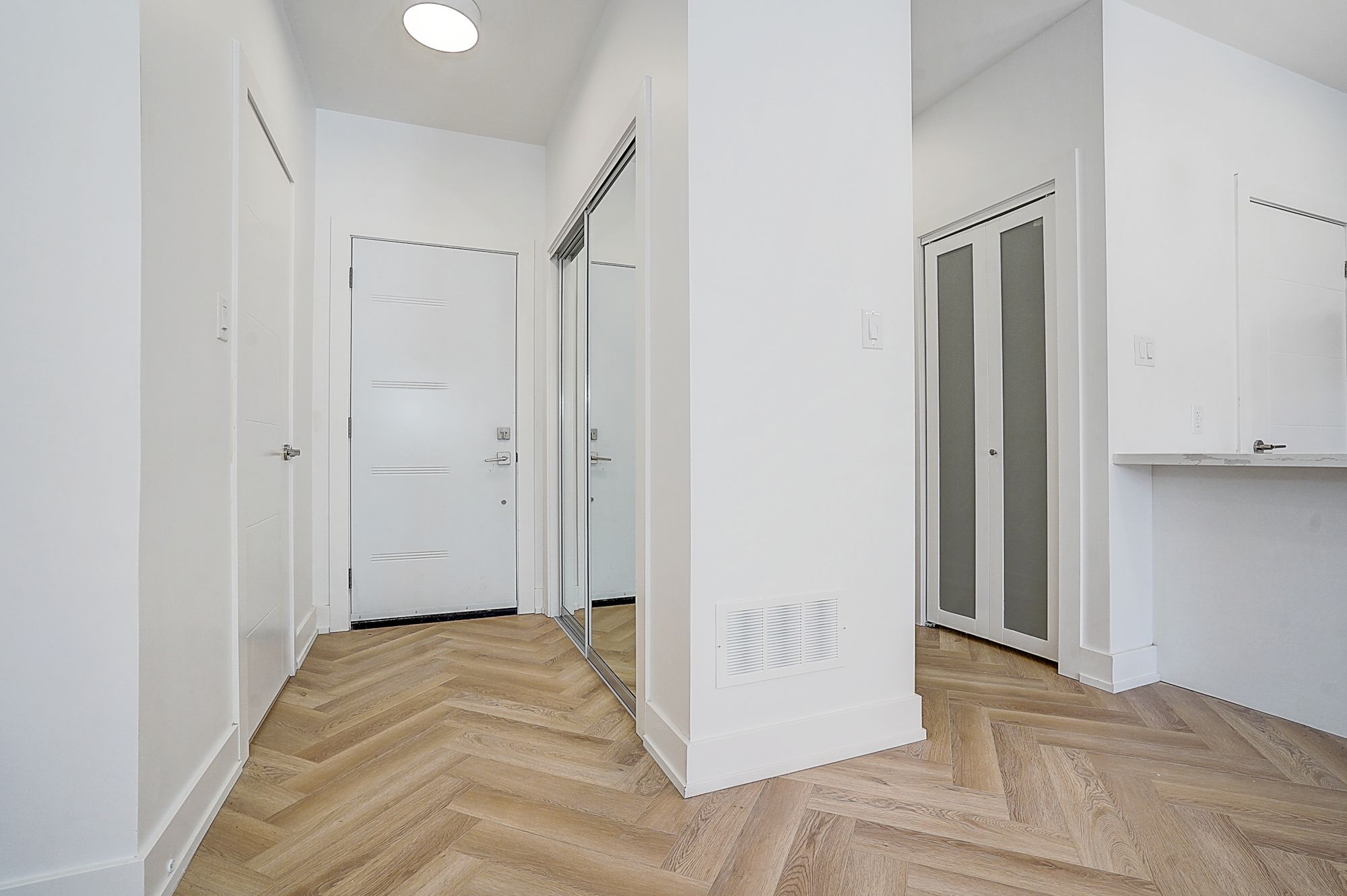 • Spacious open-concept living/dining/kitchen with herringbone flooring.